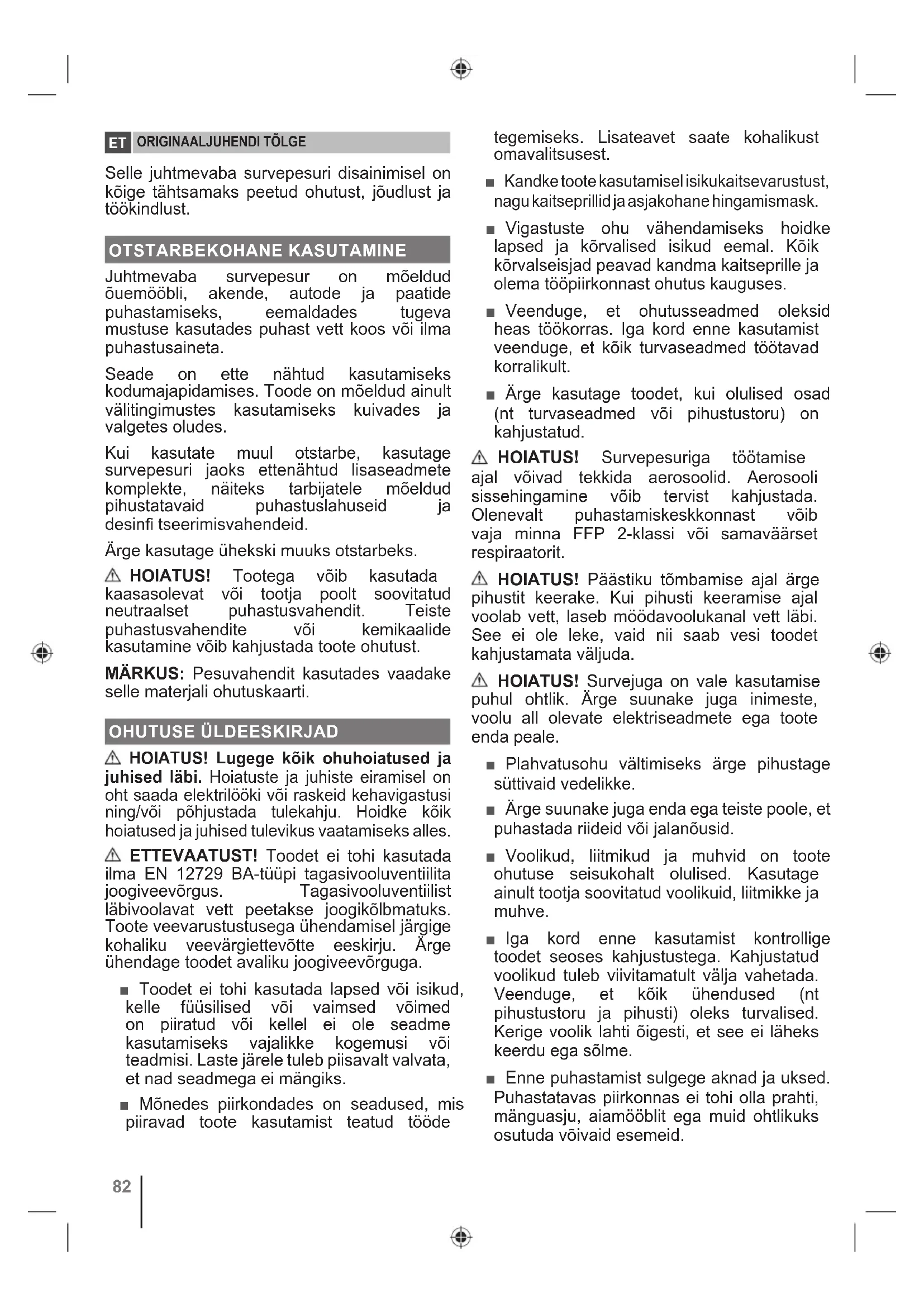 Selle juhtmevaba survepesuri disainimisel on kõige tähtsamaks peetud ohutust, jõudlust ja töökindlust. OTSTARBEKOHANE KASUTAMINE Juhtmevaba survepesur on mõeldud õuemööbli, akende, autode ja paatide puhastamiseks, eemaldades tugeva mustuse kasutades puhast vett koos või ilma puhastusaineta. Seade on ette nähtud kasutamiseks kodumajapidamises. Toode on mõeldud ainult välitingimustes kasutamiseks kuivades ja valgetes oludes. Kui kasutate muul otstarbe, kasutage survepesuri jaoks ettenähtud lisaseadmete komplekte, näiteks tarbijatele mõeldud pihustatavaid puhastuslahuseid ja desinfi tseerimisvahendeid. Ärge kasutage ühekski muuks otstarbeks. HOIATUS! Tootega võib kasutada kaasasolevat või tootja poolt soovitatud neutraalset puhastusvahendit. Teiste puhastusvahendite või kemikaalide kasutamine võib kahjustada toote ohutust. MÄRKUS: Pesuvahendit kasutades vaadake selle materjali ohutuskaarti. OHUTUSE ÜLDEESKIRJAD HOIATUS! Lugege kõik ohuhoiatused ja juhised läbi. Hoiatuste ja juhiste eiramisel on oht saada elektrilööki või raskeid kehavigastusi ning/või põhjustada tulekahju. Hoidke kõik hoiatused ja juhised tulevikus vaatamiseks alles. ETTEVAATUST! Toodet ei tohi kasutada ilma EN 12729 BA-tüüpi tagasivooluventiilita joogiveevõrgus. Tagasivooluventiilist läbivoolavat vett peetakse joogikõlbmatuks. Toote veevarustustusega ühendamisel järgige kohaliku veevärgiettevõtte eeskirju. Ärge ühendage toodet avaliku joogiveevõrguga. ■ Toodet ei tohi kasutada lapsed või isikud, kelle füüsilised või vaimsed võimed on piiratud või kellel ei ole seadme kasutamiseks vajalikke kogemusi või teadmisi. Laste järele tuleb piisavalt valvata, et nad seadmega ei mängiks. ■ Mõnedes piirkondades on seadused, mis piiravad toote kasutamist teatud tööde tegemiseks. Lisateavet saate kohalikust omavalitsusest. ■ Kandke toote kasutamisel isikukaitsevarustust, nagu kaitseprillid ja asjakohane hingamismask. ■ Vigastuste ohu vähendamiseks hoidke lapsed ja kõrvalised isikud eemal. Kõik kõrvalseisjad peavad kandma kaitseprille ja olema tööpiirkonnast ohutus kauguses. ■ Veenduge, et ohutusseadmed oleksid heas töökorras. Iga kord enne kasutamist veenduge, et kõik turvaseadmed töötavad korralikult. ■ Ärge kasutage toodet, kui olulised osad (nt turvaseadmed või pihustustoru) on kahjustatud. HOIATUS! Survepesuriga töötamise ajal võivad tekkida aerosoolid. Aerosooli sissehingamine võib tervist kahjustada. Olenevalt puhastamiskeskkonnast võib vaja minna FFP 2-klassi või samaväärset respiraatorit. HOIATUS! Päästiku tõmbamise ajal ärge pihustit keerake. Kui pihusti keeramise ajal voolab vett, laseb möödavoolukanal vett läbi. See ei ole leke, vaid nii saab vesi toodet kahjustamata väljuda. HOIATUS! Survejuga on vale kasutamise puhul ohtlik. Ärge suunake juga inimeste, voolu all olevate elektriseadmete ega toote enda peale. ■ Plahvatusohu vältimiseks ärge pihustage süttivaid vedelikke. ■ Ärge suunake juga enda ega teiste poole, et puhastada riideid või jalanõusid. ■ Voolikud, liitmikud ja muhvid on toote ohutuse seisukohalt olulised. Kasutage ainult tootja soovitatud voolikuid, liitmikke ja muhve. ■ Iga kord enne kasutamist kontrollige toodet seoses kahjustustega. Kahjustatud voolikud tuleb viivitamatult välja vahetada. Veenduge, et kõik ühendused (nt pihustustoru ja pihusti) oleks turvalised. Kerige voolik lahti õigesti, et see ei läheks keerdu ega sõlme. ■ Enne puhastamist sulgege aknad ja uksed. Puhastatavas piirkonnas ei tohi olla prahti, mänguasju, aiamööblit ega muid ohtlikuks osutuda võivaid esemeid. 82■ Ärge kasutage toodet temperatuuril alla 0 °C. ■ Ärge kasutage toodet hapete, aluste, lahustite, süttiva materjali, valgendite ega tööstuslike lahustitega. Need tooted võivad kasutajat füüsiliselt vigastada ja toodet pöördumatult kahjustada. ■ Hoidke käepidemest kindlalt mõlema käega kinni. Olge valmis selleks, et käepide võib päästiku tõmbamisel reaktsioonijõudude tõttu liikuda. Kui päästikut kindlalt ei hoita, võib kontroll pesuri üle kaduda ja te võite ennast või teisi vigastada. ■ Olge ettevaatlik, et te ei libiseks ega kukuks. ■ Hoidke end pidevalt jalgadel ja tasakaalus. Ärge kummardage. Liigse ette küünitamise tõttu võite kaotada tasakaalu ja see võib põhjustada raskeid vigastusi. ■ Ärge kunagi jätke toodet tööle järelevalveta. Lülitage seade välja. Ärge lahkuge toote juurest enne selle täielikku peatumist. Hoidke lapsed sisselülitatud tootest eemal. ■ Õppige tundma kõiki seadme juhtseadiseid ja kasutusnõudeid. Tehke endale selgeks toote peatamine ja kiiresti surve alt vabastamine. ■ Olge tähelepanelik ja hoidke seadet kontrolli all. Jälgige mida teete ja kasutage tervet mõistust. ■ Ärge kasutage seadet väsinuna või haigena ega siis, kui olete uimastite, alkoholi või ravimite mõju all. Hetkeline tähelepanu hajumine seadme kasutamise ajal võib põhjustada raske kehavigastuse. ■ Ärge kasutage seadet, kui lüliti ei lülita seda sisse ja välja. Lülitiga lülitamatu seadme kasutamine on ohtlik ja see tuleb lasta ära remontida. ■ Auto puhastamisel hoidke vähemalt 30 cm vahet. Survejuga võib autorehve ja/või ventiile kahjustada või nad ära lõhkuda. ■ Toodet ei tohi kasutada, kui see on maha kukkunud, sellel on nähtavaid vigastusi või see lekib. ■ Seadme pikaajalisel kasutamisel võite saada kehavigastusi ja varasemad vigastused võivad süveneda. Kui kasutate toodet pikaajaliselt, tehke regulaarselt pause.