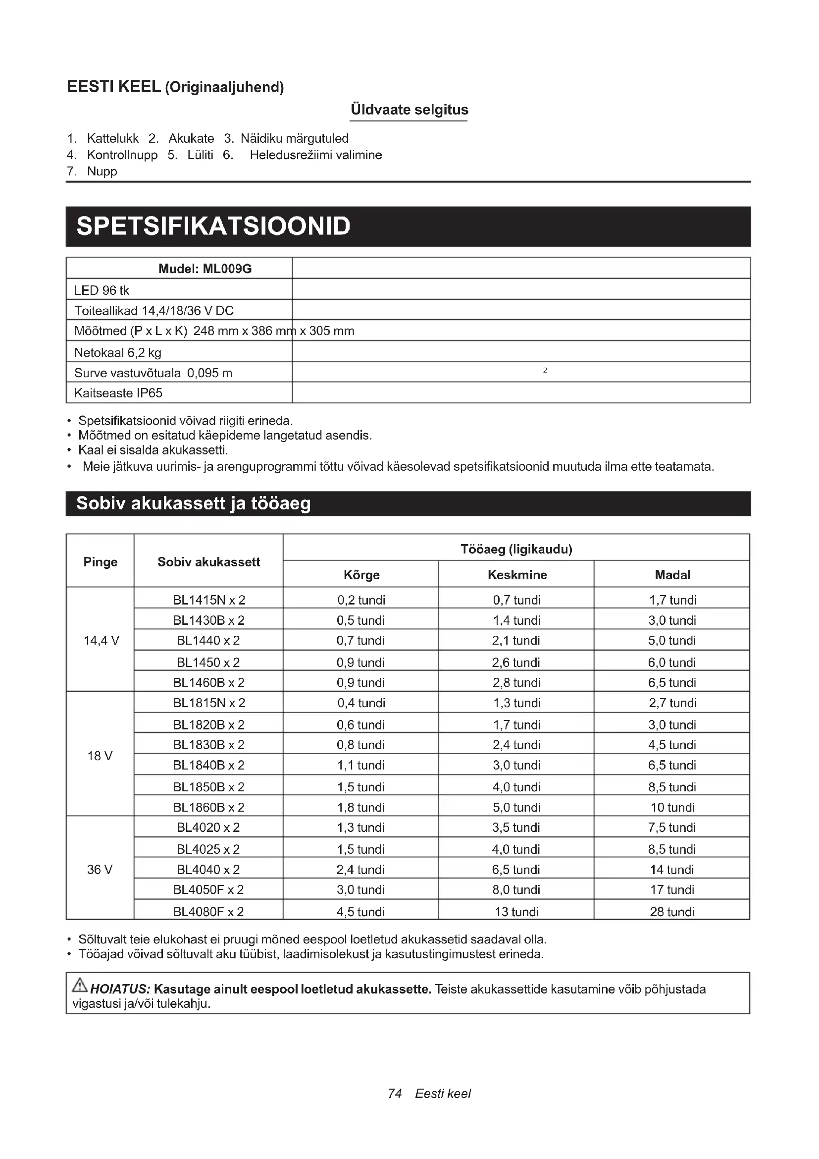 - Kasutage seadmeid ainult ettenähtud akukomplektidega. Teiste akukomplektide kasutamine võib põhjustada vigastuste ja tulekahju ohu.