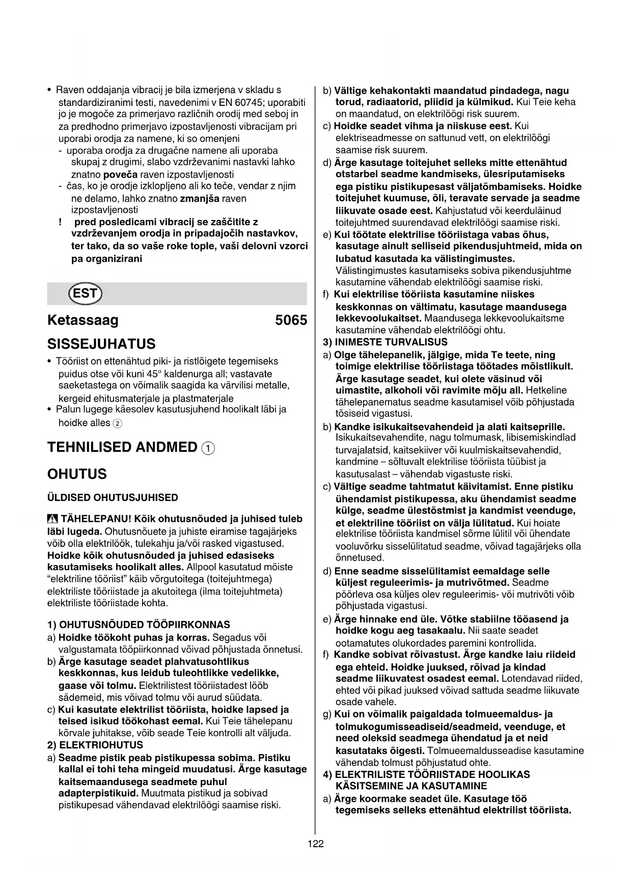 - Palun lugege käesolev kasutusjuhend hoolikalt läbi ja hoidke alles 2 TEHNILISED ANDMED 1 OHUTUS ÜLDISED OHUTUSJUHISED TÄHELEPANU! Kõik ohutusnõuded ja juhised tuleb läbi lugeda. Ohutusnõuete ja juhiste eiramise tagajärjeks võib olla elektrilöök, tulekahju ja/või rasked vigastused. Hoidke kõik ohutusnõuded ja juhised edasiseks kasutamiseks hoolikalt alles. Allpool kasutatud mõiste “elektriline tööriist” käib võrgutoitega (toitejuhtmega) elektriliste tööriistade ja akutoitega (ilma toitejuhtmeta) elektriliste tööriistade kohta.