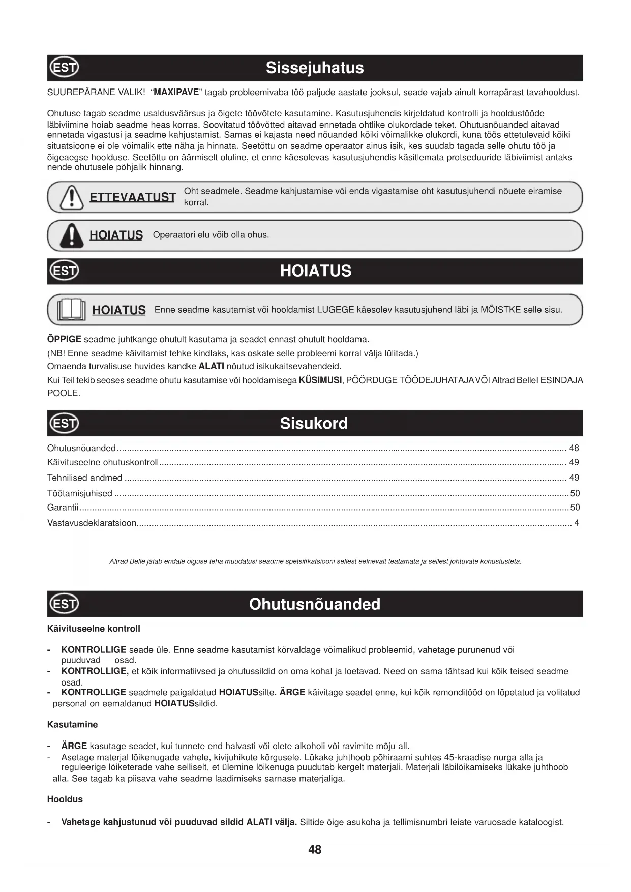 - Vastavusdeklaratsioon Altrad Belle jätab endale õiguse teha muudatusi seadme spetsi¿ katsiooni sellest eelnevalt teatamata ja sellest johtuvate kohustusteta. Ohutusnõuanded Käivituseelne kontroll - KONTROLLIGE seade üle. Enne seadme kasutamist kõrvaldage võimalikud probleemid, vahetage purunenud või puuduvad osad. - KONTROLLIGE, et kõik informatiivsed ja ohutussildid on oma kohal ja loetavad. Need on sama tähtsad kui kõik teised seadme osad. - KONTROLLIGE seadmele paigaldatud HOIATUSsilte. ÄRGE käivitage seadet enne, kui kõik remonditööd on lõpetatud ja volitatud personal on eemaldanud HOIATUSsildid. Kasutamine - ÄRGE kasutage seadet, kui tunnete end halvasti või olete alkoholi või ravimite mõju all. - Asetage materjal lõikenugade vahele, kivijuhikute kõrgusele. Lükake juhthoob põhiraami suhtes 45-kraadise nurga alla ja reguleerige lõiketerade vahe selliselt, et ülemine lõikenuga puudutab kergelt materjali. Materjali läbilõikamiseks lükake juhthoob alla. See tagab ka piisava vahe seadme laadimiseks sarnase materjaliga. Hooldus - Vahetage kahjustunud või puuduvad sildid ALATI välja. Siltide õige asukoha ja tellimisnumbri leiate varuosade kataloogist. Oht seadmele. Seadme kahjustamise või enda vigastamise oht kasutusjuhendi nõuete eiramise korral. ETTEVAATUST Operaatori elu võib olla ohus. HOIATUS HOIATUS EST Enne seadme kasutamist või hooldamist LUGEGE käesolev kasutusjuhend läbi ja MÕISTKE selle sisu. HOIATUS Sisukord EST ÕPPIGE seadme juhtkange ohutult kasutama ja seadet ennast ohutult hooldama. (NB! Enne seadme käivitamist tehke kindlaks, kas oskate selle probleemi korral välja lülitada.) Omaenda turvalisuse huvides kandke ALATI nõutud isikukaitsevahendeid. Kui Teil tekib seoses seadme ohutu kasutamise või hooldamisega KÜSIMUSI, PÖÖRDUGE TÖÖDEJUHATAJA VÕI Altrad BelleI ESINDAJA POOLE. EST EST49 Käivituseelne ohutuskontroll EST Tehnilised Andmed EST Seadme probleemivaba talitluse tagamiseks viige iga päev enne seadme kasutamist läbi igapäevane 10 minutiline korraline hooldus ja kontrollige järgmist:1. Kasutage seadet, mille lõikenoad on heas korras. 2. Kontrollige, et seadme kõik poldid ja mutrid on korralikult kinni keeratud, ükski osa ei ole rikutud ega puudu. Vastasel korral parandage osad või vahetage välja.3. Kontrollige, et käepide on pärast lõikamist ja enne uue materjali sisselaadimist täiesti üles lükatud.4. Kandke kaitseprille.5. Lahkudes ärge jätke käepidet ülestõstetud asendisse - laske käepide alla või lukustage.6. Jälgige tööalal viibivaid inimesi ja takistusi. Kasutage ALATI Altrad Belle`i originaalvaruosi.Valed hooldusvõtted võivad põhjustada ohtu. Lugege OHUTUSNÕUANNETE JA JUHISTE osa enne hooldus- või remonditööde tegemist hoolikalt läbi. ETTEVAATUST p. 4