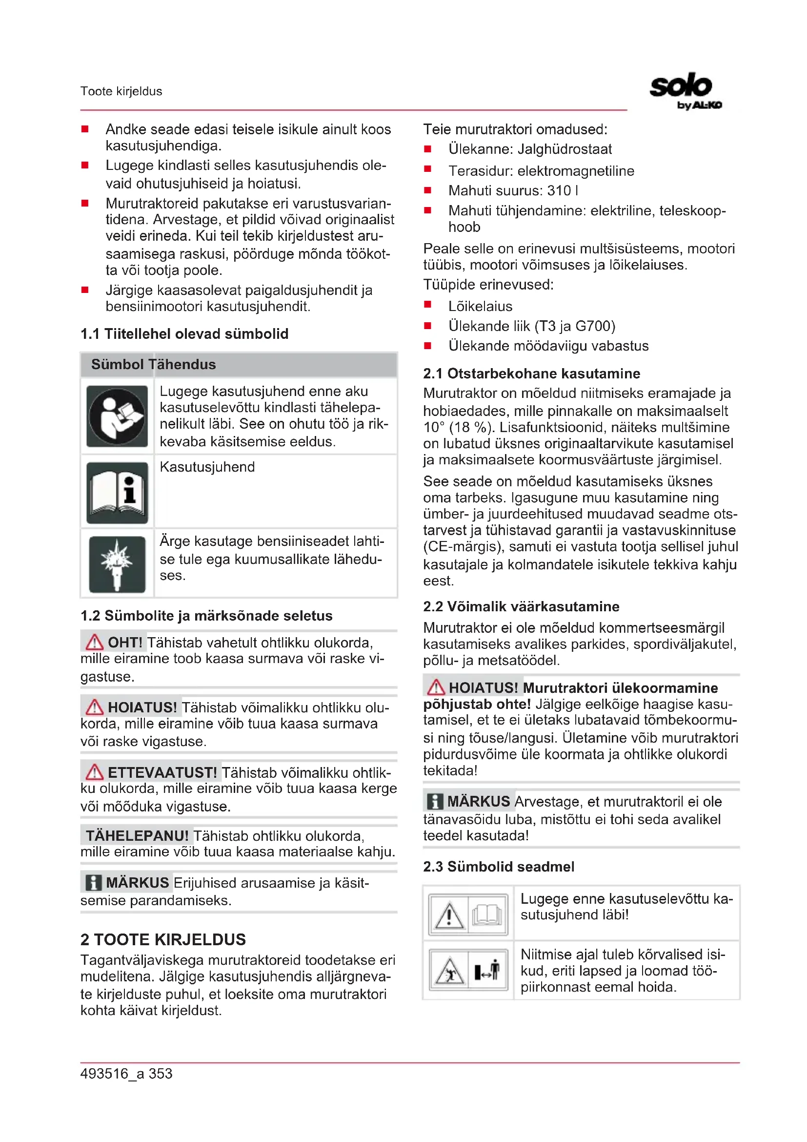 OHT! Tähistab vahetult ohtlikku olukorda, mille eiramine toob kaasa surmava või raske vi- gastuse. HOIATUS! Tähistab võimalikku ohtlikku olu- korda, mille eiramine võib tuua kaasa surmava või raske vigastuse. ETTEVAATUST! Tähistab võimalikku ohtlik- ku olukorda, mille eiramine võib tuua kaasa kerge või mõõduka vigastuse. TÄHELEPANU! Tähistab ohtlikku olukorda, mille eiramine võib tuua kaasa materiaalse kahju. MÄRKUS Erijuhised arusaamise ja käsit- semise parandamiseks. 2 TOOTE KIRJELDUS Tagantväljaviskega murutraktoreid toodetakse eri mudelitena. Jälgige kasutusjuhendis alljärgneva- te kirjelduste puhul, et loeksite oma murutraktori kohta käivat kirjeldust. Teie murutraktori omadused: