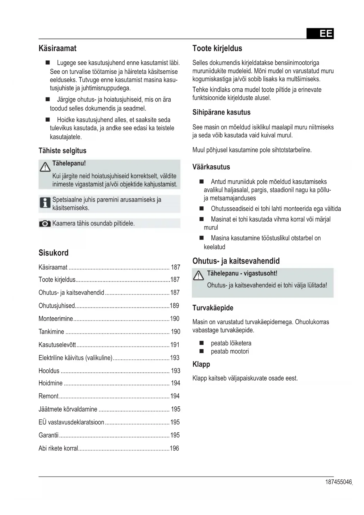 - Tarkasta niittoterät Jos ilmenneitä häiriöitä ei löydy tästä taulukosta tai jos et osaa itse korjata niitä, ota yhteyttä vastaavaan asiakaspalveluumme.EE 187455046_e Sisukord Käsiraamat ................................................................ 187 Toote kirjeldus ............................................................ 187 Ohutus- ja kaitsevahendid ......................................... 187 Ohutusjuhised ............................................................ 189 Monteerimine ............................................................. 190 Tankimine .................................................................. 190 Kasutuselevõtt ........................................................... 191 Elektriline käivitus (valikuline) .................................... 193 Hooldus ..................................................................... 193 Hoidmine ................................................................... 194 Remont ...................................................................... 194 Jäätmete kõrvaldamine ............................................. 195 EÜ vastavusdeklaratsioon ......................................... 195 Garantii ...................................................................... 195 Abi rikete korral .......................................................... 196 Käsiraamat Lugege see kasutusjuhend enne kasutamist läbi. See on turvalise töötamise ja häireteta käsitsemise eelduseks. Tutvuge enne kasutamist masina kasu- tusjuhiste ja juhtimisnuppudega. Järgige ohutus- ja hoiatusjuhiseid, mis on ära toodud selles dokumendis ja seadmel. Hoidke kasutusjuhend alles, et saaksite seda tulevikus kasutada, ja andke see edasi ka teistele kasutajatele. Tähiste selgitus Tähelepanu! Kui järgite neid hoiatusjuhiseid korrektselt, väldite inimeste vigastamist ja/või objektide kahjustamist. Spetsiaalne juhis paremini arusaamiseks ja käsitsemiseks. Kaamera tähis osundab piltidele. Toote kirjeldus Selles dokumendis kirjeldatakse bensiinimootoriga muruniidukite mudeleid. Mõni mudel on varustatud muru kogumiskastiga ja/või sobib lisaks ka multšimiseks. Tehke kindlaks oma mudel toote piltide ja erinevate funktsioonide kirjelduste alusel. Sihipärane kasutus See masin on mõeldud isiklikul maalapil muru niitmiseks ja seda võib kasutada vaid kuival murul. Muul põhjusel kasutamine pole sihtotstarbeline. Väärkasutus Antud muruniiduk pole mõeldud kasutamiseks avalikul haljasalal, pargis, staadionil nagu ka põllu- ja metsamajanduses Ohutusseadiseid ei tohi lahti monteerida ega vältida Masinat ei tohi kasutada vihma korral või märjal murul Masina kasutamine tööstuslikul otstarbel on keelatud Ohutus- ja kaitsevahendid Tähelepanu - vigastusoht! Ohutus- ja kaitsevahendeid ei tohi välja lülitada! Turvakäepide Masin on varustatud turvakäepidemega. Ohuolukorras vabastage turvakäepide. peatab lõiketera peatab mootori Klapp Klapp kaitseb väljapaiskuvate osade eest.EE Originaalse kasutusjuhendi tõlge