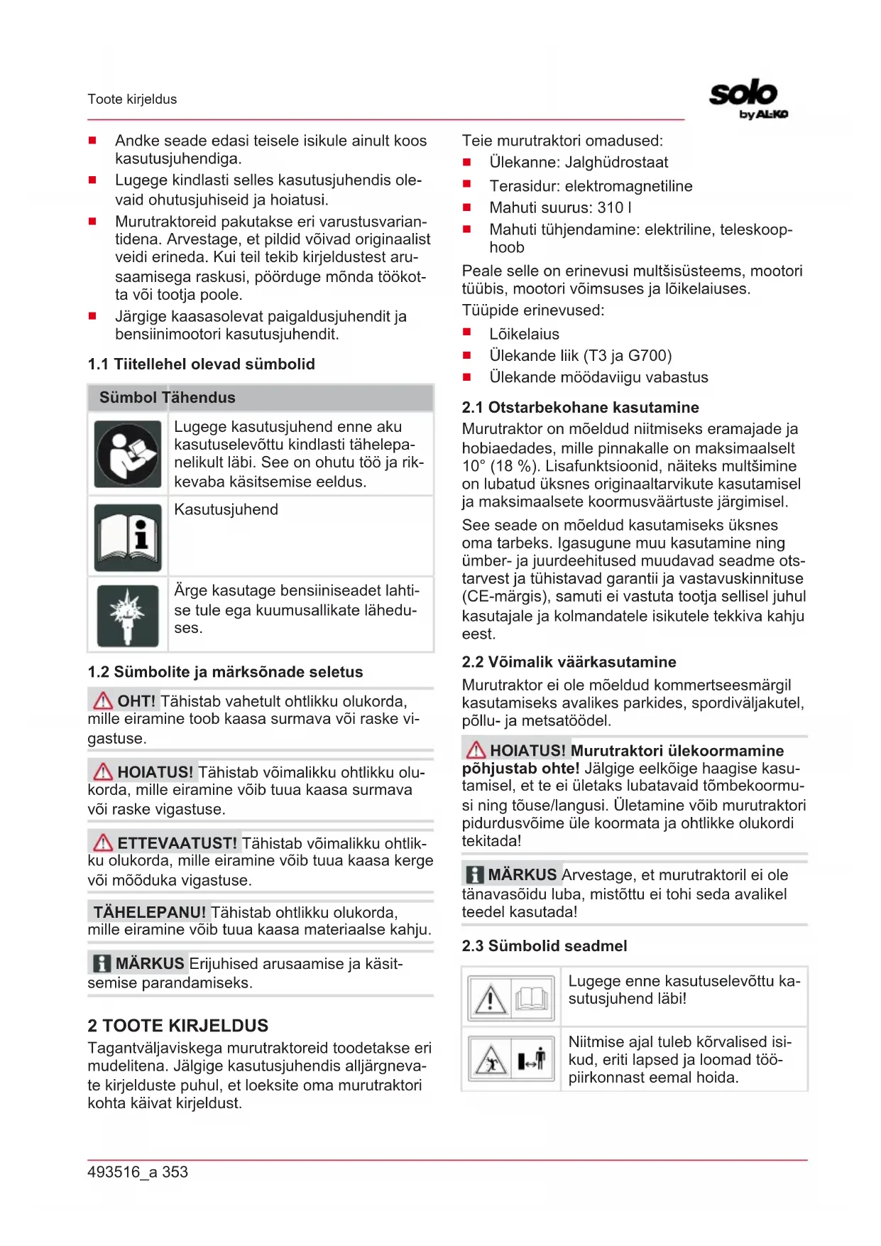OHT! Tähistab vahetult ohtlikku olukorda, mille eiramine toob kaasa surmava või raske vi- gastuse. HOIATUS! Tähistab võimalikku ohtlikku olu- korda, mille eiramine võib tuua kaasa surmava või raske vigastuse. ETTEVAATUST! Tähistab võimalikku ohtlik- ku olukorda, mille eiramine võib tuua kaasa kerge või mõõduka vigastuse. TÄHELEPANU! Tähistab ohtlikku olukorda, mille eiramine võib tuua kaasa materiaalse kahju. MÄRKUS Erijuhised arusaamise ja käsit- semise parandamiseks. 2 TOOTE KIRJELDUS Tagantväljaviskega murutraktoreid toodetakse eri mudelitena. Jälgige kasutusjuhendis alljärgneva- te kirjelduste puhul, et loeksite oma murutraktori kohta käivat kirjeldust. Teie murutraktori omadused:
