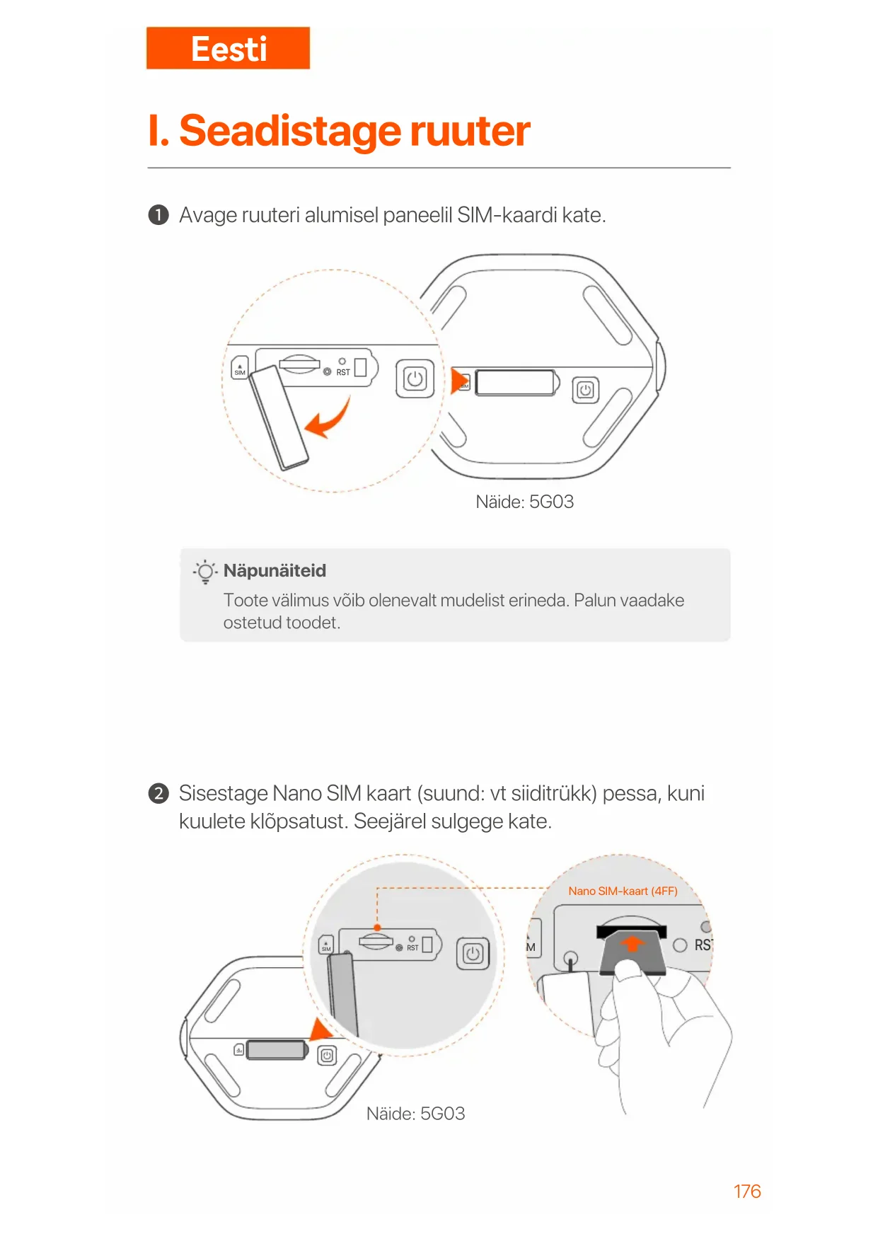 Sisestage Nano SlM kaart (suund: vt siiditrükk) pessa, kuni kuulete klõpsatust. Seejärel sulgege kate. SIM SIM RST Näide: 5G03 SIM SIM RST SIM RST Nano SIM-kaart (4FF) Näide: 5G03177 Näpunäiteid Toote välimus võib olenevalt mudelist erineda. Palun vaadake ostetud toodet. Toimivuse tagamiseks ja SIM-kaardi kahjustamise vältimiseks ärge sisestage ega eemaldage SIM-kaarti, kui ruuter töötab. SIM-kaardi eemaldamiseks vajutage SIM-kaarti õrnalt, kuni see klõpsab. SIM-kaart hüppab automaatselt välja.