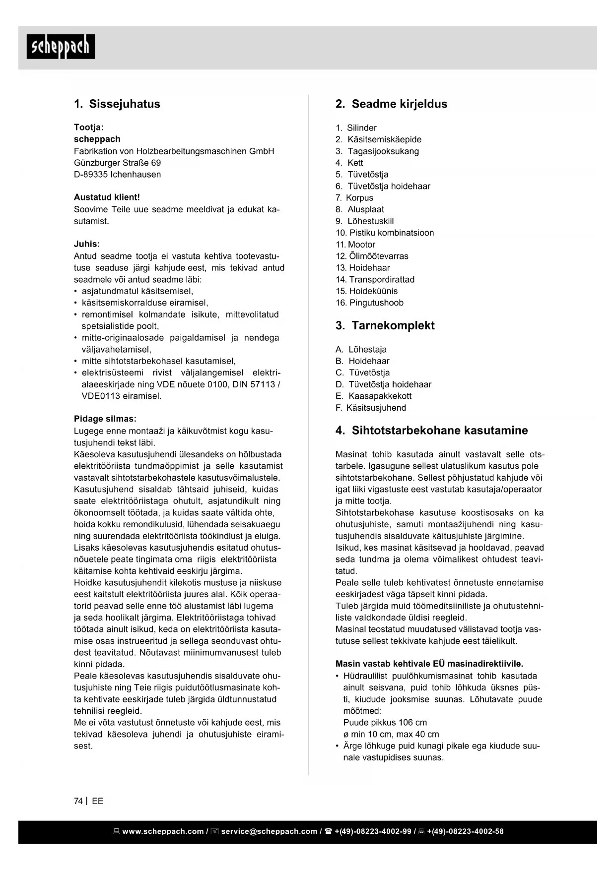 - elektrisüsteemi rivist väljalangemisel elektri- alaeeskirjade ning VDE nõuete 0100, DIN 57113 / VDE0113 eiramisel. Pidage silmas: Lugege enne montaaži ja käikuvõtmist kogu kasu- tusjuhendi tekst läbi. Käesoleva kasutusjuhendi ülesandeks on hõlbustada elektritööriista tundmaõppimist ja selle kasutamist vastavalt sihtotstarbekohastele kasutusvõimalustele. Kasutusjuhend sisaldab tähtsaid juhiseid, kuidas saate elektritööriistaga ohutult, asjatundikult ning ökonoomselt töötada, ja kuidas saate vältida ohte, hoida kokku remondikulusid, lühendada seisakuaegu ning suurendada elektritööriista töökindlust ja eluiga. Lisaks käesolevas kasutusjuhendis esitatud ohutus- nõuetele peate tingimata oma riigis elektritööriista käitamise kohta kehtivaid eeskirju järgima. Hoidke kasutusjuhendit kilekotis mustuse ja niiskuse eest kaitstult elektritööriista juures alal. Kõik operaa- torid peavad selle enne töö alustamist läbi lugema ja seda hoolikalt järgima. Elektritööriistaga tohivad töötada ainult isikud, keda on elektritööriista kasuta- mise osas instrueeritud ja sellega seonduvast ohtu- dest teavitatud. Nõutavast miinimumvanusest tuleb kinni pidada. Peale käesolevas kasutusjuhendis sisalduvate ohu- tusjuhiste ning Teie riigis puidutöötlusmasinate koh- ta kehtivate eeskirjade tuleb järgida üldtunnustatud tehnilisi reegleid. Me ei võta vastutust õnnetuste või kahjude eest, mis tekivad käesoleva juhendi ja ohutusjuhiste eirami- sest. www.scheppach.com / service@scheppach.com / +(49)-08223-4002-99 / +(49)-08223-4002-58