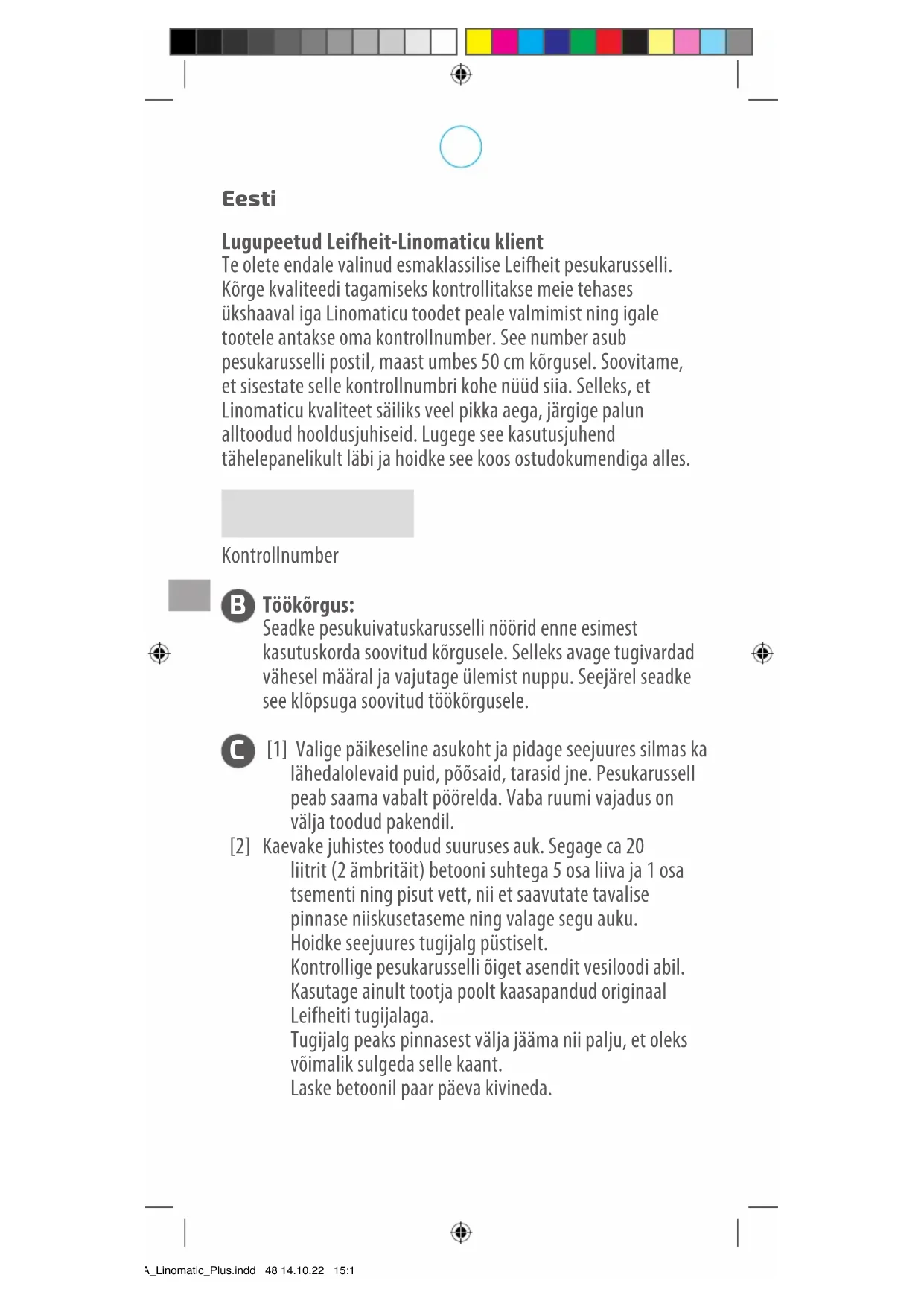 Puhastage aeg-ajalt pesukarusselli posti niiske lapi ja majapidamises kasutatava puhastusvahendiga. Võite aegajalt piserdada lapile pisut tavapärast täissünteetilist hooldusvahendit ja hõõruda sellega pesukarusselli posti. Kui pesukarussell on avatud, *BA_Linomatic_Plus.indd 49 14.10.22 15:11võib tugivarrastel olevatesse kuivatusnööride etteandmisavadesse piserdada veidi hooldusvahendit. Puhastage tugijalga regulaarselt mullast, liivast ja veest. Ohutusnõuded: Leifheit Linomatic pesukarussell on ette nähtud eraviisiliseks kasutamiseks õues ja seda tohib kasutada ainult vastavalt käesolevas kasutusjuhendis toodud teabele. Ebaotstarbekohane kasutamine on keelatud. Lapsed võivad pesukarusselli nööride kasutamisel sattuda poomisohtu. Poomisohu ja pesunööride sassimineku ärahoidmiseks kasutage pesukarusselli vaid lastele kättesaamatus kohas. Nöörid võivad ümber lapse kaela keerduda. Ärge sõlmige nööre. Veenduge, et nöörid ei oleks keerdus ja ei moodustaks aasasid. Kontrollige pesukarusselli ja selle ülestõstmisnööri kahjustuste osas enne igat kasutuskorda. Kahjustatud pesukarusselli ei tohi enam kasutada. Kui nöör kiilub plastkatete vahele kinni: Lükake nöör ettevaatlikult tagasi selleks ettenähtud ümarasse väljalaskeavasse. Ärge mingil juhul eemaldage plastkatet! Kui nöör on mähitud ümber pesukarusselli posti, tugivarre või katte: Tõmmake pesukarussell pisut lahti ja pange nöör tagasi oma kohale. Kui nöörid on märjaks saanud: Laske nööridel lahtise pesukarusselli peal ära kuivada. Bedienungs-, Pege- und Sicherheitshinweise / Operating, care and safety instructions. / Instructions d’utilisation, instructions d‘entretien et consignes de sécurité / Bedienings-, verzorgings- en veiligheidsaanwijzingen / Istruzioni per l‘uso e il mantenimento e avvertenze di sicurezza / Instrucci- ones de uso, mantenimiento y seguridad / Pokyny pro obsluhu, ošetřování a bezpečnost / Pokyny na obsluhu, ošetrovanie a bezpečnostné pokyny / Wskazówki dotyczące obsługi, konserwacji i bezpieczeństwa / Bruks-, skötsel- och säkerhetsanvisningar / Bet- jenings-, pleje- og sikkerhedsanvisninger / Naudojimo, priežiūros ir saugos nurodyma / Kasutus- hooldus- ja ohutusjuhised