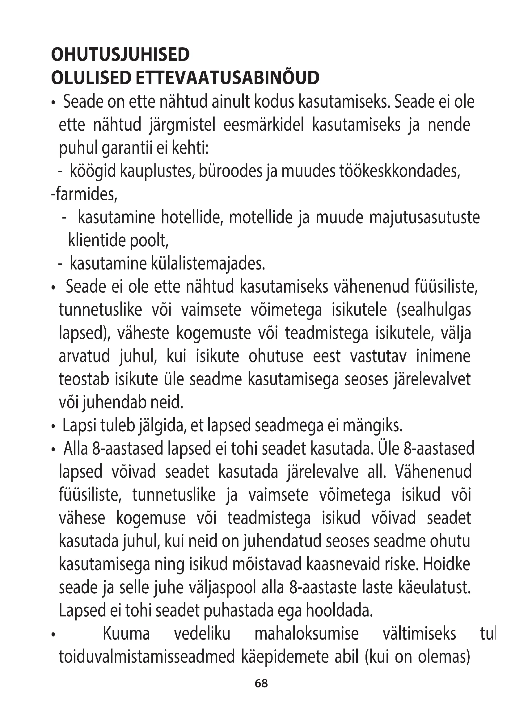 Seade ei ole ette nähtud kasutamiseks vahrenenud füusiliste, tunnetuslike voi vaimsete voimetega isikutele (sealhulgas lapsed), väheste kogemuste voi teadmistega isikutele, valja arvatud juhul, kui isikute ohutuse eest vastutav iminemeteostab isikute üle seadme kasutamisega seoses jarevalvet voi juhendab neid.