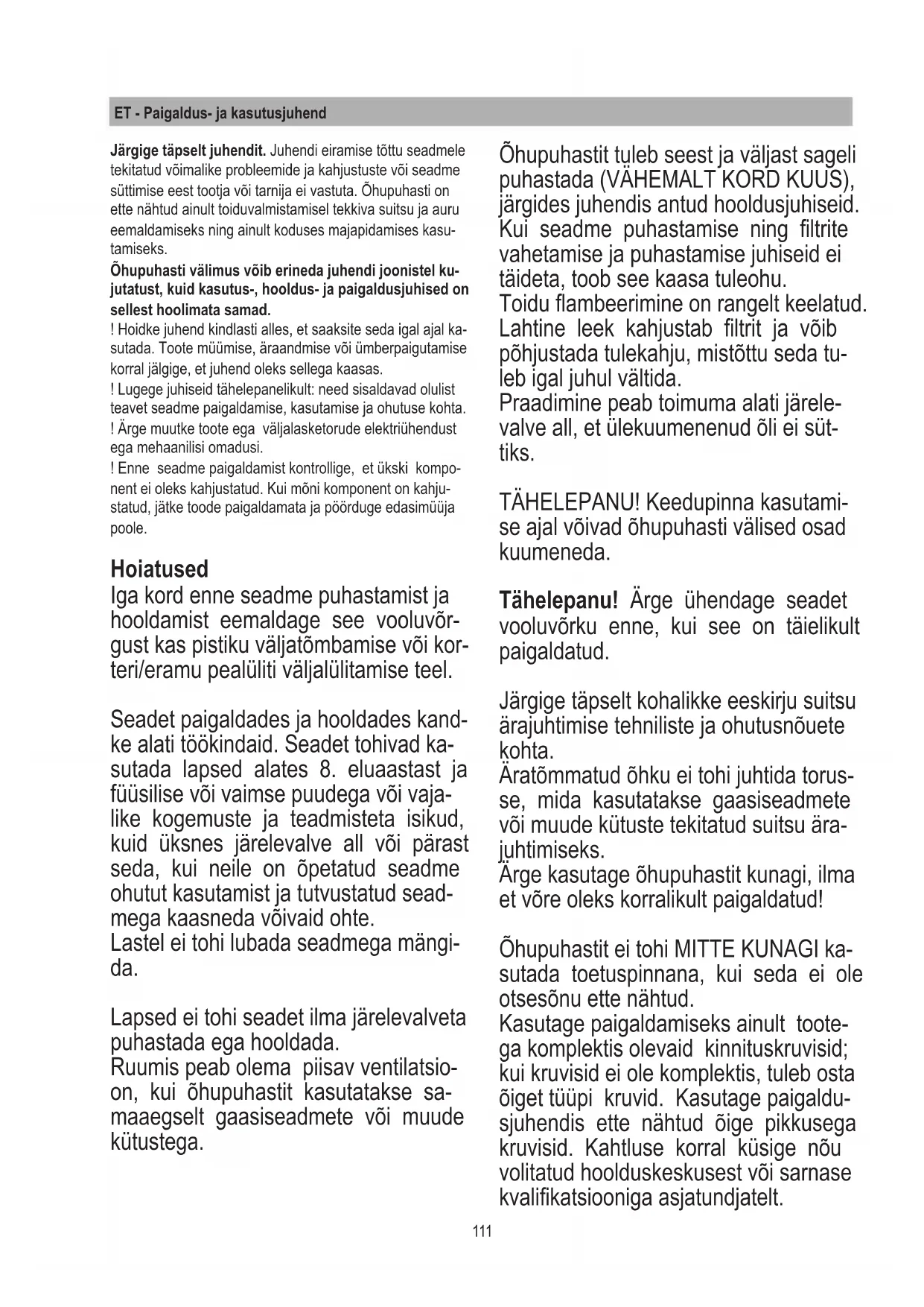 2; CISPR 14-2; CEI/EN 61000-3-2; CEI/EN 61000-3-3. Soovitusi õigeks keskkonnamõju vähendavaks kasuta- miseks: toiduvalmistamist alustades lülitage õhupuhasti sisse miinimum- võimsusel ja jätke see tööle ka mõ- neks minutiks pärast toiduvalmistamise lõpetamist. Suurendage võimsust ainult juhul, kui suitsu ja auru on väga palju, ning turborežiimi kasutage ainult äärmi- sel juhul. Et lõhna eemaldav süsteem toimiks tõhusalt, vahetage vastavalt vajadusele ltrit/ltreid/sütt. Puhastage vajaduse korral rasvaltrit, et see toimi- ks tõhusalt. Võimalikult suure tõhususe ja võimalikult väikese müra tagamiseks kasutage juhendis ette nähtud maksi- maalse läbimõõduga torusid. Kasutamine Õhupuhastit saab kasutada äratõmberežiimil või ltreerival siserin- glusega režiimil.113 Äratõmberežiim Aur juhitakse ühendusääriku külge kin- nitatud väljalasketoru kaudu välja. Väljalasketoru peab olema sama läbi- mõõduga nagu ühendusrõngas. Tähelepanu! Väljalasketoru ei kuulu komplekti ja see tuleb juurde osta. Toru horisontaalne osa peab olema väikese ülespoole kaldega (u 10°), et hõlbusta- da õhu väljajuhtimist. Kui õhupuhasti on varustatud söeltritega, tuleb need välja võtta. Filtreerimisrežiim Äratõmmatud õhk puhastatakse rasvast ja juhitakse ruumi tagasi. Õhupuhasti kasutamiseks sellel režiimil tuleb paigal- dada täiendav aktiivsöega ltreerimissü- steem. Märkus. Söeltrid läbinud õhk juhitakse kööki tagasi läbi toru, mis suunab õhu kapi küljele. Paigaldamine Märkus. Seade tuleb paigaldada nii, et tagada võimalikeks parandustöödeks alaline juurdepääs seadmele ja selle elektroonilistele komponentidele. HOIATUS. Elektroonilisi komponen- te sisaldav metallkarp tuleb paigutada vähemalt 65 cm kaugusele gaasipliidist ja igal juhul 65 cm kaugusele õhupuhasti sissetõmbeavast. SOOVITUS. Soovitame paigaldada elektroonilisi komponente sisaldava metallkarbi vähemalt 10 cm kõrgusele põrandast ja piisavalt kaugele kõikidest soojusallikatest (nt pliidi külg või keedu- pind). Kui gaasipliidi paigaldamisjuhendis on ette nähtud suurem kaugus, tuleb seda järgida. Elektriühendus Õhupuhasti peab vooluvõrguga ühenda- ma kvalitseeritud spetsialist. Vooluvõrgu pinge peab vastama õhu- puhasti siseküljel asuval etiketil näidatud pingele. Kui õhupuhastil on olemas pi- stik, tuleb see ühendada nõuetekohase pistikupesaga, mille asukoht on juurde- pääsetav ka pärast seadme paigaldami- st. Kui pistik puudub (seade ühendatak- se otse vooluvõrku) või kui pistikupesa ei asu pärast seadme paigaldamist juurde- pääsetavas kohas, paigaldage vastavalt asjakohasele juhendile nõuetekohane bipolaarne kaitselüliti, mis tagab täieliku väljalülitamise vooluvõrgust ülepinge III kategooria tingimustel. Tähelepanu! Iga kord enne õhupuhasti vooluvõrku ühendamist ja kontrollimist, kas seade toimib nõuetekohaselt, jäl- gige, et elektrikaabel oleks korralikult ühendatud. Paigaldamine Enne seadme paigaldamist kontrollige, et ükski komponent ei oleks kahjusta- tud. Kui mõni komponent on kahjusta- tud, jätke seade paigaldamata ja pöör- duge edasimüüja poole. Samuti lugege tähelepanelikult läbi kõik alljärgnevad juhised.114