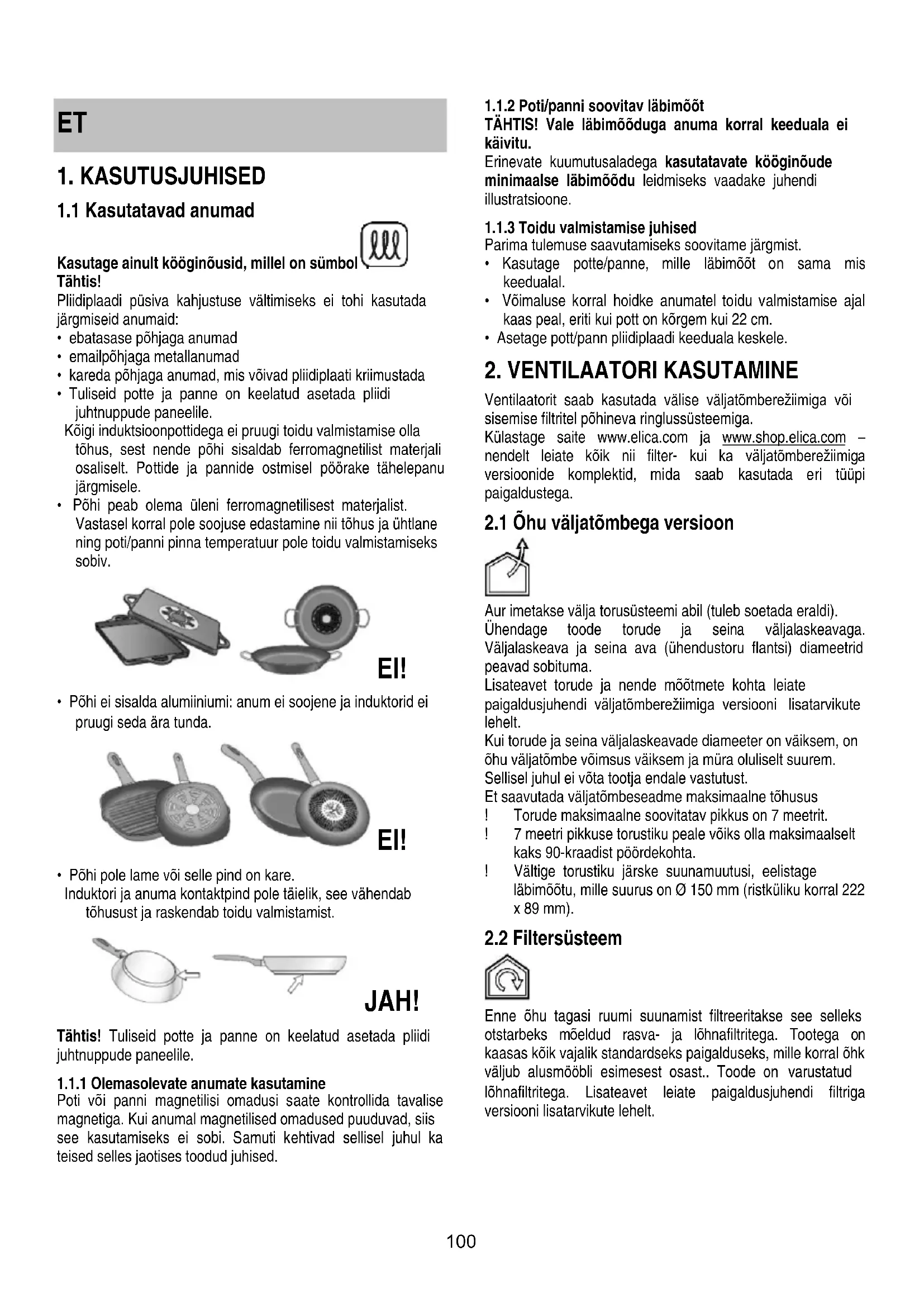 Kulastage saite www.elica.com ja www.shop.elica.com - nendelt leiate kõik nii filter- kui ka valjatombereziimiga versioonide komplektid, mida saab kasutada eri tuupi paigaldustega.