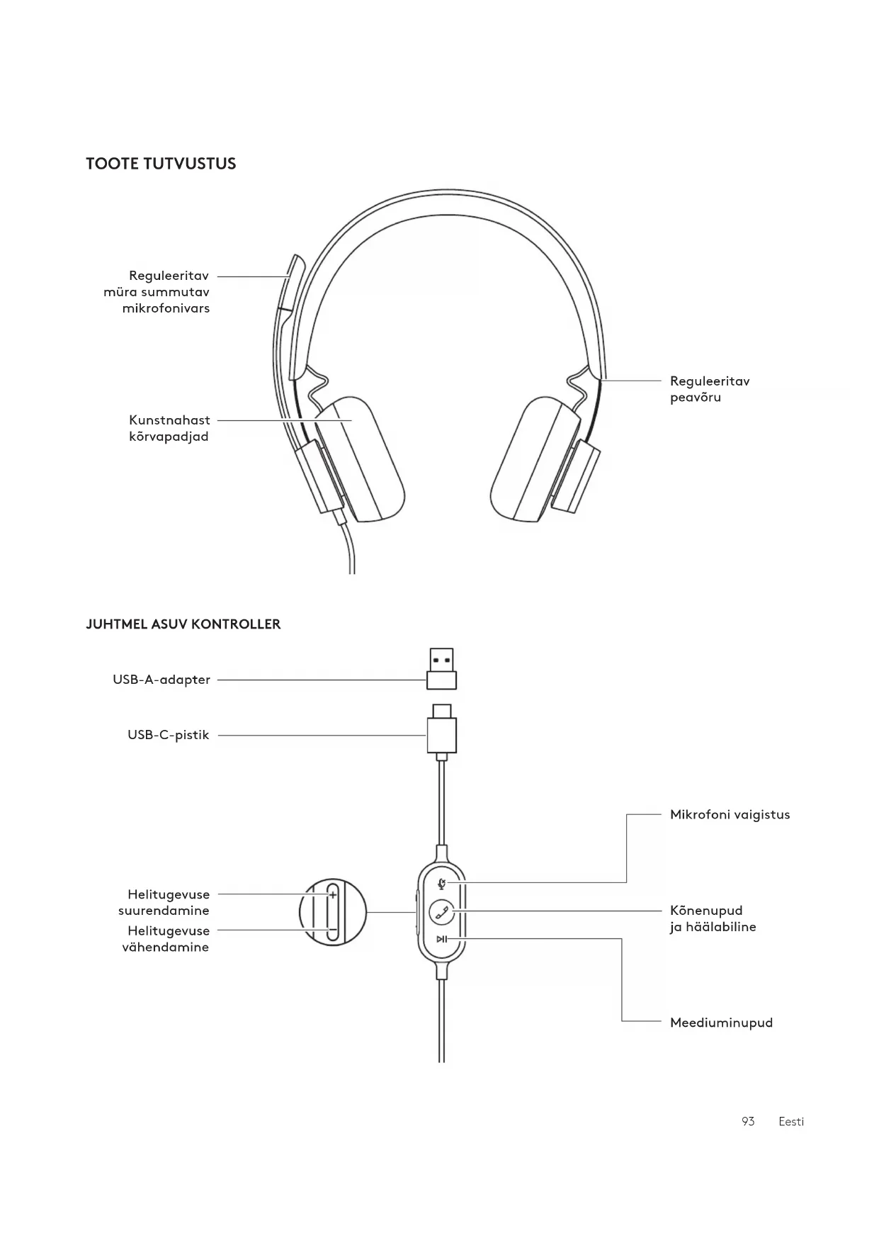 Mikrofoni vaigistus Kõnenupud jahäälabiline Helitugevuse suurendamine Helitugevuse vähendamine USB-C-pistik USB-A-adapter Meediuminupud 93 EestiUSB-A USB-C KARBI SISU