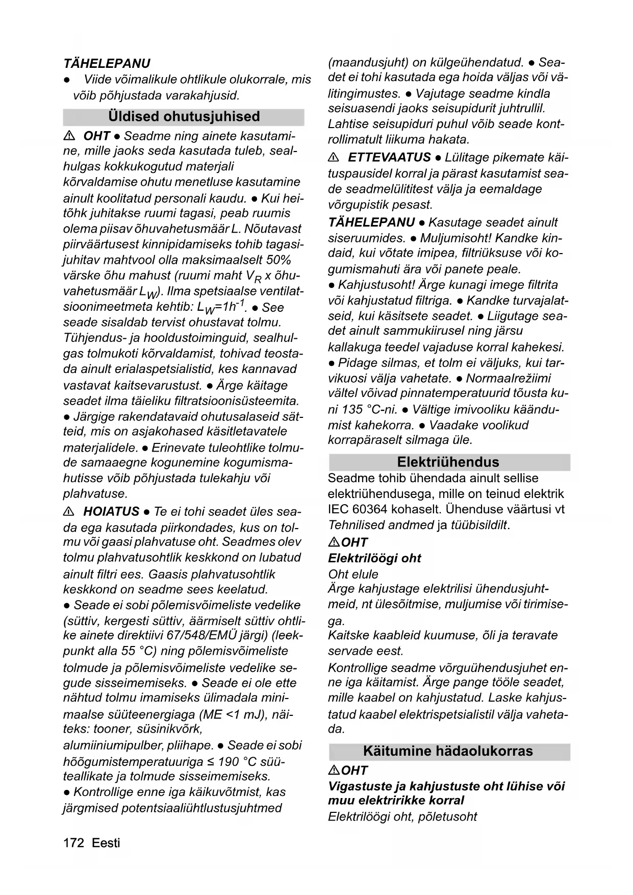 OHT Seadme ning ainete kasutamine, mille jaoks seda kasutada tuleb, sealhulgas kokkukogutud materjali kōrvaldamise ohutu menetluse kasutamine ainult koolitatud personali kaudu. Kui heitōhk juhitakse ruumi tagasi, peab ruumis olemapiiisav ōhuvahetusmaär L. Noutavast piirvärtusest kinnipidamiseks tohib tagasijuhitav mahtvool olla maksimaalselt 50% värske ŏhu mahust (ruumi maht V_R x ŏhuvahetusmaär L_W ). Ilma spetsiaalse ventilatsionimeetmeta kehtib: L_W = 1h^-1 . See seade sisaldab tertvist ohustavat tolu mu. Tühendus- ja hooldustoiminguid, sealhulgas tolmukoti kōrvaldamist, tohivad teostada ainult erialaspetsialistid, kes kannavad vastavat kaitsevarustust. Årge käitage seadet ilma täieliku filtratsioonisüsteemita. Järgige rakendatavaid ohutusalaseid sāteid, mis on asjakohased käsitletaveatele materjalidele. Erinevate tuleohtlike tolunde samaegne kogunemine kogumismahutisse vöib pöhjustada tulekahju vöi plahvatuse.