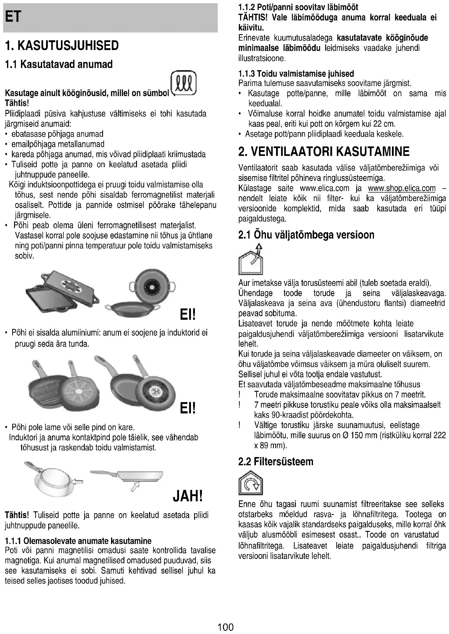 Ventilaatorit saab kasutada välise väljatõmberežiimiga või sisemise filtritel põhineva ringlussüsteemiga. Külastage saite www.elica.com ja www.shop.elica.com – nendelt leiate kõik nii filter- kui ka väljatõmberežiimiga versioonide komplektid, mida saab kasutada eri tüüpi paigaldustega.