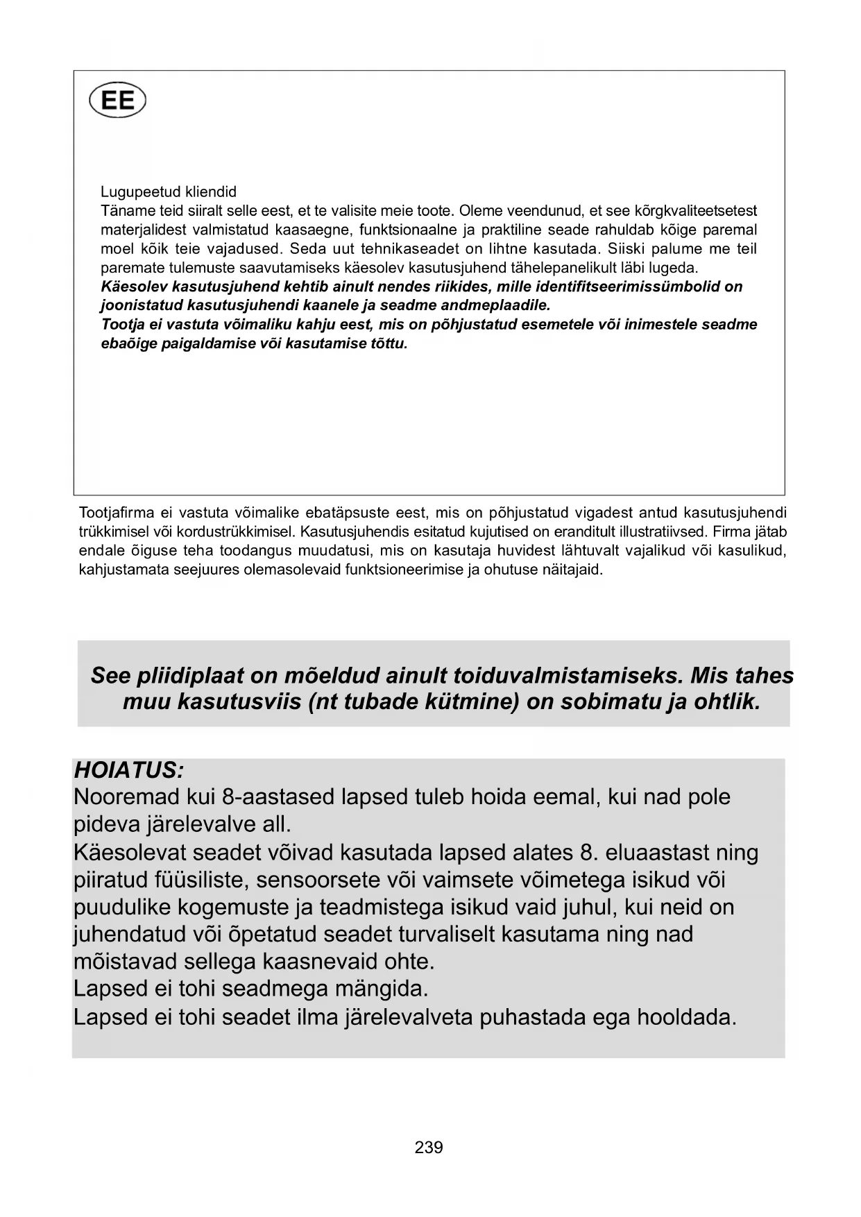 TEHNILINE INFORMATSIOON Seadet tohivad paigaldada, reguleerida, seadistada ja hooldada ainult kvalifitseeritud spetsialistid. Ebaõige paigaldamine võib tekitada kahju loomadele, inimestele või esemetele ning tootja ei kanna sellisel juhul vastutust. Seade tuleb õigesti paigaldada, järgides kohalikku seadust ja tootja suuniseid. Seadme ohutuse või automaatse reguleerimise seadmeid võivad selle kasutusajal muuta ainult tootja või selleks volitatud tarnija.