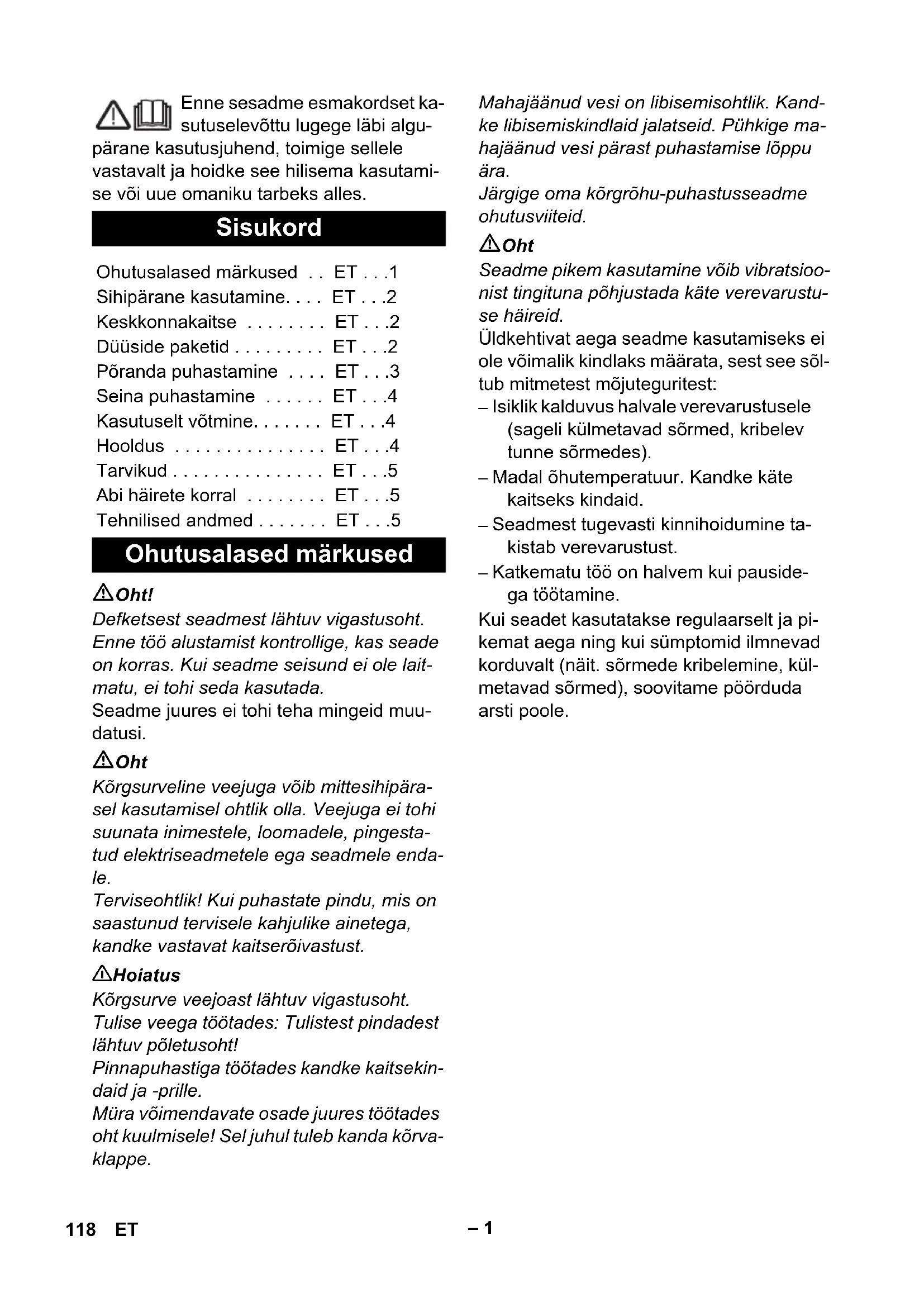 - 0,4 117BG– 1 Enne sesadme esmakordset ka- sutuselevõttu lugege läbi algu- pärane kasutusjuhend, toimige sellele vastavalt ja hoidke see hilisema kasutami- se või uue omaniku tarbeks alles. Oht! Defketsest seadmest lähtuv vigastusoht. Enne töö alustamist kontrollige, kas seade on korras. Kui seadme seisund ei ole lait- matu, ei tohi seda kasutada. Seadme juures ei tohi teha mingeid muu- datusi. Oht Kõrgsurveline veejuga võib mittesihipära- sel kasutamisel ohtlik olla. Veejuga ei tohi suunata inimestele, loomadele, pingesta- tud elektriseadmetele ega seadmele enda- le. Terviseohtlik! Kui puhastate pindu, mis on saastunud tervisele kahjulike ainetega, kandke vastavat kaitserõivastust. 몇 Hoiatus Kõrgsurve veejoast lähtuv vigastusoht. Tulise veega töötades: Tulistest pindadest lähtuv põletusoht! Pinnapuhastiga töötades kandke kaitsekin- daid ja -prille. Müra võimendavate osade juures töötades oht kuulmisele! Sel juhul tuleb kanda kõrva- klappe. Mahajäänud vesi on libisemisohtlik. Kand- ke libisemiskindlaid jalatseid. Pühkige ma- hajäänud vesi pärast puhastamise lõppu ära. Järgige oma kõrgrõhu-puhastusseadme ohutusviiteid. Oht Seadme pikem kasutamine võib vibratsioo- nist tingituna põhjustada käte verevarustu- se häireid. Üldkehtivat aega seadme kasutamiseks ei ole võimalik kindlaks määrata, sest see sõl- tub mitmetest mõjuteguritest: – Isiklik kalduvus halvale verevarustusele (sageli külmetavad sõrmed, kribelev tunne sõrmedes). – Madal õhutemperatuur. Kandke käte kaitseks kindaid. – Seadmest tugevasti kinnihoidumine ta- kistab verevarustust. – Katkematu töö on halvem kui pauside- ga töötamine. Kui seadet kasutatakse regulaarselt ja pi- kemat aega ning kui sümptomid ilmnevad korduvalt (näit. sõrmede kribelemine, kül- metavad sõrmed), soovitame pöörduda arsti poole. Sisukord Ohutusalased märkused