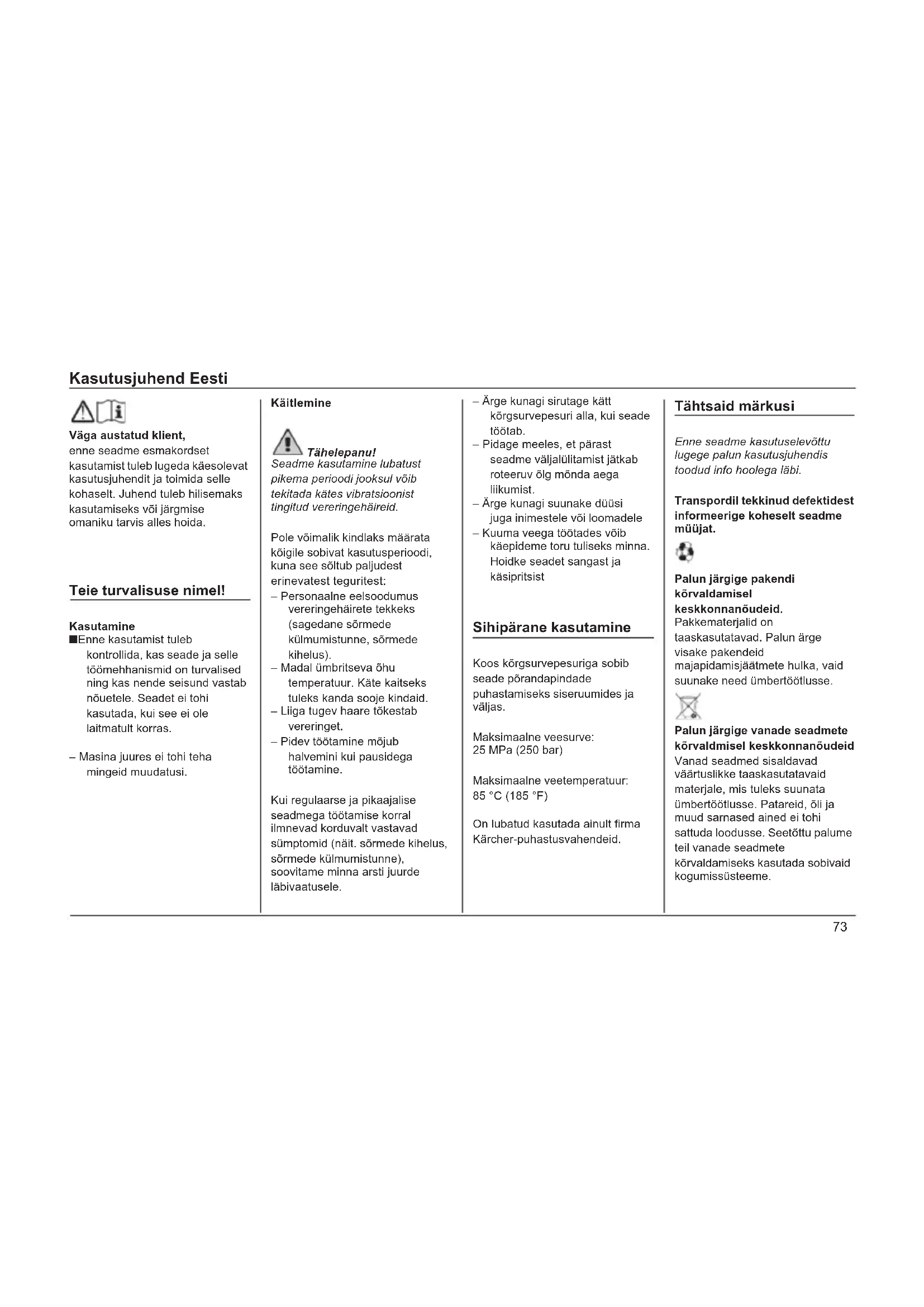 Väga austatud klient, enne seadme esmakordset kasutamist tuleb lugeda käesolevat kasutusjuhendit ja toimida selle kohaselt. Juhend tuleb hilisemaks kasutamiseks või järgmise omaniku tarvis alles hoida. Teie turvalisuse nimel! Kasutamine ■ Enne kasutamist tuleb kontrollida, kas seade ja selle töömehhanismid on turvalised ning kas nende seisund vastab nõuetele. Seadet ei tohi kasutada, kui see ei ole laitmatult korras. – Masina juures ei tohi teha mingeid muudatusi. Käitlemine Tähelepanu! Seadme kasutamine lubatust pikema perioodi jooksul võib tekitada kätes vibratsioonist tingitud vereringehäireid. Pole võimalik kindlaks määrata kõigile sobivat kasutusperioodi, kuna see sõltub paljudest erinevatest teguritest: – Personaalne eelsoodumus vereringehäirete tekkeks (sagedane sõrmede külmumistunne, sõrmede kihelus). – Madal ümbritseva õhu temperatuur. Käte kaitseks tuleks kanda sooje kindaid. – Liiga tugev haare tõkestab vereringet. – Pidev töötamine mõjub halvemini kui pausidega töötamine. Kui regulaarse ja pikaajalise seadmega töötamise korral ilmnevad korduvalt vastavad sümptomid (näit. sõrmede kihelus, sõrmede külmumistunne), soovitame minna arsti juurde läbivaatusele. – brge kunagi sirutage kätt kõrgsurvepesuri alla, kui seade töötab. – Pidage meeles, et pärast seadme väljalülitamist jätkab roteeruv õlg mõnda aega liikumist. – brge kunagi suunake düüsi juga inimestele või loomadele – Kuuma veega töötades võib käepideme toru tuliseks minna. Hoidke seadet sangast ja käsipritsist Sihipärane kasutamine Koos kõrgsurvepesuriga sobib seade põrandapindade puhastamiseks siseruumides ja väljas. Maksimaalne veesurve: 25 MPa (250 bar) Maksimaalne veetemperatuur: 85 °C (185 °F) On lubatud kasutada ainult firma Kärcher-puhastusvahendeid. Tähtsaid märkusi Enne seadme kasutuselevõttu lugege palun kasutusjuhendis toodud info hoolega läbi. Transpordil tekkinud defektidest informeerige koheselt seadme müüjat. Palun järgige pakendi kõrvaldamisel keskkonnanõudeid. Pakkematerjalid on taaskasutatavad. Palun ärge visake pakendeid majapidamisjäätmete hulka, vaid suunake need ümbertöötlusse. Palun järgige vanade seadmete kõrvaldmisel keskkonnanõudeid Vanad seadmed sisaldavad väärtuslikke taaskasutatavaid materjale, mis tuleks suunata ümbertöötlusse. Patareid, õli ja muud sarnased ained ei tohi sattuda loodusse. Seetõttu palume teil vanade seadmete kõrvaldamiseks kasutada sobivaid kogumissüsteeme.Kasutusjuhend Eesti