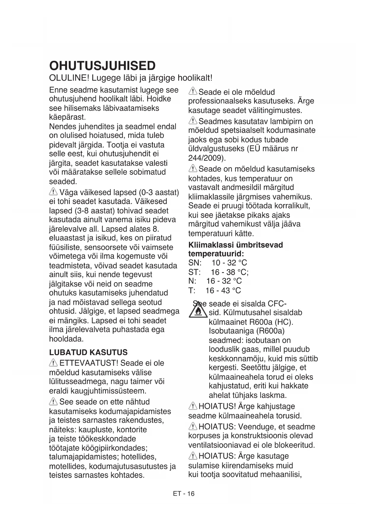 12.Bottle shelf 13.Adjustabledoorshelf* 14.Doorshelves 15.Eggholder *Insomemodels Thispresentationisonlyforinformationaboutthepartsoftheappliance. Partsmayvaryaccordingtotheappliancemodel.ET-16 OHUTUSJUHISED OLULINE!Lugegeläbijajärgigehoolikalt! Enneseadmekasutamistlugegesee ohutusjuhendhoolikaltläbi.Hoidke seehilisemaksläbivaatamiseks käepärast. Nendesjuhenditesjaseadmelendal onolulisedhoiatused,midatuleb pidevaltjärgida.Tootjaeivastuta selleeest,kuiohutusjuhenditei järgita,seadetkasutataksevalesti võimäärataksesellelesobimatud seaded. Vägaväikesedlapsed(0-3aastat) eitohiseadetkasutada.Väikesed lapsed(3-8aastat)tohivadseadet kasutadaainultvanemaisikupideva järelevalveall.Lapsedalates8. eluaastastjaisikud,kesonpiiratud füüsiliste,sensoorsetevõivaimsete võimetegavõiilmakogemustevõi teadmisteta,võivadseadetkasutada ainultsiis,kuinendetegevust jälgitaksevõineidonseadme ohutukskasutamiseksjuhendatud janadmõistavadsellegaseotud ohtusid.Jälgige,etlapsedseadmega eimängiks.Lapsedeitohiseadet ilmajärelevalvetapuhastadaega hooldada. LUBATUD KASUTUS ETTEVAATUST!Seadeeiole mõeldudkasutamiseksvälise lülitusseadmega,nagutaimervõi eraldikaugjuhtimissüsteem. Seeseadeonettenähtud kasutamisekskodumajapidamistes jateistessarnastesrakendustes, näiteks:kaupluste,kontorite ja teiste töökeskkondade töötajateköögipiirkondades; talumajapidamistes;hotellides, motellides,kodumajutusasutustesja teistessarnasteskohtades. Seadeeiolemõeldud professionaalsekskasutuseks.Ärge kasutageseadetvälitingimustes. Seadmeskasutatavlambipirnon mõeldudspetsiaalseltkodumasinate jaoksegasobikodustubade üldvalgustuseks(EÜmäärusnr 244/2009). Seadeonmõeldudkasutamiseks kohtades,kustemperatuuron vastavaltandmesildilmärgitud kliimaklassilejärgmisesvahemikus. Seadeeipruugitöötadakorralikult, kuiseejäetaksepikaksajaks märgitudvahemikustväljajääva temperatuurikätte. Kliimaklassi ümbritsevad temperatuurid: SN: 10-32°C ST: 16-38°C; N: 16-32°C T: 16-43°C SeeseadeeisisaldaCFC- sid.Külmutusahelsisaldab külmaainetR600a(HC). Isobutaaniga(R600a) seadmed:isobutaanon looduslikgaas,millelpuudub keskkonnamõju,kuidmissüttib kergesti.Seetõttujälgige,et külmaaineahelatorudeioleks kahjustatud,eritikuihakkate ahelattühjakslaskma. HOIATUS!Ärgekahjustage seadmekülmaaineahelatorusid. HOIATUS:Veenduge,etseadme korpusesjakonstruktsioonisolevad ventilatsiooniavadeioleblokeeritud. HOIATUS:Ärgekasutage sulamisekiirendamiseksmuid kuitootjasoovitatudmehaanilisi,ET-17 elektrilisivõikeemilisivahendeid. HOIATUS:Ärgeasetageseadme sektsioonidesseelektriseadmeid, kuineedeioletootjapoolt selgesõnaliseltlubatudtüüpi. HOIATUS:Veevarustusega mitteühendatudjäävalmistajaidja/ võiveeautomaatevõibtäitaainult joogiveega. Ärgehoidkeseadmesegaselle lähedalplahvatusohtlikkeaineid, näiteksaerosoolipurke,bensiinija muidtuleohtlikkeaineid. Ärgeneelake(mõnemudeliga kaasasolevate)jääpakkidesisu (mittemürgine).Ärgesööge jääkuubikuidvõijääpulkikohepärast nendesügavkülmikustvõtmist, sestneedvõivadpõhjustada külmapõletust. Ärgeneelake(mõnemudeliga kaasasolevate)jääpakkidesisu (mittemürgine).Ärgesööge jääkuubikuidvõijääpulkikohepärast nendesügavkülmikustvõtmist, sestneedvõivadpõhjustada külmapõletust. Ärgehoidkekülmutussektsioonis vedelikegaklaasnõusid,sestneed võivadpuruneda. Ärgeblokeerigeventilaatorit(kuisee onpaigaldatud)toiduainetega. Kontrolligepärasttoidukülmikusse asetamist,kassektsioonideuksed, eritisügavkülmikuuks,sulguvad korralikult. Kahjustatudtihendtuleb võimalikultkiirestiväljavahetada. Kasutagekülmikusektsiooniainult värsketoiduningkülmutussektsiooni ainultkülmutatudtoiduhoidmiseks, värsketoidukülmutamiseksja jääkuubikutetegemiseks. Vältigekatmatatoiduhoidmist otseseskontaktiskülmiku-või külmutussektsioonisisepindadega. Seadmetelvõivadollaspetsiaalsed sektsioonid(värsketoidusektsioon, null-kraadikastjms). Kui konkreetses tootejuhendis ei olemärgitudteisiti,võibsellised sektsioonideemaldadaseadme toimimisnäitajaidmõjutamata. C-pentaanikasutatakse isolatsioonivahus puhumisvahendinajaseeon kergestisüttivgaas. PAIGALDAMINE Seadetpeabtõstmaja paigaldamakaksvõienam inimest,etvältidavigastusteohtu. Lahtipakkimiseksjapaigaldamiseks kasutagekindaid,etvältida sisselõikamisohtu. Paigaldustööde,sealhulgas veeühenduse(olemasolukorral)ja elektriühenduseningremonditööde eestpeabhooltkandmavastava väljaõppegatehnik.Ärgeparandage egaasendagemõndaseadme osa,kuisedakasutusjuhendis otseselteisoovitata!Hoidke lapsedpaigaldamisekäigus seadmesteemal.Veendugepärast seadmelahtipakkimist,etseeei oletransportimiselvigasaanud. Probleemideesinemiselvõtke ühendustedasimüüjavõilähima teenindusega.Kuipaigalduson lõpetatud,tulebpakkematerjali (kile,vahtplastjms)hoidalaste käeulatusesteemal,etvältida lämbumisohtu.Ennepaigaldamist tulebseadevooluvõrgustlahti ühendada,etvältidaelektrilöögiohtu. Jälgigepaigaldamiseajal,et seadeeikahjustakstoitejuhet,ET-18 vastaseljuhulvõibtekkidatule-või elektrilöögioht.Aktiveerigeseade allessiis,kuipaigaldamineon lõpetatud. Olgeettevaatlik,et seadmeliigutamiselmitte põrandakattematerjali(ntparketti) kahjustada. Paigaldageseadeseadmekaalu arvestadespiisavalttugevale põrandalejaseadmesuurusele jakasutuselesobivassekohta. Paigaldamiseltulebveenduda, et seade ei asetse soojusallika lähedusesjaetsellekõikneli jalgatoetuvadkindlaltpõrandale. Vajaduse korral kohendage asetust jakontrolligevesiloodiga,kasseade onrõhtloodis.Oodakeenneseadme sisselülitamistvähemaltkakstundi, etollakindelkülmaaineahela täiestöövalmiduses.Kõikseadme paigaldamiseksvajalikudmõõdudja vahemaadleiatepaigaldusjuhendist. HOIATUS!Seadmepaigaldamisel pidagesilmas,ettoitejuheeijääks kinniegaolekskahjustatud. HOIATUS!Vältimaks ebastabiilsusesttulenevaidohte, tulebseadepaigutadavõikinnitada vastavalttootjajuhistele. Külmikuteitohipaigutadanii,et gaasipliidimetallvoolikvõimetallist gaasi-võiveetorudvõiel