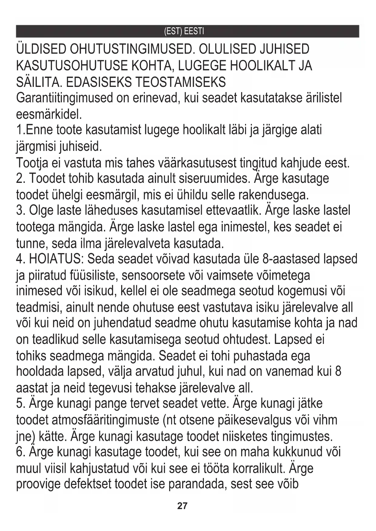 tootega mängida. Ärge laske lastel ega inimestel, kes seadet ei tunne, seda ilma järelevalveta kasutada. Garantiitingimused on erinevad, kui seadet kasutatakse ärilistel eesmärkidel.