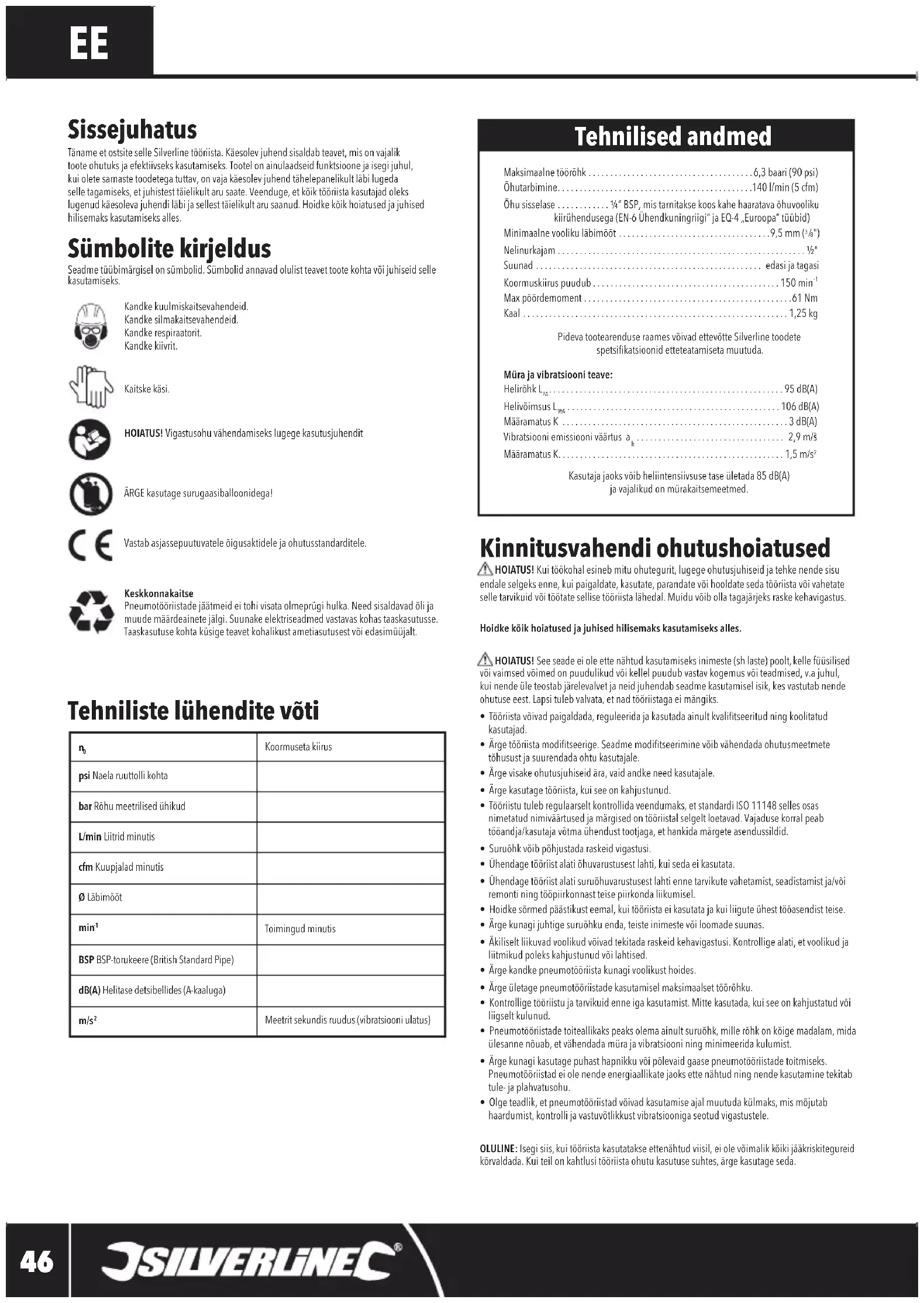 Sissejuhatus Täname et ostsite selle Silverline tööriista. Käesolev juhend sisaldab teavet, mis on vajalik toote ohutuks ja efektiivseks kasutamiseks. Tootel on ainulaadseid funktsioone ja isegi juhul, kui olete sarnaste toodetega tuttav, on vaja käesolev juhend tähelepanelikult läbi lugeda selle tagamiseks, et juhistest täielikult aru saate. Veenduge, et kõik tööriista kasutajad oleks lugenud käesoleva juhendi läbi ja sellest täielikult aru saanud. Hoidke kõik hoiatused ja juhised hilisemaks kasutamiseks alles. Tehnilised andmed Kinnitusvahendi ohutushoiatused HOIATUS! Kui töökohal esineb mitu ohutegurit, lugege ohutusjuhiseid ja tehke nende sisu endale selgeks enne, kui paigaldate, kasutate, parandate või hooldate seda tööriista või vahetate selle tarvikuid või töötate sellise tööriista lähedal. Muidu võib olla tagajärjeks raske kehavigastus.Hoidke kõik hoiatused ja juhised hilisemaks kasutamiseks alles. HOIATUS! See seade ei ole ette nähtud kasutamiseks inimeste (sh laste) poolt, kelle füüsilised või vaimsed võimed on puudulikud või kellel puudub vastav kogemus või teadmised, v.a juhul, kui nende üle teostab järelevalvet ja neid juhendab seadme kasutamisel isik, kes vastutab nende ohutuse eest. Lapsi tuleb valvata, et nad tööriistaga ei mängiks.• Tööriista võivad paigaldada, reguleerida ja kasutada ainult kvalitseeritud ning koolitatud kasutajad.• Ärge tööriista moditseerige. Seadme moditseerimine võib vähendada ohutusmeetmete tõhusust ja suurendada ohtu kasutajale.• Ärge visake ohutusjuhiseid ära, vaid andke need kasutajale.• Ärge kasutage tööriista, kui see on kahjustunud.• Tööriistu tuleb regulaarselt kontrollida veendumaks, et standardi ISO 11148 selles osas nimetatud nimiväärtused ja märgised on tööriistal selgelt loetavad. Vajaduse korral peab tööandja/kasutaja võtma ühendust tootjaga, et hankida märgete asendussildid.• Suruõhk võib põhjustada raskeid vigastusi.• Ühendage tööriist alati õhuvarustusest lahti, kui seda ei kasutata.• Ühendage tööriist alati suruõhuvarustusest lahti enne tarvikute vahetamist, seadistamist ja/või remonti ning tööpiirkonnast teise piirkonda liikumisel.• Hoidke sõrmed päästikust eemal, kui tööriista ei kasutata ja kui liigute ühest tööasendist teise.• Ärge kunagi juhtige suruõhku enda, teiste inimeste või loomade suunas.• Äkiliselt liikuvad voolikud võivad tekitada raskeid kehavigastusi. Kontrollige alati, et voolikud ja liitmikud poleks kahjustunud või lahtised.• Ärge kandke pneumotööriista kunagi voolikust hoides.• Ärge ületage pneumotööriistade kasutamisel maksimaalset töörõhku.• Kontrollige tööriistu ja tarvikuid enne iga kasutamist. Mitte kasutada, kui see on kahjustatud või liigselt kulunud.• Pneumotööriistade toiteallikaks peaks olema ainult suruõhk, mille rõhk on kõige madalam, mida ülesanne nõuab, et vähendada müra ja vibratsiooni ning minimeerida kulumist.• Ärge kunagi kasutage puhast hapnikku või põlevaid gaase pneumotööriistade toitmiseks. Pneumotööriistad ei ole nende energiaallikate jaoks ette nähtud ning nende kasutamine tekitab tule- ja plahvatusohu.• Olge teadlik, et pneumotööriistad võivad kasutamise ajal muutuda külmaks, mis mõjutab haardumist, kontrolli ja vastuvõtlikkust vibratsiooniga seotud vigastustele. OLULINE: Isegi siis, kui tööriista kasutatakse ettenähtud viisil, ei ole võimalik kõiki jääkriskitegureid kõrvaldada. Kui teil on kahtlusi tööriista ohutu kasutuse suhtes, ärge kasutage seda. Sümbolite kirjeldus Seadme tüübimärgisel on sümbolid. Sümbolid annavad olulist teavet toote kohta või juhiseid selle kasutamiseks.Kandke kuulmiskaitsevahendeid. Kandke silmakaitsevahendeid. Kandke respiraatorit. Kandke kiivrit.Kaitske käsi. HOIATUS! Vigastusohu vähendamiseks lugege kasutusjuhendit ÄRGE kasutage surugaasiballoonidega!Vastab asjassepuutuvatele õigusaktidele ja ohutusstandarditele.Keskkonnakaitse Pneumotööriistade jäätmeid ei tohi visata olmeprügi hulka. Need sisaldavad õli ja muude määrdeainete jälgi. Suunake elektriseadmed vastavas kohas taaskasutusse. Taaskasutuse kohta küsige teavet kohalikust ametiasutusest või edasimüüjalt.