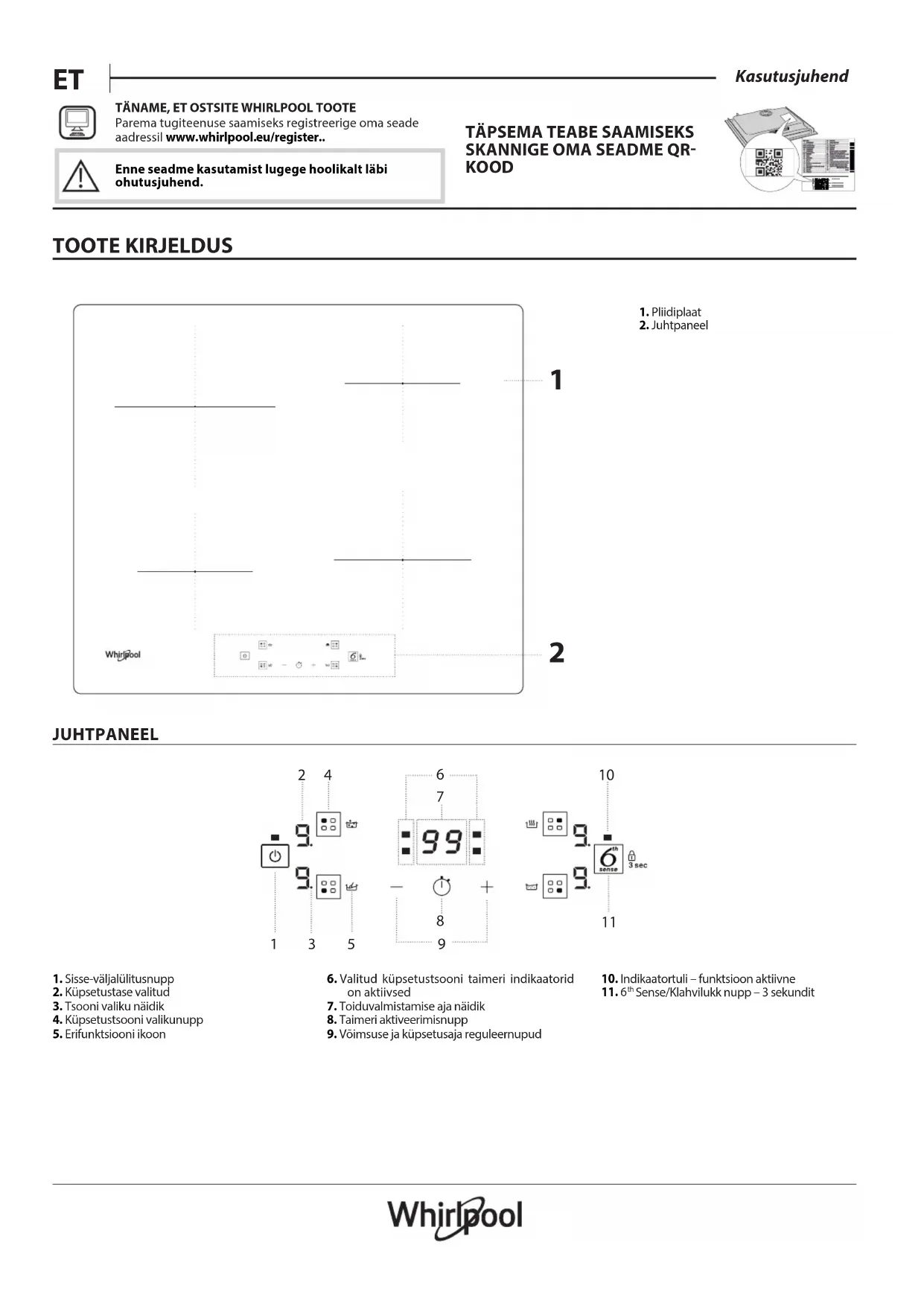 1. Sisse-väljalülitusnupp2. Küpsetustase valitud3. Tsooni valiku näidik4. Küpsetustsooni valikunupp5. Erifunktsiooni ikoon6. Valitud küpsetustsooni taimeri indikaatorid on aktiivsed7. Toiduvalmistamise aja näidik8. Taimeri aktiveerimisnupp9. Võimsuse ja küpsetusaja reguleernupud10. Indikaatortuli – funktsioon aktiivne11. 6 Sense/Klahvilukk nupp – 3sekunditTÄNAME, ET OSTSITE WHIRLPOOL TOOTEParema tugiteenuse saamiseks registreerige oma seade aadressil www.whirlpool.eu/register..