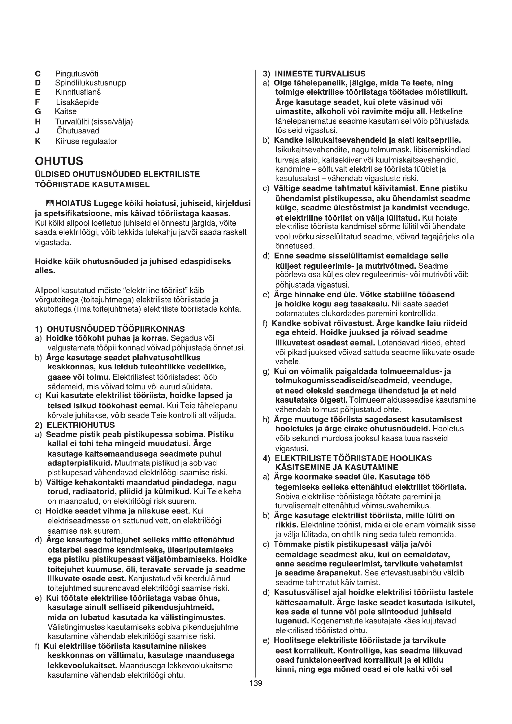a) Ärge koormake seadet üle. Kasutage töö tegemiseks selleks ettenähtud elektrilist tööriista. Sobiva elektrilise tööriistaga töötate paremini ja turvalisemalt ettenähtud võimsusvahemikus. b) Ärge kasutage elektrilist tööriista, mille lüliti on rikkis. Elektriline tööriist, mida ei ole enam võimalik sisse ja välja lülitada, on ohtlik ning seda tuleb remontida. c) Tõmmake pistik pistikupesast välja ja/või eemaldage seadmest aku, kui on eemaldatav, enne seadme reguleerimist, tarvikute vahetamist ja seadme ärapanekut. See ettevaatusabinõu väldib seadme tahtmatut käivitamist. d) Kasutusvälisel ajal hoidke elektrilisi tööriistu lastele kättesaamatult. Ärge laske seadet kasutada isikutel, kes seda ei tunne või pole siintoodud juhiseid lugenud. Kogenematute kasutajate käes kujutavad elektrilised tööriistad ohtu. e) Hoolitsege elektriliste tööriistade ja tarvikute eest korralikult. Kontrollige, kas seadme liikuvad osad funktsioneerivad korralikult ja ei kiildu kinni, ning ega mõned osad ei ole katki või sel C Pingutusvõti D Spindlilukustusnupp E Kinnitusanš F Lisakäepide G Kaitse H Turvalüliti (sisse/välja) J Õhutusavad K Kiiruse regulaator OHUTUS