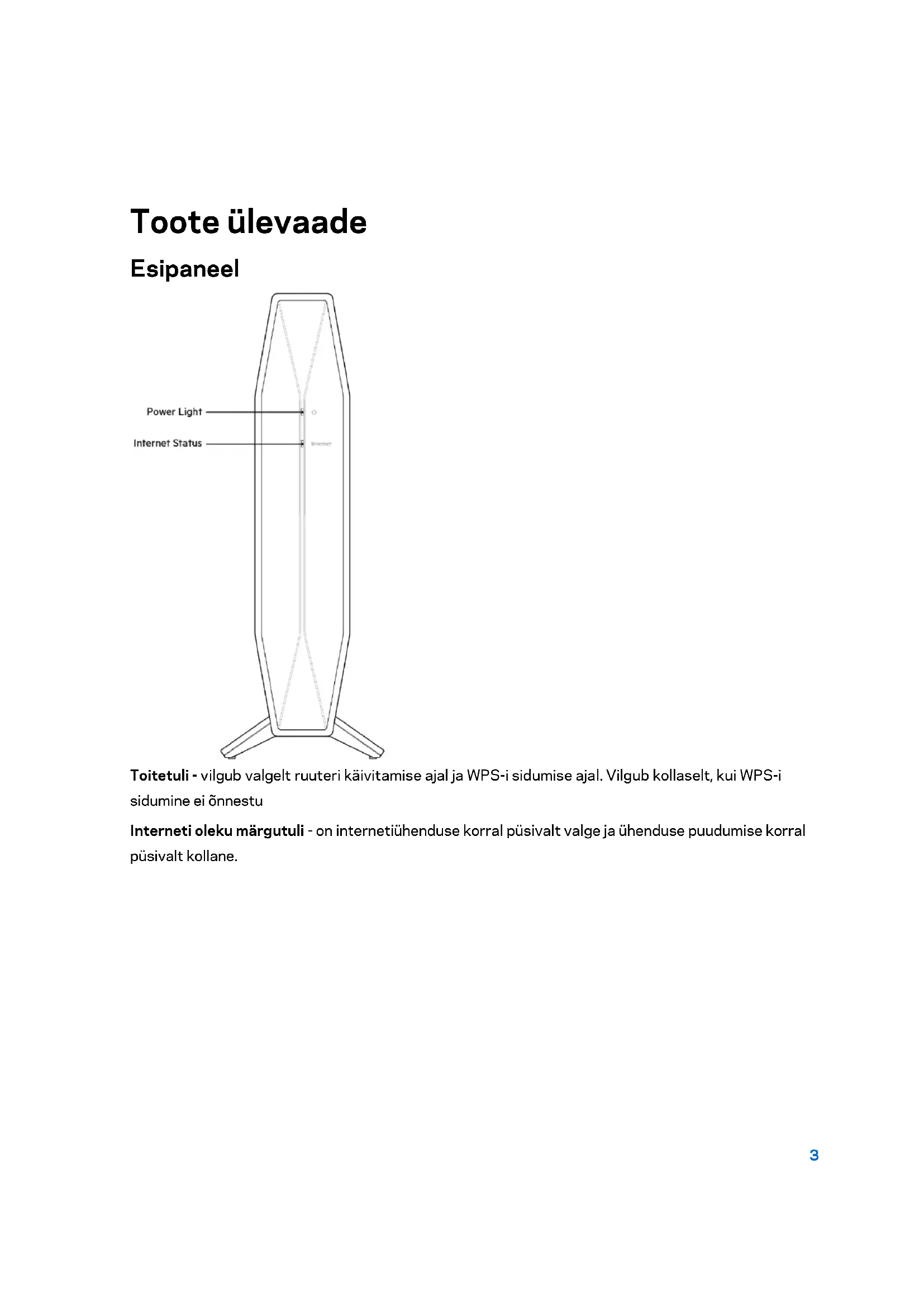 Disabled (keelatud) Valige, kui teil ei ole oma võrgus Wireless-B, Wireless-G ja Wireless-N (2,4 GHz) seadmeid. Märkus – saate valida Mixed, Wireless-A/N Only või Disabled laineala 5 GHz jaoks. Kui te ei ole kindel, millist režiimi valida, hoidke vaikimisi Mixed.14 Võrgu nimi (SSID) Teenuse komplekti identifikaator (SSID) on nimi, mida seadmed kasutavad juhtmeta võrguga ühenduse loomiseks. SSIDd on registritundlik ja see ei tohi ületada 32 tähemärki. 2,4 GHz ja 5 GHz võrkude vaikimisi SSID-d on vastavalt BelkinXXXXX ja BelkinXXXXX_5GHz. X-id tähistavad viimast viite ruuteri seerianumbri arvu, mille leiate ruuteri alt. Kui muudate SSID-d, on mõlemal lainealal uued SSID-d. Võite anda neile erineva nime brauseripõhise kasutajaliidese kaudu. Märkus – kui taastate ruuteri tehase vaikeseadetele (vajutades Lähtestamisnuppu või kasutate ekraani Administration > Factory Defaults), naaseb võrgunimi vaikeväärtusele. Muutke võrgunimi tagasi originaalnimeks või peate ühendama kõik seadmed oma juhtmeta võrguühenduses uue võrgunimega. Kanali laius Hoidke vaikimisi Auto (20 MHz või 40 MHz), et tagada 2,4 GHz võrgu parim jõudlus, kasutades Wireless-B, Wireless-G ja Wireless-N (2,4 GHz) seadmeid. Kui kanali laius on 20 MHz, valige ainult 20 MHz. Parima jõudluse saavutamiseks 5 GHz võrgus hoidke vaikimisi 20, 40 või 80 MHz. Kanal Valige rippmenüüst kanal. Kui te pole kindel, millist kanalit valida, hoidke vaikeseade Auto. SSID-saatmine Ruuteri SSID edastamiseks hoidke vaikeseadeks Enabled (Lubatud). Kui juhtmeta kliendid uurivad juhtmeta võrkude kohalikku ala, siis nad tuvastavad ruuteri poolt edastatava SSID. WiFi nime peitmine ei tee teie WiFi-d turvalisemaks. Igaüks, kes on tõesti huvitatud teie võrgule juurdepääsemisest, võib selle leida isegi siis, kui te selle funktsiooni välja lülitate. Kui te ikka ei soovi marsruuteri SSID-d edastada, valige Disabled (Keelatud).15 Juhtmeta ühenduse turvalisus Ruuter pakub järgmisi juhtmeta turvasuvandeid: WPA3 Personal / WPA2 Personal / WPA2 Enterprise (WPA tähendab Wi-Fi Protected Access - WiFi kaitstud ligipääs.) Turbe valik Tugevus WPA3 Personal Tugevaim WPA3/WPA2 Personal WPA2 Personal WPA2 Enterprise Turvasuvandite seaded WPA2 Personal Kui valite WPA2 Personal, PEAVAD kõik teie juhtmeta võrgu seadmed kasutama WPA2 Personali ja sama parooli. Parool - -- sisestage 8-63 tähemärgist koosnev parool. See on WiFi-parool, mis tagab võrgule juurdepääsu. See võib olla sama, mis sisestati seadistamisel. Disabled (keelatud) Kui otsustate juhtmeta turvalisuse keelata, teavitatakse teid sellest, et juhtmeta turvalisus on keelatud, interneti esmakordsel kasutamisel. Teile antakse valida, kas lubada juhtmeta ühenduse turvalisust või kinnitada, et olete teadlik riskidest, kuid soovite sellegipoolest jätkata ilma juhtmeta ühenduse turvalisuseta.16 Tõrkeotsing Lisateavet saate meie auhinnatud klienditoelt aadressil Belkin.com/support/RT1800. Teie ruuteri seadistamine ebaõnnestus Kui te ei suutnud brauseripõhises liideses seadistamist lõpule viia, võite proovida järgmist.
