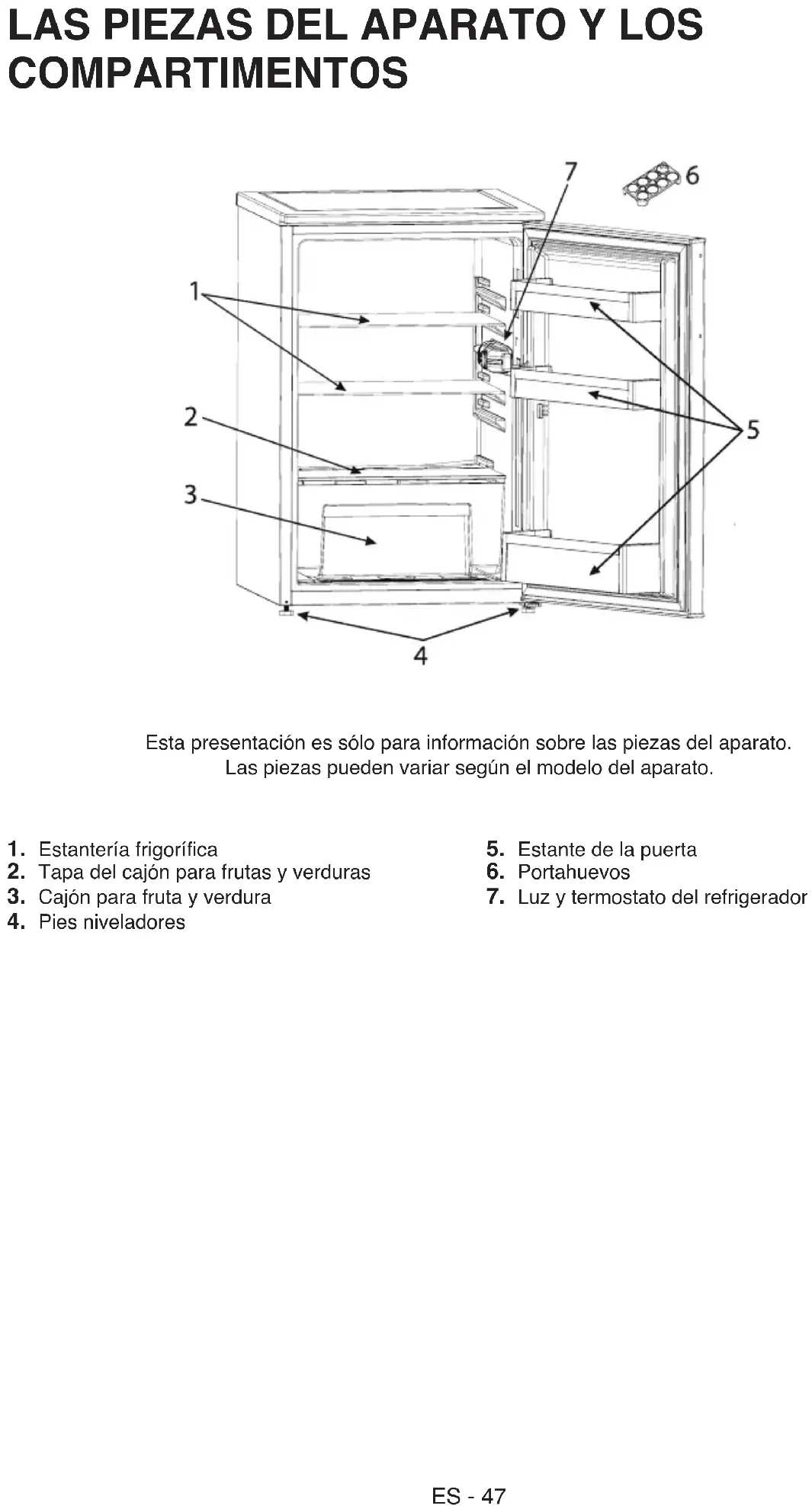 Esta presentación es sólo para información sobre las piezas del aparato. Las piezas pueden variar según el modelo del aparato.ET - 48 OHUTUSJUHISED OLULINE! Lugege läbi ja järgige hoolikalt! Enne seadme kasutamist lugege see ohutusjuhend hoolikalt läbi. Hoidke see hilisemaks läbivaatamiseks käepärast. Nendes juhendites ja seadmel endal on olulised hoiatused, mida tuleb pidevalt järgida. Tootja ei vastuta selle eest, kui ohutusjuhendit ei järgita, seadet kasutatakse valesti või määratakse sellele sobimatud seaded. Väga väikesed lapsed (0-3 aastat) ei tohi seadet kasutada. Väikesed lapsed (3-8 aastat) tohivad seadet kasutada ainult vanema isiku pideva järelevalve all. Lapsed alates 8. eluaastast ja isikud, kes on piiratud füüsiliste, sensoorsete või vaimsete võimetega või ilma kogemuste või teadmisteta, võivad seadet kasutada ainult siis, kui nende tegevust jälgitakse või neid on seadme ohutuks kasutamiseks juhendatud ja nad mõistavad sellega seotud ohtusid. Jälgige, et lapsed seadmega ei mängiks. Lapsed ei tohi seadet ilma järelevalveta puhastada ega hooldada. Lapsed vanuses 3-8 aastat võivad külmkapi seadmeid peale ja maha laadida. LUBATUD KASUTUS ETTEVAATUST! Seade ei ole mõeldud kasutamiseks välise lülitusseadmega, nagu taimer või eraldi kaugjuhtimissüsteem. See seade on ette nähtud kasutamiseks kodumajapidamistes ja teistes sarnastes rakendustes, näiteks: kaupluste, kontorite ja teiste töökeskkondade töötajate köögipiirkondades; talumajapidamistes; hotellides, motellides, kodumajutusasutustes ja teistes sarnastes kohtades. Seade ei ole mõeldud professionaalseks kasutuseks. Ärge kasutage seadet välitingimustes. Seadmes kasutatav lambipirn on mõeldud spetsiaalselt kodumasinate jaoks ega sobi kodus tubade üldvalgustuseks (EÜ määrus nr 244/2009). Seade on mõeldud kasutamiseks kohtades, kus temperatuur on vastavalt andmesildil märgitud kliimaklassile järgmises vahemikus. Seade ei pruugi töötada korralikult, kui see jäetakse pikaks ajaks märgitud vahemikust välja jääva temperatuuri kätte. Kliimaklassi ümbritsevad temperatuurid: SN: 10 - 32 °C ST: 16 - 38 °C; N: 16 - 32 °C T: 16 - 43 °C See seade ei sisalda CFC- sid. Külmutusahel sisaldab külmaainet R600a (HC). Isobutaaniga (R600a) seadmed: isobutaan on looduslik gaas, millel puudub keskkonnamõju, kuid mis süttib kergesti. Seetõttu jälgige, et külmaaineahela torud ei oleks kahjustatud, eriti kui hakkate ahelat tühjaks laskma. HOIATUS! Ärge kahjustageET - 49 seadme külmaaineahela torusid. HOIATUS: Veenduge, et seadme korpuses ja konstruktsioonis olevad ventilatsiooniavad ei ole blokeeritud. HOIATUS: Ärge kasutage sulamise kiirendamiseks muid kui tootja soovitatud mehaanilisi, elektrilisi või keemilisi vahendeid. HOIATUS: Ärge asetage seadme sektsioonidesse elektriseadmeid, kui need ei ole tootja poolt selgesõnaliselt lubatud tüüpi. HOIATUS: Veevarustusega mitteühendatud jäävalmistajaid ja/ või veeautomaate võib täita ainult joogiveega. HOIATUS: Automaatsed jäävalmistajad ja/või veeautomaadid tohib ühendada ainult joogiveetorustikuga, kus veesurve on vahemikus 0,17-0,81 mPa (1,7- 8,1 bar). Ärge hoidke seadmes ega selle lähedal plahvatusohtlikke aineid, näiteks aerosoolipurke, bensiini ja muid tuleohtlikke aineid. Ärge neelake (mõne mudeliga kaasasolevate) jääpakkide sisu (mittemürgine). Ärge sööge jääkuubikuid või jääpulki kohe pärast nende sügavkülmikust võtmist, sest need võivad põhjustada külmapõletust. Ärge neelake (mõne mudeliga kaasasolevate) jääpakkide sisu (mittemürgine). Ärge sööge jääkuubikuid või jääpulki kohe pärast nende sügavkülmikust võtmist, sest need võivad põhjustada külmapõletust. Ärge hoidke külmutussektsioonis vedelikega klaasnõusid, sest need võivad puruneda. Ärge blokeerige ventilaatorit (kui see on paigaldatud) toiduainetega. Kontrollige pärast toidu külmikusse asetamist, kas sektsioonide uksed, eriti sügavkülmiku uks, sulguvad korralikult. Kahjustatud tihend tuleb võimalikult kiiresti välja vahetada. Kasutage külmikusektsiooni ainult värske toidu ning külmutussektsiooni ainult külmutatud toidu hoidmiseks, värske toidu külmutamiseks ja jääkuubikute tegemiseks. Vältige katmata toidu hoidmist otseses kontaktis külmiku- või külmutussektsiooni sisepindadega. Seadmetel võivad olla spetsiaalsed sektsioonid (värske toidu sektsioon, null-kraadi kast jms). Kui konkreetses tootejuhendis ei ole märgitud teisiti, võib sellised sektsioonid eemaldada seadme toimimisnäitajaid mõjutamata. C-pentaani kasutatakse isolatsioonivahus puhumisvahendina ja see on kergesti süttiv gaas. Kõige sobilikumad seadme sektsioonid, kus säilitada teatud tüüpi toiduaineid, võttes arvesse erinevat temperatuurijaotust erinevates seadme sektsioonides, on jaotatud järgnevalt: