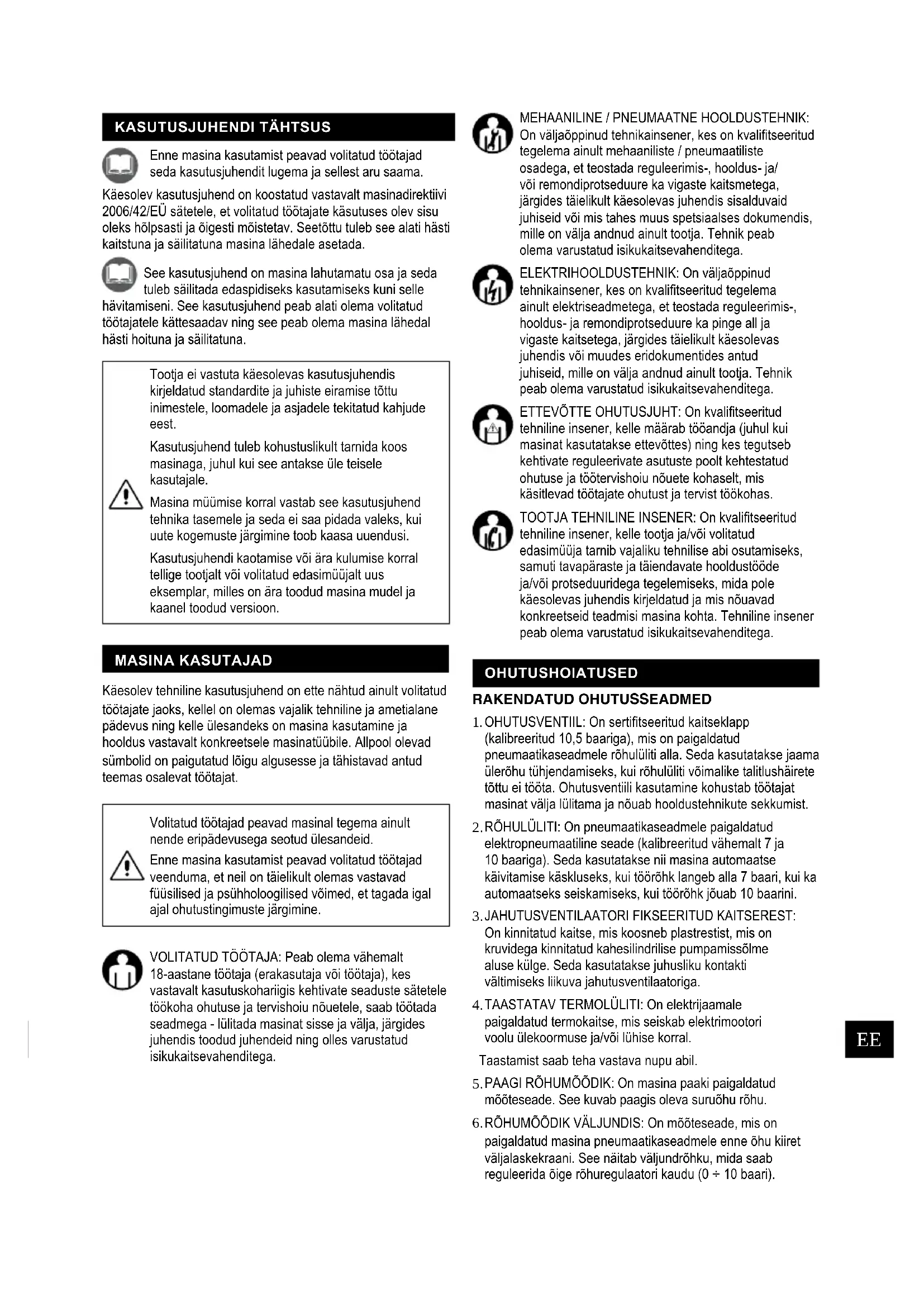 Volitatud töötajad saavad masina sisse lülitada alles pärast kohustuslike kontrollide läbiviimist. Enne selle masina kasutamist peavad volitatud töötajad selle kasutusjuhendi tervikuna läbi lugema ja sellest aru saama. Kasutamise ajal on kohustuslik kontrollida, et volitamata inimesed ei läheks masina lähedale. Volitatud töötajatel ei ole lubatud masinat töötamise ja hooldamise ajal järelevalveta jätta. Põlemisoht juhusliku kokkupuute korral kahesilindrilise pumbasõlme ja elektrimootoriga. Ettevaatust! Seal on jääkrisk. Tootja loobub igasugusest vastutusest inimestele, loomadele ja asjadele tekitatud kahjude eest, mis tulenevad käesolevas juhendis kirjeldatud standardite ja hoiatuste eiramisest. Tootja loobub igasugusest vastutusest töötlemise lõpptulemuse eest, kuna see sõltub ainult kasutatud tööriista tüübist ja volitatud töötajate professionaalsetest oskustest.