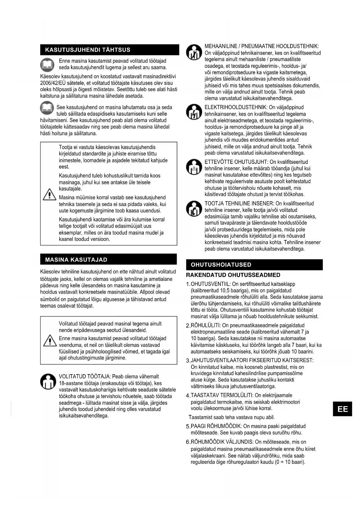 Volitatud töötajad saavad masina sisse lülitada alles pärast kohustuslike kontrollide läbiviimist. Enne selle masina kasutamist peavad volitatud töötajad selle kasutusjuhendi tervikuna läbi lugema ja sellest aru saama. Kasutamise ajal on kohustuslik kontrollida, et volitamata inimesed ei läheks masina lähedale. Volitatud töötajatel ei ole lubatud masinat töötamise ja hooldamise ajal järelevalveta jätta. Põlemisoht juhusliku kokkupuute korral kahesilindrilise pumbasõlme ja elektrimootoriga. Ettevaatust! Seal on jääkrisk. Tootja loobub igasugusest vastutusest inimestele, loomadele ja asjadele tekitatud kahjude eest, mis tulenevad käesolevas juhendis kirjeldatud standardite ja hoiatuste eiramisest. Tootja loobub igasugusest vastutusest töötlemise lõpptulemuse eest, kuna see sõltub ainult kasutatud tööriista tüübist ja volitatud töötajate professionaalsetest oskustest.