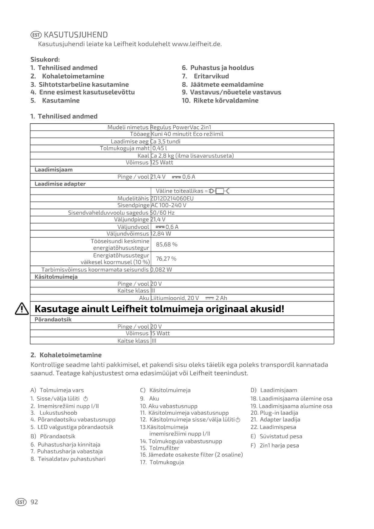 Lugupeetud klient, Me õnnitleme teid teie uue aku-tolmuimeja Regulus PowerVac 2in1 ostu puhul. Ostes selle kõrgekvaliteedilise Leifheiti toote, olete teinud suurepärase valiku. Palun lugege kasutusjuhend enne toote kasutusele võttu läbi ja säilitage see edasiseks kasutamiseks või järgmise omaniku jaoks. See aitab teil seadet algusest peale hästi ja õigesti kasutada ja töötamisel vigu vältida. Palun jälgige eriti täpselt selles kasutusjuhendis olevaid ohutusnõudeid. Me loodame väga, et te olete oma aku-tolmuimejaga rahul. Kui teil on meie toote kohta küsimusi või ettepanekuid, siis palun helistage meile. Leifheiti meeskond on alati teie käsutuses. Rahvusvaheline telefon: +49 2604 977 0 Esmaspäevast reedeni 8.00 kuni 18.00 Kesk-Euroopa aja järgi. Kui te soovite meiega kirjalikult kontakti saada, siis leiate kontaktfor