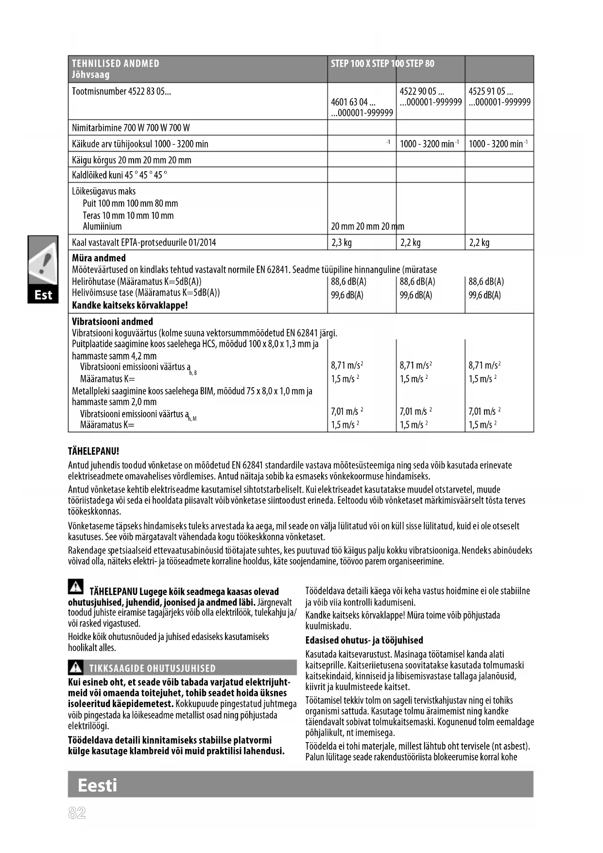 TÄHELEPANU! Antud juhendis toodud võnketase on mõõdetud EN 62841 standardile vastava mõõtesüsteemiga ning seda võib kasutada erinevate elektriseadmete omavahelises võrdlemises. Antud näitaja sobib ka esmaseks võnkekoormuse hindamiseks. Antud võnketase kehtib elektriseadme kasutamisel sihtotstarbeliselt. Kui elektriseadet kasutatakse muudel otstarvetel, muude tööriistadega või seda ei hooldata piisavalt võib võnketase siintoodust erineda. Eeltoodu võib võnketaset märkimisväärselt tõsta terves töökeskkonnas. Võnketaseme täpseks hindamiseks tuleks arvestada ka aega, mil seade on välja lülitatud või on küll sisse lülitatud, kuid ei ole otseselt kasutuses. See võib märgatavalt vähendada kogu töökeskkonna võnketaset. Rakendage spetsiaalseid ettevaatusabinõusid töötajate suhtes, kes puutuvad töö käigus palju kokku vibratsiooniga. Nendeks abinõudeks võivad olla, näiteks elektri- ja tööseadmete korraline hooldus, käte soojendamine, töövoo parem organiseerimine. TÄHELEPANU Lugege kõik seadmega kaasas olevad ohutusjuhised, juhendid, joonised ja andmed läbi. Järgnevalt toodud juhiste eiramise tagajärjeks võib olla elektrilöök, tulekahju ja/ või rasked vigastused. Hoidke kõik ohutusnõuded ja juhised edasiseks kasutamiseks hoolikalt alles. TIKKSAAGIDE OHUTUSJUHISED Kui esineb oht, et seade võib tabada varjatud elektrijuht- meid või omaenda toitejuhet, tohib seadet hoida üksnes isoleeritud käepidemetest. Kokkupuude pingestatud juhtmega võib pingestada ka lõikeseadme metallist osad ning põhjustada elektrilöögi. Töödeldava detaili kinnitamiseks stabiilse platvormi külge kasutage klambreid või muid praktilisi lahendusi. Töödeldava detaili käega või keha vastus hoidmine ei ole stabiilne ja võib viia kontrolli kadumiseni. Kandke kaitseks kõrvaklappe! Müra toime võib põhjustada kuulmiskadu. Edasised ohutus- ja tööjuhised Kasutada kaitsevarustust. Masinaga töötamisel kanda alati kaitseprille. Kaitseriietusena soovitatakse kasutada tolmumaski kaitsekindaid, kinniseid ja libisemisvastase tallaga jalanõusid, kiivrit ja kuulmisteede kaitset. Töötamisel tekkiv tolm on sageli tervistkahjustav ning ei tohiks organismi sattuda. Kasutage tolmu äraimemist ning kandke täiendavalt sobivat tolmukaitsemaski. Kogunenud tolm eemaldage põhjalikult, nt imemisega. Töödelda ei tohi materjale, millest lähtub oht tervisele (nt asbest). Palun lülitage seade rakendustööriista blokeerumise korral kohe Est8383 Eesti välja! Ärge lülitage seadet sisse tagasi, kuni rakendustööriist on blokeeritud; seejuures võib kõrge reaktsioonimomendiga tagasilöök tekkida.Tehke ohutusjuhiseid arvesse võttes kindlaks ja kõrvaldage rakendustööriista blokeerumise põhjus. Automaatse seiskumise võimalikud põhjused: