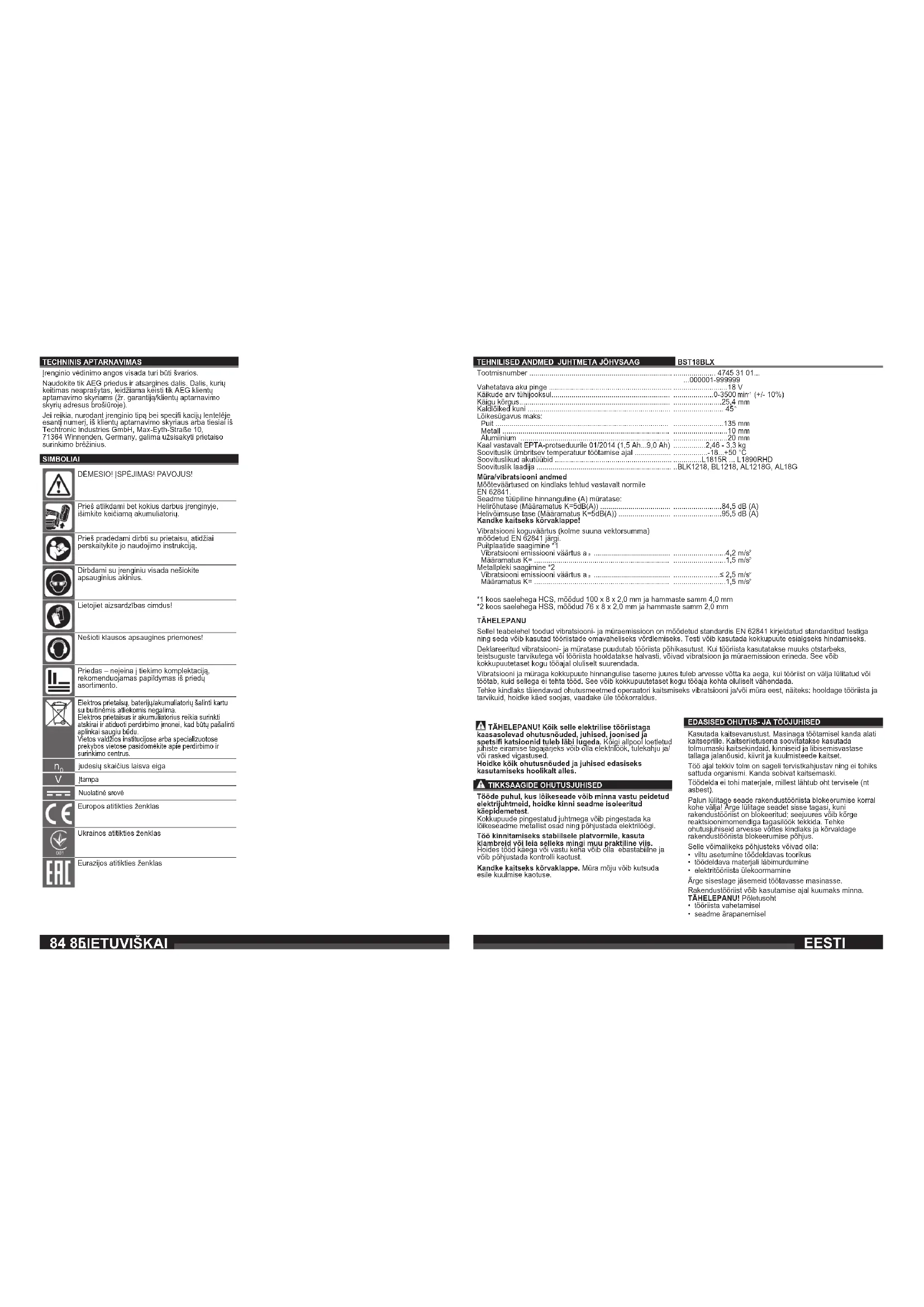 Tikksaag puidu, plasti ja metalli lõikamiseks. Sobib sirg-, kald-, kurv- ning väljalõigeteks. Antud seadet tohib kasutada ainult vastavalt äranäidatud otstarbele. EÜ VASTAVUSAVALDUS Me deklareerime ainuisikuliselt vastutades, et lõigus "Tehnilised andmed“ kirjeldatud toode vastab direktiivide 2011/65/EU (RoHS), 2014/30/EU, 2006/42/EÜ kõigile olulisele tähtsusega eeskirjadele ning järgmistele harmoniseeritud normatiivsetele dokumentidele: EN 62841-1:2015 EN 62841-2-11:2016 EN 55014-1:2017 EN 55014-2:2015 EN IEC 63000:2018 Winnenden, 2019-03-13 Alexander Krug Managing Director On volitatud koostama tehnilist dokumentatsiooni. Techtronic Industries GmbH Max-Eyth-Straße 10 71364 Winnenden Germany TAASKÄIVITUSKAITSE Seade on varustatud taaskäivituskaitseseadisega. See hoiab ära sisselülitatud elektritööriista käivitamise aku panekul seadmesse. Samuti hoiab see ära sisselülitatud tööriista taaskäivitamise pärast voolukatkestust talitlushäire tõttu. Kui saetera ei asu toorikus, lülitage elektriline tööriist välja ning seejärel uuesti sisse, et jätkata töötamist. Kui saetera on tooriku sees, oodake, kuni saetera on täielikult seisma jäänud. Eemaldage aku ja tõmmake saetera lõikest välja. Lülitage elektritööriist välja, pange aku uuesti seadmesse ning lülitage sisse, et jätkata töötamist. SUJUVKÄIVITUS Turvaliseks käsitsemiseks mõeldud elektrooniline sujuvkäivitus takistab masina järsku käivitumist sisselülitamisel. AKUD Pikemat AEGa mittekasutatud akusid laadige veel enne kasutamist. Temperatuur üle 50 °C vähendab vahetatava aku töövõimet. Vältige pikemat soojenemist päikese või kütteseadme mõjul. Hoidke laadija ja vahetatava aku ühenduskontaktid puhtad. Optimaalse patarei eluea tagamiseks, pärast kasutamist lae patareiplokk täielikult. Akud tuleks võimalikult pika kasutusea saavutamiseks pärast täislaadimist laadijast välja võtta. Aku ladustamisel üle 30 päeva: Ladustage akut kuivas kohas u 27°C juures. Ladustage akut u 30-50% laetusseisundis. Laadige aku iga 6 kuu tagant täis. HOOLDUS Hoidke masina õhutuspilud alati puhtad. Kasutage ainult AEG tarvikuid ja tagavaraosi. Detailid, mille väljavahetamist pole kirjeldatud, laske välja vahetada AEG klienditeeninduspunktis (vaadake brošüüri garantii / klienditeeninduste aadressid). Vajaduse korral võite tellida seadme läbilõikejoonise, näidates ära masina tüübi ja andmesildil oleva numbri. Selleks pöörduge klienditeeninduspunkti või otse: Techtronic Industries GmbH, Max-Eyth-Straße 10, 71364 Winnenden, Germany.88 89 BST18BLX