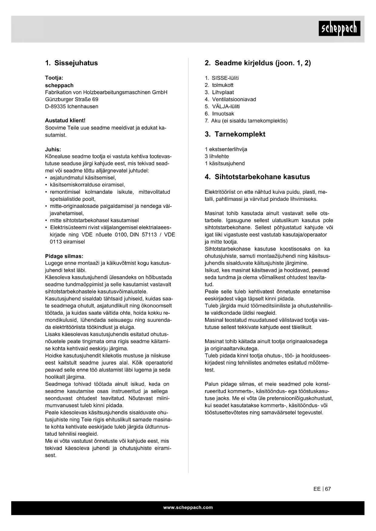 - Elektrisüsteemi rivist väljalangemisel elektrialaees- kirjade ning VDE nõuete 0100, DIN 57113 / VDE 0113 eiramisel Pidage silmas: Lugege enne montaaži ja käikuvõtmist kogu kasutus- juhendi tekst läbi. Käesoleva kasutusjuhendi ülesandeks on hõlbustada seadme tundmaõppimist ja selle kasutamist vastavalt sihtotstarbekohastele kasutusvõimalustele. Kasutusjuhend sisaldab tähtsaid juhiseid, kuidas saa- te seadmega ohutult, asjatundlikult ning ökonoomselt töötada, ja kuidas saate vältida ohte, hoida kokku re- mondikulusid, lühendada seisuaegu ning suurenda- da elektritööriista töökindlust ja eluiga. Lisaks käesolevas kasutusjuhendis esitatud ohutus- nõuetele peate tingimata oma riigis seadme käitami- se kohta kehtivaid eeskirju järgima. Hoidke kasutusjuhendit kilekotis mustuse ja niiskuse eest kaitstult seadme juures alal. Kõik operaatorid peavad selle enne töö alustamist läbi lugema ja seda hoolikalt järgima. Seadmega tohivad töötada ainult isikud, keda on seadme kasutamise osas instrueeritud ja sellega seonduvast ohtudest teavitatud. Nõutavast miini- mumvanusest tuleb kinni pidada. Peale käesolevas käsitsusjuhendis sisalduvate ohu- tusjuhiste ning Teie riigis ehituslikult samade masina- te kohta kehtivate eeskirjade tuleb järgida üldtunnus- tatud tehnilisi reegleid. Me ei võta vastutust õnnetuste või kahjude eest, mis tekivad käesoleva juhendi ja ohutusjuhiste eirami- sest.www.scheppach.com