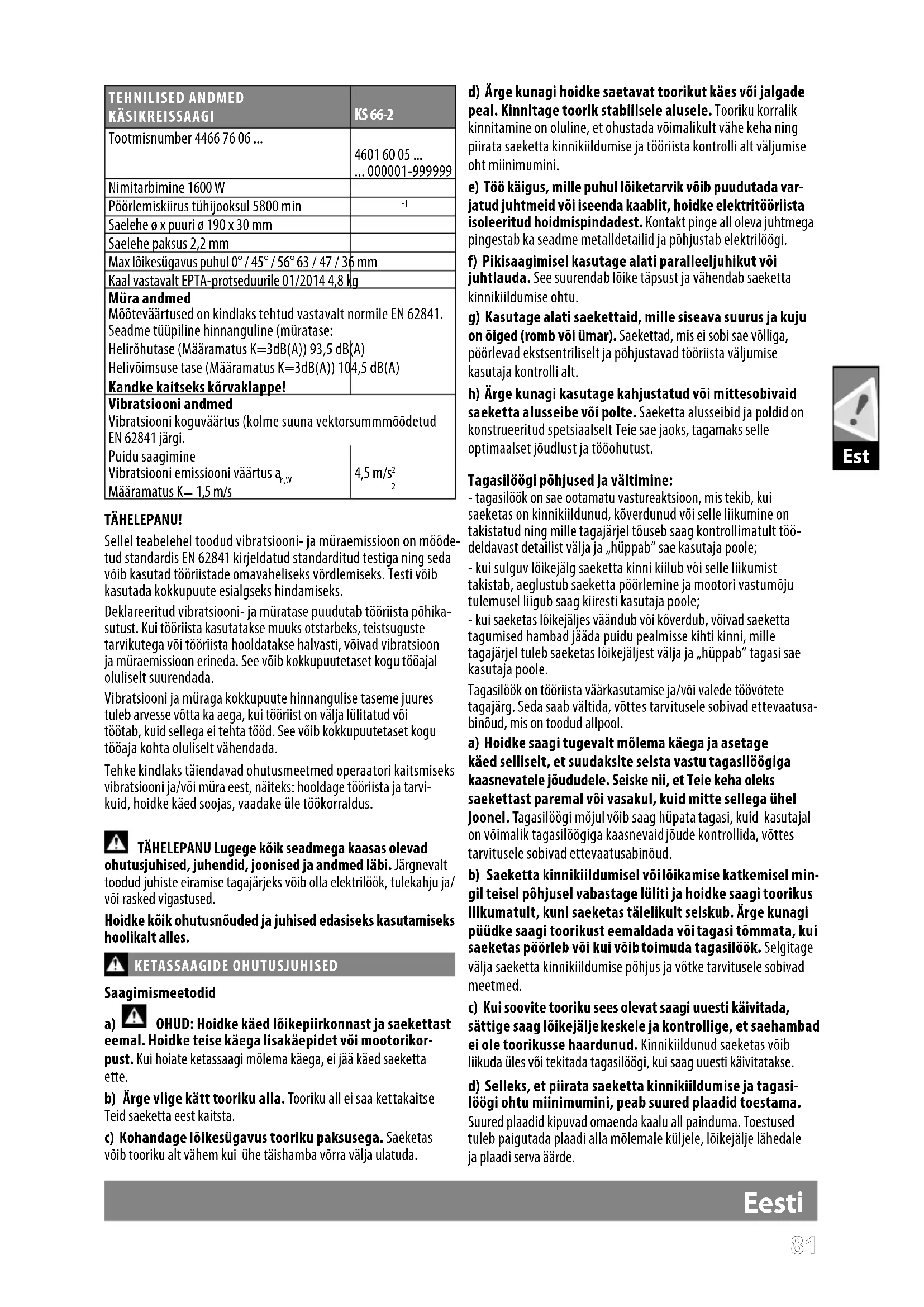 Saelehe ø x puuri ø 190 x 30 mm Saelehe paksus 2,2 mm Max lõikesügavus puhul 0° / 45° / 56° 63 / 47 / 36 mm Kaal vastavalt EPTA-protseduurile 01/2014 4,8 kg Müra andmed Mõõteväärtused on kindlaks tehtud vastavalt normile EN 62841. Seadme tüüpiline hinnanguline (müratase: Helirõhutase (Määramatus K=3dB(A)) 93,5 dB(A) Helivõimsuse tase (Määramatus K=3dB(A)) 104,5 dB(A) Kandke kaitseks kõrvaklappe! Vibratsiooni andmed Vibratsiooni koguväärtus (kolme suuna vektorsummmõõdetud EN 62841 järgi. Puidu saagimine Vibratsiooni emissiooni väärtus a h,W 4,5 m/s