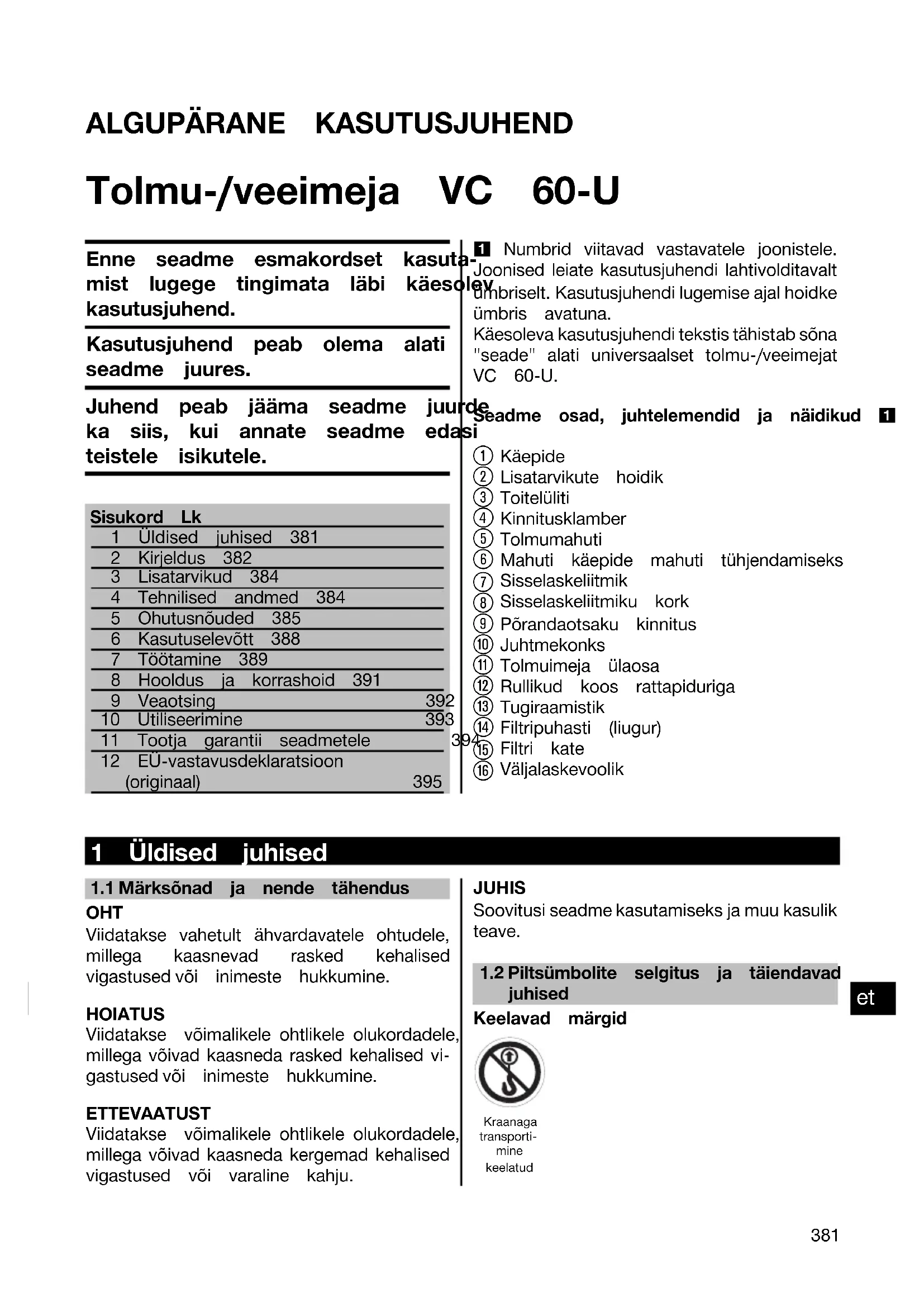 Printed: 05.12.2013 | Doc-Nr: PUB / 5071295 / 000 / 02ALGUPÄRANE KASUTUSJUHEND Tolmu-/veeimeja VC 60‑U Enne seadme esmakordset kasuta-mist lugege tingimata läbi käesolevkasutusjuhend.Kasutusjuhend peab olema alatiseadme juures.Juhend peab jääma seadme juurdeka siis, kui annate seadme edasiteistele isikutele.Sisukord Lk1 Üldised juhised 3812 Kirjeldus 3823 Lisatarvikud 3844 Tehnilised andmed 3845 Ohutusnõuded 3856 Kasutuselevõtt 3887 Töötamine 3898 Hooldus ja korrashoid 3919 Veaotsing 39210 Utiliseerimine 39311 Tootja garantii seadmetele 39412 EÜ-vastavusdeklaratsioon(originaal) 395 1 Numbrid viitavad vastavatele joonistele. Joonised leiate kasutusjuhendi lahtivolditavalt ümbriselt. Kasutusjuhendi lugemise ajal hoidke ümbris avatuna. Käesoleva kasutusjuhendi tekstis tähistab sõna "seade" alati universaalset tolmu-/veeimejat VC 60‑U.Seadme osad, juhtelemendid ja näidikud 1 Käepide Lisatarvikute hoidik Toitelüliti Kinnitusklamber Tolmumahuti Mahuti käepide mahuti tühjendamiseks Sisselaskeliitmik Sisselaskeliitmiku kork Põrandaotsaku kinnitus Juhtmekonks Tolmuimeja ülaosa Rullikud koos rattapiduriga Tugiraamistik Filtripuhasti (liugur) Filtri kate Väljalaskevoolik 1 Üldised juhised
