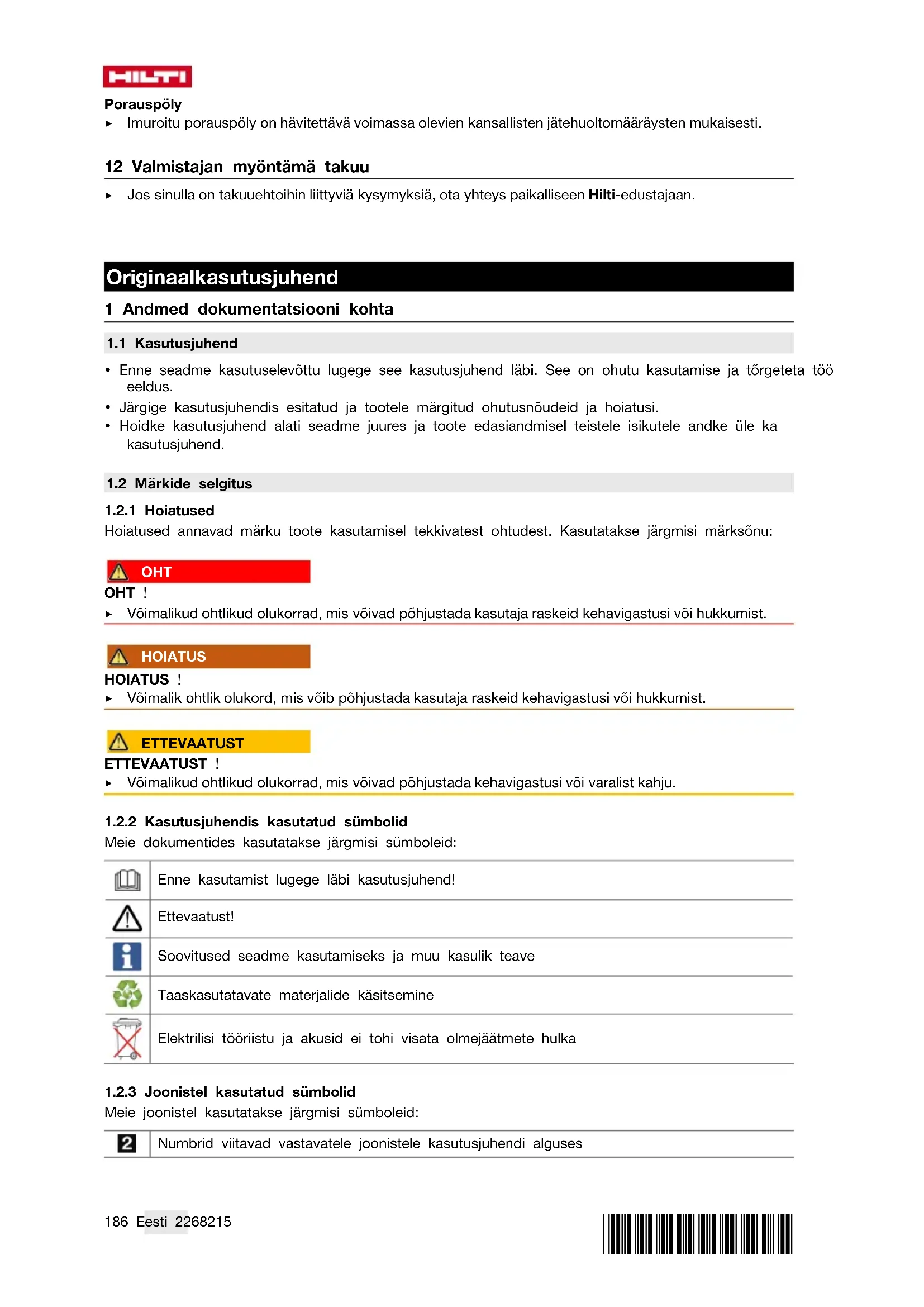 Hoiatused annavad märku toote kasutamisel tekkivatest ohtudest. Kasutatakse järgmisi märksõnu: OHT OHT ! ▶ Võimalikud ohtlikud olukorrad, mis võivad põhjustada kasutaja raskeid kehavigastusi või hukkumist. HOIATUS HOIATUS ! ▶ Võimalik ohtlik olukord, mis võib põhjustada kasutaja raskeid kehavigastusi või hukkumist. ETTEVAATUST ETTEVAATUST ! ▶ Võimalikud ohtlikud olukorrad, mis võivad põhjustada kehavigastusi või varalist kahju.