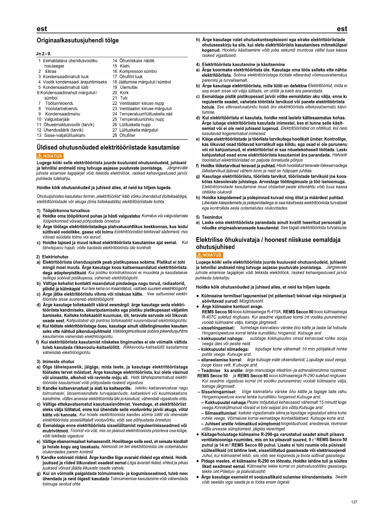 Kontrollige regulaarselt kondensaadi nõuetekohast ärajuhtimist. Pikemate tööpauside ajaks lülitage seade välja, lahutage toitepistik vooluvõrgust ja vajaduse korral eemaldage kõik voolikud. Elektriliste seadmete järelevalveta kasutamisega kaasneb ainelise kahju ja/või kehavigastuste oht. ● Lapsed ja piiratud kehaliste või vaimsete võimete või tajuhäiretega inimesed ning kõik, kellel puuduvad piisavad kogemused ja teadmised, võivad seda elektrilist seadet kasutada üksnes vastutava isiku järelevalve all ja juhen- damisel. Vastasel juhul riskite väärkasutuse ja vigastustega. ● Andke elektriline seade üksnes seda kasutama õpetatud inimeste kätte. Noorukid tohivad elektrilise seadmega töötada ainult siis, kui nad on üle 16 aasta vanad, töö on vajalik nende väljaõppeks ja nad on spetsialisti järelevalve all. ● Kontrollige regulaarselt elektrilise seadme toitejuhtme ja pikendusjuhtmete korrasolekut. Laske need vigastuste korral asjatundjal või volitatud lepingulises REMSi hooldustöökojas välja vahetada. ● Kasutage ainult lubatud ja vastavalt tähistatud, piisava suurusega ristlõikega pikendusjuhtmeid. Kasutage pikendusjuhtmeid pikkusega kuni 10 m juhtme ristlõikega 1,5 mm² ja pikendusjuhtmeid pikk usega 10–30 m juhtme ristlõikega 2,5 mm². Sümbolite tähendused HOIATUS HOIATUS Keskmise riskiastmega ohtlikkus, eiramine võib põhjustada surma või tõsiseid (pöördumatud) vigastusi. ETTEVAATUST ETTEVAATUST Madala riskiastmega ohtlikkus, eiramine võib põhjustada mõõduka raskusega (pöörduvad) vigastusi. TEATIS TEATIS Varakahju, ei ole ohutusnõue! Vigastamise oht välistatud.