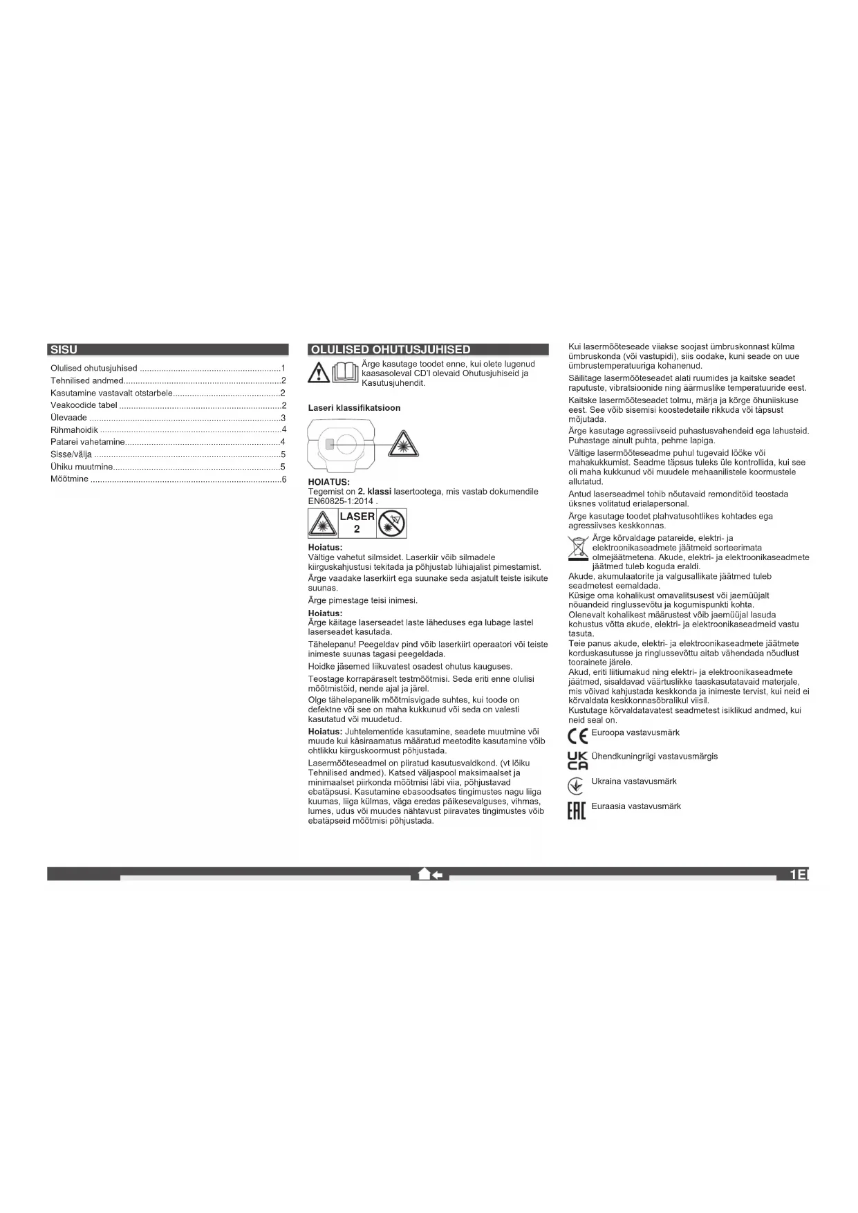 Hoiatus: Vältige vahetut silmsidet. Laserkiir võib silmadele kiirguskahjustusi tekitada ja põhjustab lühiajalist pimestamist. Ärge vaadake laserkiirt ega suunake seda asjatult teiste isikute suunas. Ärge pimestage teisi inimesi. Hoiatus: Ärge käitage laserseadet laste läheduses ega lubage lastel laserseadet kasutada. Tähelepanu! Peegeldav pind võib laserkiirt operaatori või teiste inimeste suunas tagasi peegeldada. Hoidke jäsemed liikuvatest osadest ohutus kauguses. Teostage korrapäraselt testmõõtmisi. Seda eriti enne olulisi mõõtmistöid, nende ajal ja järel. Olge tähelepanelik mõõtmisvigade suhtes, kui toode on defektne või see on maha kukkunud või seda on valesti kasutatud või muudetud. Hoiatus: Juhtelementide kasutamine, seadete muutmine või muude kui käsiraamatus määratud meetodite kasutamine võib ohtlikku kiirguskoormust põhjustada. Lasermõõteseadmel on piiratud kasutusvaldkond. (vt lõiku Tehnilised andmed). Katsed väljaspool maksimaalset ja minimaalset piirkonda mõõtmisi läbi viia, põhjustavad ebatäpsusi. Kasutamine ebasoodsates tingimustes nagu liiga kuumas, liiga külmas, väga eredas päikesevalguses, vihmas, lumes, udus või muudes nähtavust piiravates tingimustes võib ebatäpseid mõõtmisi põhjustada. Kui lasermõõteseade viiakse soojast ümbruskonnast külma ümbruskonda (või vastupidi), siis oodake, kuni seade on uue ümbrustemperatuuriga kohanenud. Säilitage lasermõõteseadet alati ruumides ja kaitske seadet raputuste, vibratsioonide ning äärmuslike temperatuuride eest. Kaitske lasermõõteseadet tolmu, märja ja kõrge õhuniiskuse eest. See võib sisemisi koostedetaile rikkuda või täpsust mõjutada. Ärge kasutage agressiivseid puhastusvahendeid ega lahusteid. Puhastage ainult puhta, pehme lapiga. Vältige lasermõõteseadme puhul tugevaid lööke või mahakukkumist. Seadme täpsus tuleks üle kontrollida, kui see oli maha kukkunud või muudele mehaanilistele koormustele allutatud. Antud laserseadmel tohib nõutavaid remonditöid teostada üksnes volitatud erialapersonal. Ärge kasutage toodet plahvatusohtlikes kohtades ega agressiivses keskkonnas. Ärge kõrvaldage patareide, elektri- ja elektroonikaseadmete jäätmeid sorteerimata olmejäätmetena. Akude, elektri- ja elektroonikaseadmete jäätmed tuleb koguda eraldi. Akude, akumulaatorite ja valgusallikate jäätmed tuleb seadmetest eemaldada. Küsige oma kohalikust omavalitsusest või jaemüüjalt nõuandeid ringlussevõtu ja kogumispunkti kohta. Olenevalt kohalikest määrustest võib jaemüüjal lasuda kohustus võtta akude, elektri- ja elektroonikaseadmeid vastu tasuta. Teie panus akude, elektri- ja elektroonikaseadmete jäätmete korduskasutusse ja ringlussevõttu aitab vähendada nõudlust toorainete järele. Akud, eriti liitiumakud ning elektri- ja elektroonikaseadmete jäätmed, sisaldavad väärtuslikke taaskasutatavaid materjale, mis võivad kahjustada keskkonda ja inimeste tervist, kui neid ei kõrvaldata keskkonnasõbralikul viisil. Kustutage kõrvaldatavatest seadmetest isiklikud andmed, kui neid seal on. Euroopa vastavusmärk Ühendkuningriigi vastavusmärgis Ukraina vastavusmärk Euraasia vastavusmärk SISU Olulised ohutusjuhised ...........................................................1 Tehnilised andmed..................................................................2 Kasutamine vastavalt otstarbele.............................................2 Veakoodide tabel