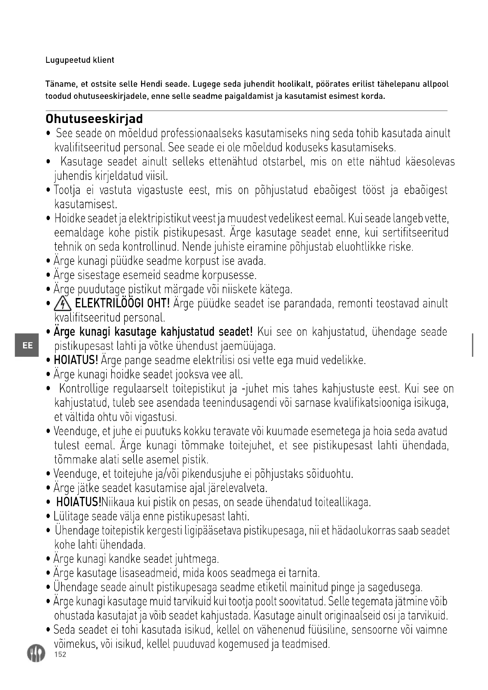 Lugupeetud klient Täname, et ostsite selle Hendi seade. Lugege seda juhendit hoolikalt, pöörates erilist tähelepanu allpool toodud ohutuseeskirjadele, enne selle seadme paigaldamist ja kasutamist esimest korda. Ohutuseeskirjad