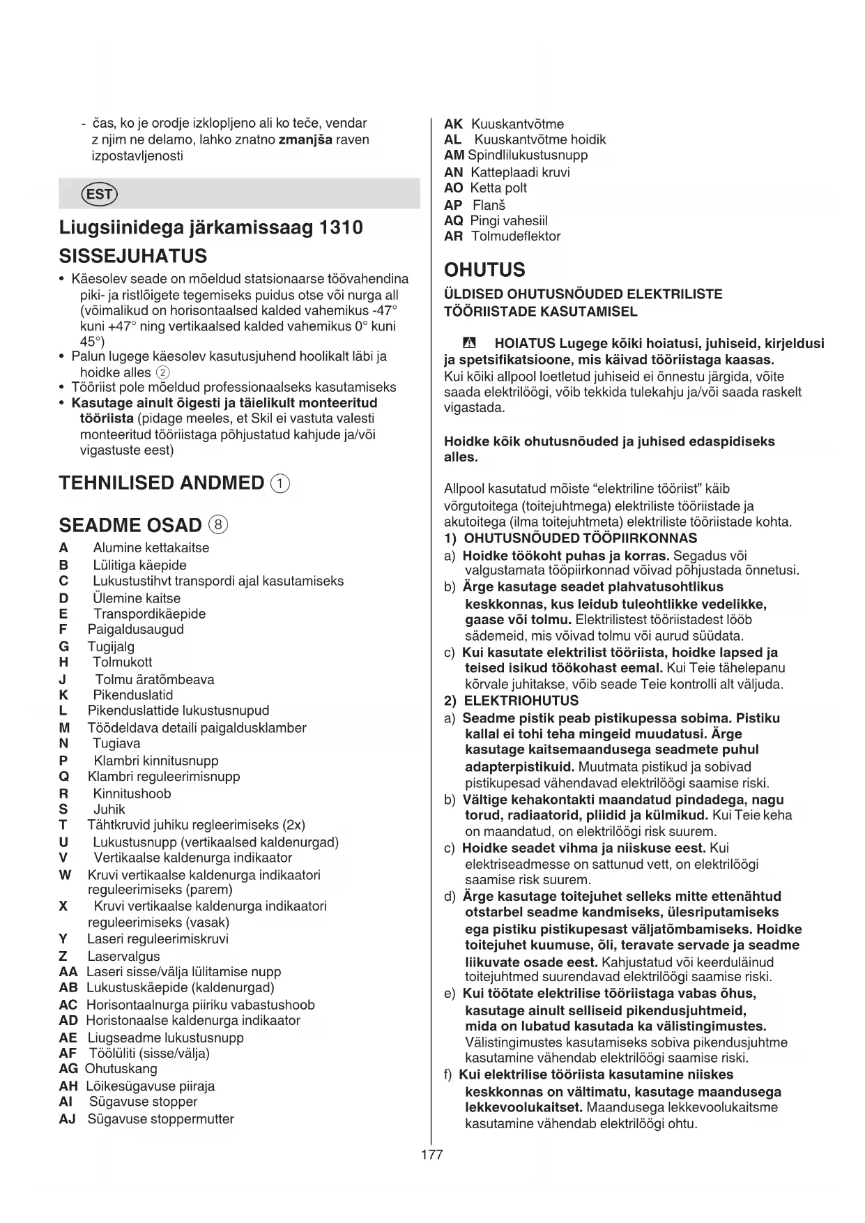 A Alumine kettakaitse B Lülitiga käepide C Lukustustihvt transpordi ajal kasutamiseks D Ülemine kaitse E Transpordikäepide F Paigaldusaugud G Tugijalg H Tolmukott J Tolmu äratõmbeava K Pikenduslatid L Pikenduslattide lukustusnupud M Töödeldava detaili paigaldusklamber N Tugiava P Klambri kinnitusnupp Q Klambri reguleerimisnupp R Kinnitushoob S Juhik T Tähtkruvid juhiku regleerimiseks (2x) U Lukustusnupp (vertikaalsed kaldenurgad) V Vertikaalse kaldenurga indikaator W Kruvi vertikaalse kaldenurga indikaatori reguleerimiseks (parem) X Kruvi vertikaalse kaldenurga indikaatori reguleerimiseks (vasak) Y Laseri reguleerimiskruvi Z Laservalgus AA Laseri sisse/välja lülitamise nupp AB Lukustuskäepide (kaldenurgad) AC Horisontaalnurga piiriku vabastushoob AD Horistonaalse kaldenurga indikaator AE Liugseadme lukustusnupp AF Töölüliti (sisse/välja) AG Ohutuskang AH Lõikesügavuse piiraja AI Sügavuse stopper AJ Sügavuse stoppermutter178 määral kahjustatud, et võiksid mõjutada seadme töökindlust. Laske kahjustatud osad enne seadme kasutamist parandada. Paljude õnnetuste põhjuseks on halvasti hooldatud elektrilised tööriistad. f) Hoidke lõiketarvikud teravad ja puhtad. Hoolikalt hoitud, teravate lõikeservadega lõiketarvikud kiilduvad harvemini kinni ja neid on lihtsam juhtida. g) Kasutage elektrilist tööriista, lisavarustust, tarvikuid jne vastavalt siintoodud juhistele. Arvestage seejuures töötingimuste ja teostatava töö iseloomuga. Elektriliste tööriistade kasutamine mitte ettenähtud otstarbel võib põhjustada ohtlikke olukordi. h) Hoidke käepidemed ja haardepinnad kuiva ja puhtana ning vabana õlist ja määrdeainetest. Libedad käepidemed ja haardepinnad ei luba tööriista ohutult käsitseda ja ootamatutes olukordades kontrolli all hoida.