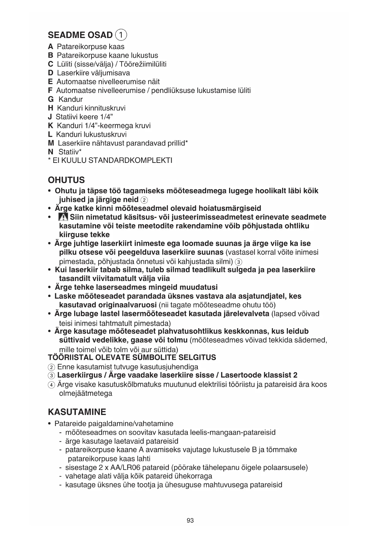 - Hoidke need juhised hoolikalt alles ja mõõteseadme edasiandmisel pange kaasa ka juhised TEHNILISED ANDMED Tööpiirkond kuni ca 10 m Nivelleerumistäpsus ±0,5 mm/m Automaatne loodimispiirkond ± 4° Nivelleerimisaeg ≥6 s Töötemperatuur +5°C kuni +40°C Säilitustemperatuur -20°C kuni +70°C Suhteline niiskus (max) 90% Laseri klass 2 Laseri tüüp 650 nm, <1 mW Statiivi keere 1/4” Patareid (kaasas) 2 x AA (LR6) 1,5V Tööaeg (ca) ≤15 tundi Kaal 0,3 kg Mõõtmed (pikkus x laius x kõrgus) 75 x 63 x 83,5 mm93 SEADME OSAD 1 A Patareikorpuse kaas B Patareikorpuse kaane lukustus C Lüliti (sisse/välja) / Töörežiimilüliti D Laserkiire väljumisava E Automaatse nivelleerumise näit F Automaatse nivelleerumise / pendliüksuse lukustamise lüliti G Kandur H Kanduri kinnituskruvi J Statiivi keere 1/4” K Kanduri 1/4”-keermega kruvi L Kanduri lukustuskruvi M Laserkiire nähtavust parandavad prillid* N Statiiv*