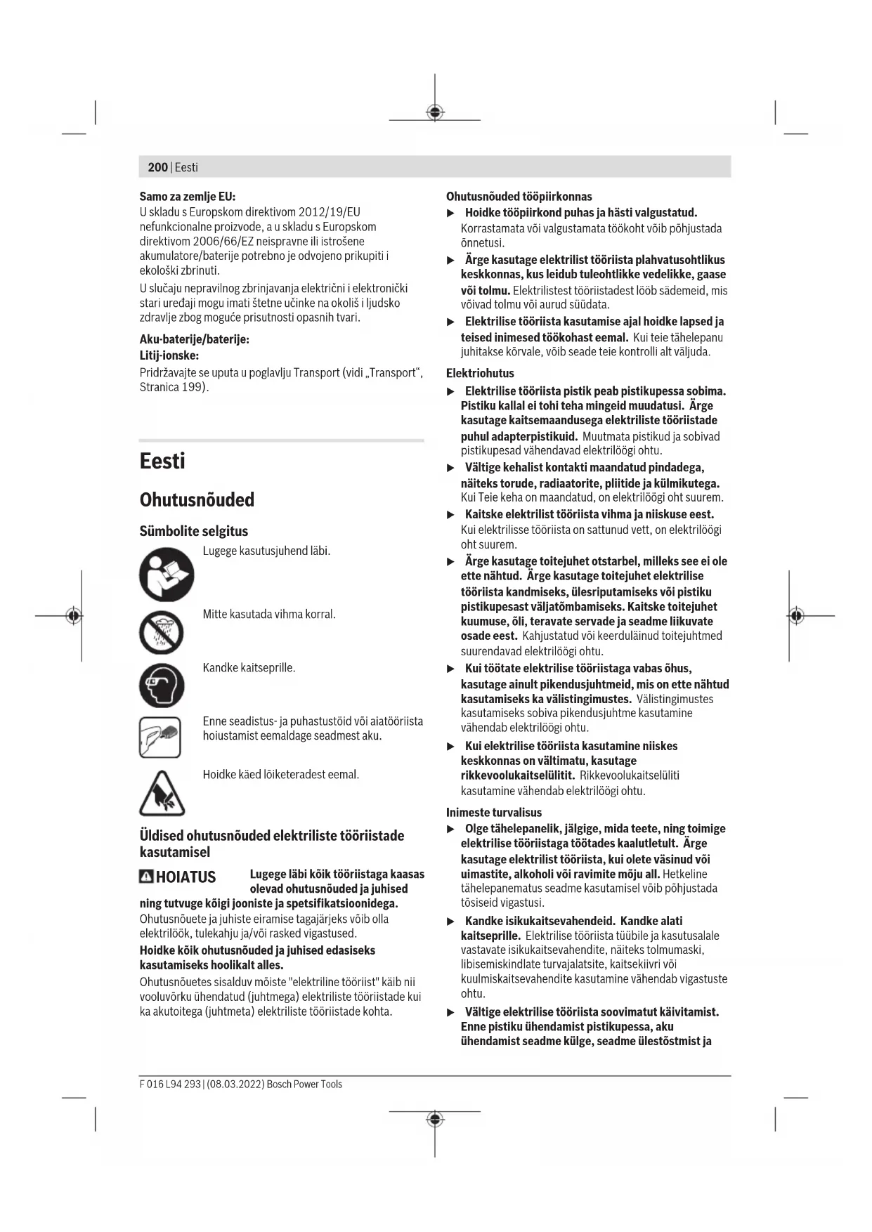 ja hoiustamisel °C -10 … +40 Bosch Power Tools F 016 L94 293 | (08.03.2022)204 | Eesti Akuga hekikäärid AdvancedHedgeCut 36V-65-28 Akutüüp GBA 36V 2,0 Ah, 4,0 Ah A) Sõltuvalt kasutatud akust B) Piiratud võimsus temperatuuril <0°C. Müra-/vibratsiooniväärtused Mürataseme väärtused on mõõdetud vastavalt EN 62841-4-2:2019 . Elektritööriista A-korrigeeritud müratase on üldjuhul: 75 dB(A); helivõimsustase 95 dB(A). Mõõtemääramatus K= 2,0dB. Kandke kuulmiskaitset! Vibratsioonitase a