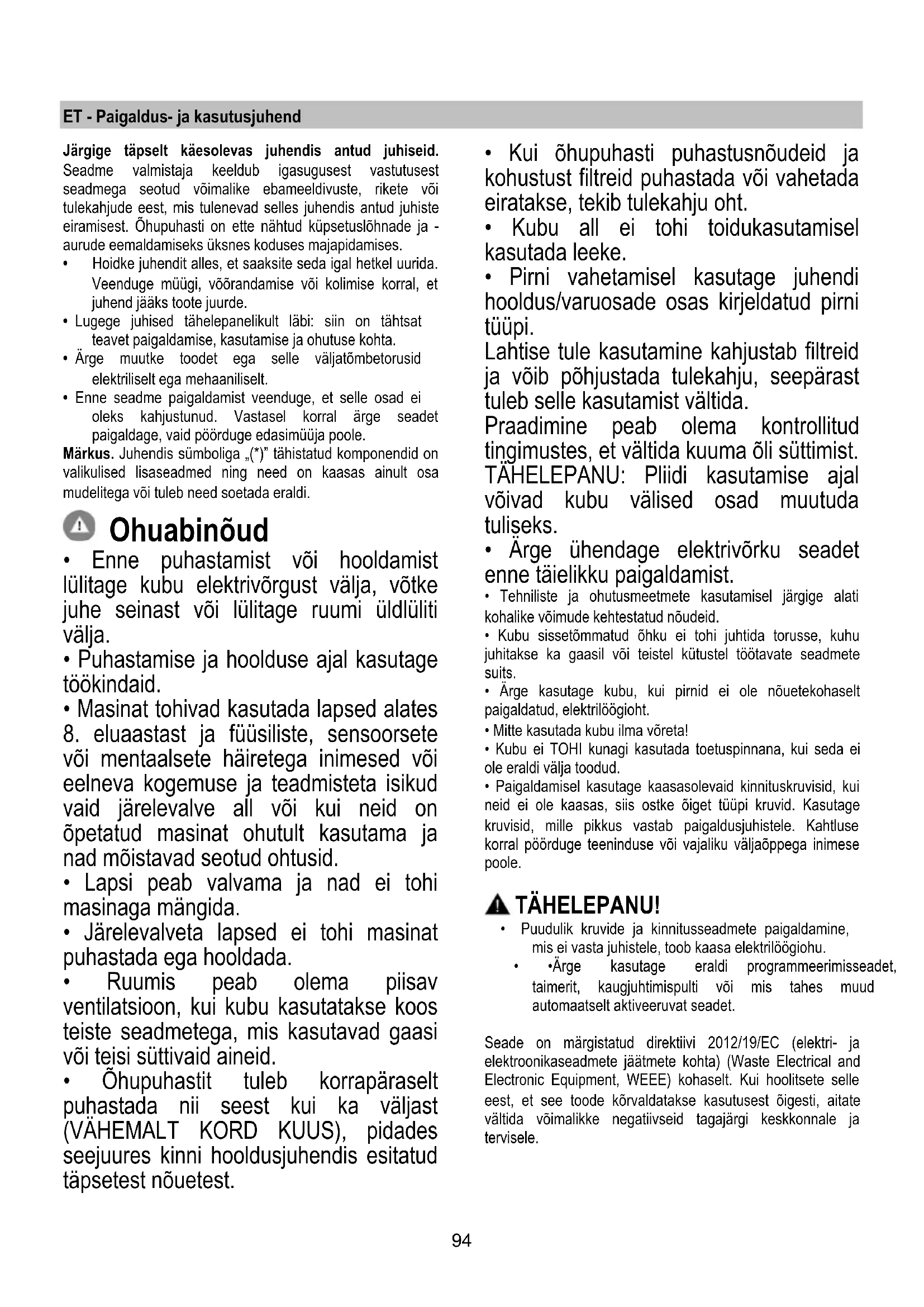 - Kui õhupuhasti puhastusnõudeid ja kohustust filtreid puhastada või vahetada eiratakse, tekib tulekahju oht.