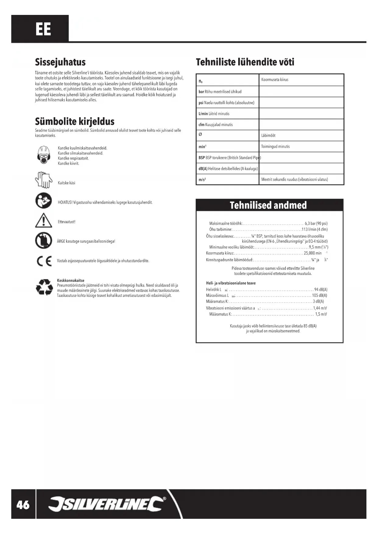 Sümbolite kirjeldus Seadme tüübimärgisel on sümbolid. Sümbolid annavad olulist teavet toote kohta või juhiseid selle kasutamiseks.Kandke kuulmiskaitsevahendeid. Kandke silmakaitsevahendeid. Kandke respiraatorit. Kandke kiivrit.Kaitske käsiHOIATUS!Vigastusohuvähendamisekslugegekasutusjuhendit.Ettevaatust!ÄRGE kasutage surugaasiballoonidega!Vastab asjassepuutuvatele õigusaktidele ja ohutusstandardite.Keskkonnakaitse Pneumotööriistade jäätmeid ei tohi visata olmeprügi hulka. Need sisaldavad õli ja muude määrdeainete jälgi. Suunake elektriseadmed vastavas kohas taaskasutusse. Taaskasutuse kohta küsige teavet kohalikust ametiasutusest või edasimüüjalt. Sissejuhatus Täname et ostsite selle Silverline’i tööriista. Käesolev juhend sisaldab teavet, mis on vajalik toote ohutuks ja efektiivseks kasutamiseks. Tootel on ainulaadseid funktsioone ja isegi juhul, kui olete sarnaste toodetega tuttav, on vaja käesolev juhend tähelepanelikult läbi lugeda selle tagamiseks, et juhistest täielikult aru saate. Veenduge, et kõik tööriista kasutajad on lugenud käesoleva juhendi läbi ja sellest täielikult aru saanud. Hoidke kõik hoiatused ja juhised hilisemaks kasutamiseks alles.