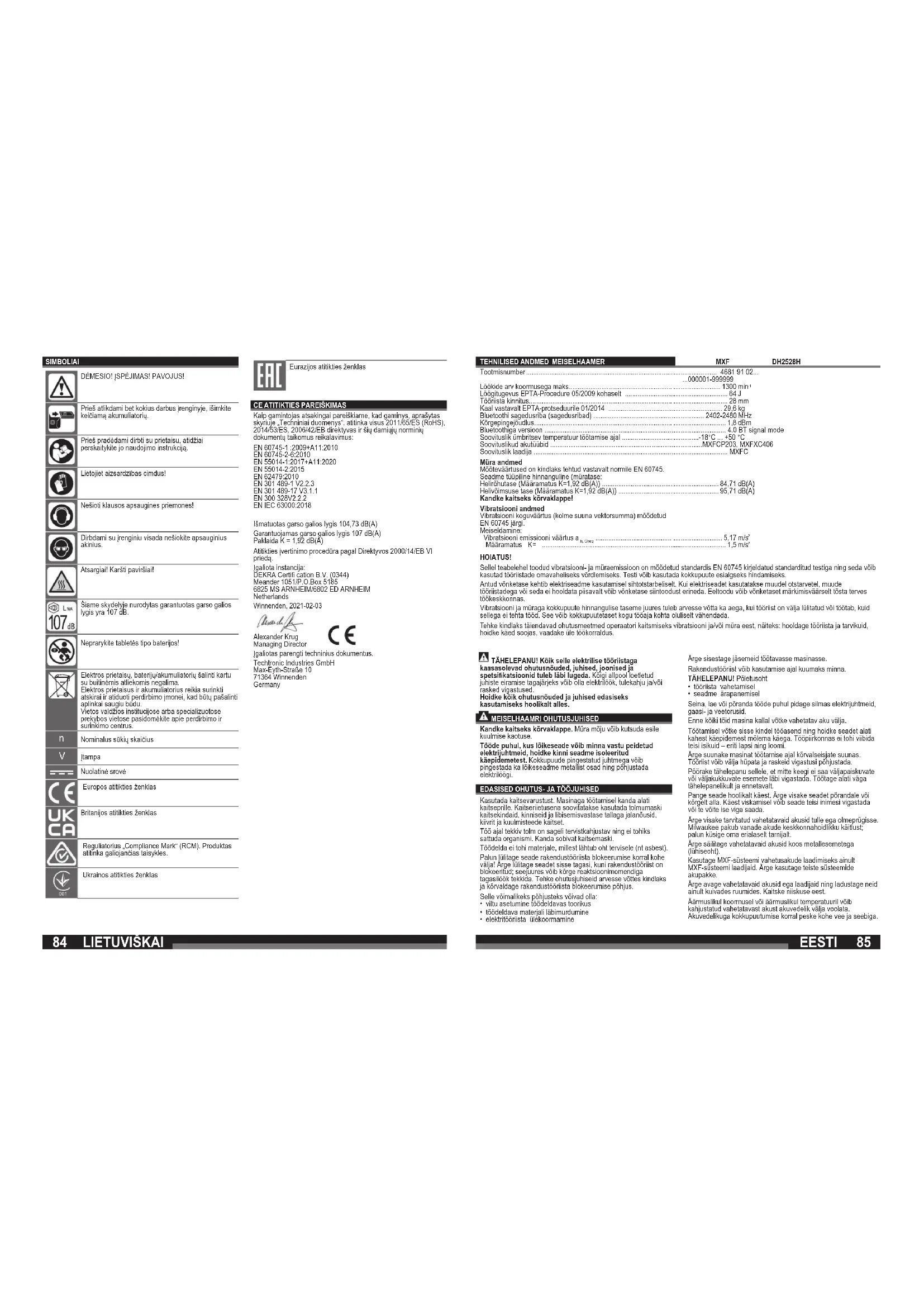 Pinge Alalisvool Euroopa vastavusmärk Ühendkuningriigi vastavusmärk Regulatory Compliance Mark (RCM). Toode vastab kehtivatele eeskirjadele. Ukraina vastavusmärk Euraasia vastavusmärk EÜ VASTAVUSAVALDUS Kinnitame tootjana ainuisikuliselt vastutades, et jaotises „Tehnilised andmed“ kirjeldatud toode on kooskõlas ELi direktiivide 2011/65/EU (RohS), 2014/53/EL, 2006/42/EG kõikide asjaomaste eeskirjade ja allpool nimetatud normdokumentidega: EN 60745-1 :2009+A11:2010 EN 60745-2-6:2010 EN 55014-1:2017+A11:2020 EN 55014-2:2015 EN 62479:2010 EN 301 489-1 V2.2.3 EN 301 489-17 V3.1.1 EN 300 328V2.2.2 EN IEC 63000:2018 Mõõdetud müravõimsuse tase 104,73 dB(A) Garanteeritud müravõimsuse tase 107 dB(A) Määramatus K = 1,92 dB(A) Vastavushindamise toiming vastavalt 2000/14/EÜ lisale VI. Teavitatud asutus: DEKRA Certifi cation B.V. (0344) Meander 1051/P.O.Box 5185