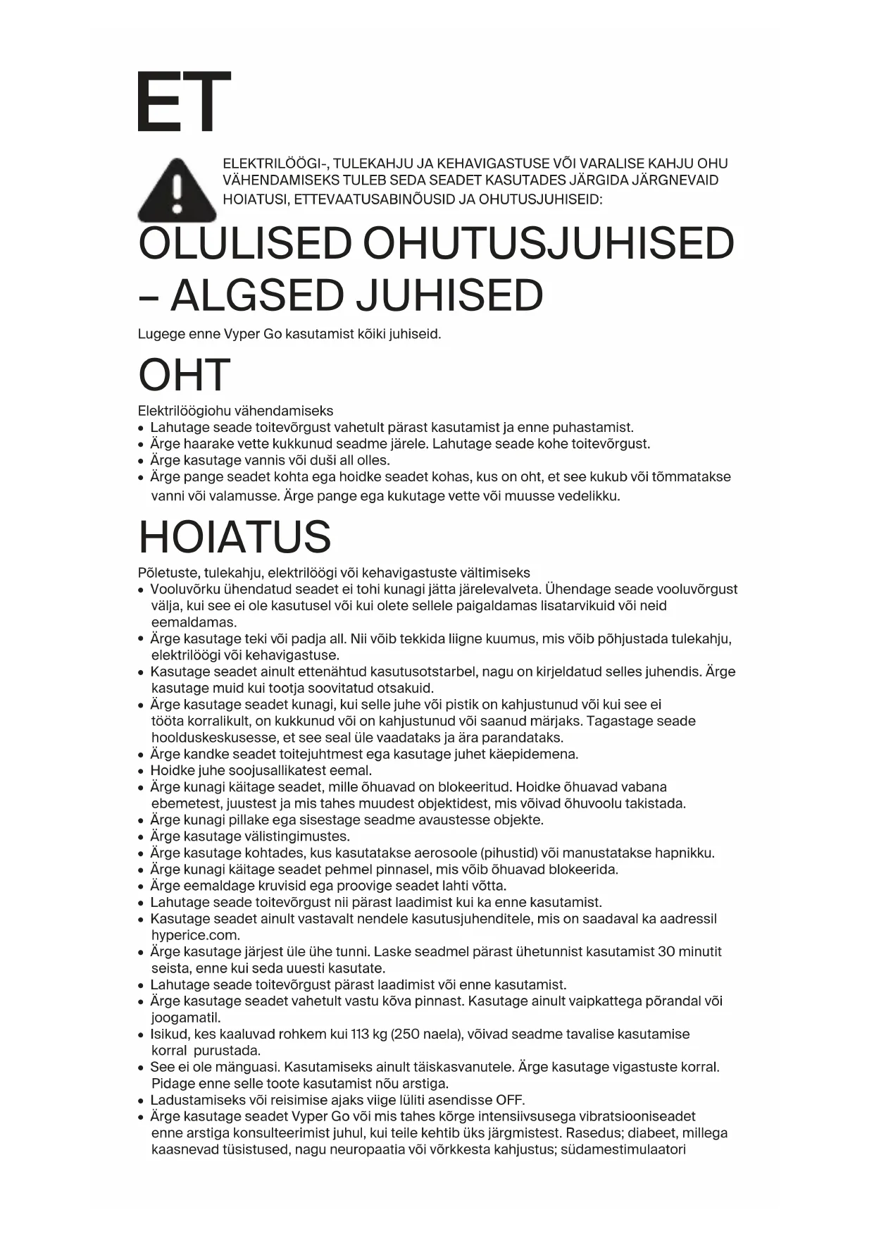- Ärge kasutage seadet Vyper Go või mis tahes kõrge intensiivsusega vibratsiooniseadet enne arstiga konsulteerimist juhul, kui teile kehtib üks järgmistest. Rasedus; diabeet, millega kaasnevad tüsistused, nagu neuropaatia või võrkkesta kahjustus; südamestimulaatorikasutamine; hiljutine operatsioon; epilepsia või migreen; diski väljasopistus; spondülolistees; spondülolüüs või spondüloos; hiljutine liigeseproteesi paigaldus; metallvardad või plaadid; või mõni muu mure oma tervise pärast. Nõrga tervisega inimesed ja lapsed võivad vibratsiooniseadmeid kasutada täiskasvanu järelevalve all. Need vastunäidustused ei tähenda, et te ei saa vibratsioon- või võimlemisseadet kasutada, kuid soovitame teil eelnevalt arstiga konsulteerida. Vibreerivate võimlemisseadmete kasutamise kohta teatud meditsiiniliste seisundite korral tehakse pidevalt uuringuid. Tänu neile lüheneb ülaltoodud vastunäidustuste nimekiri kindlasti. Praktilised kogemused on näidanud, et vibreerivate võimlemisseadmete raviplaani lisamine võib olla mitmetel juhtudel kasulik. Sedatuleb teha arsti, spetsialisti või füsioterapeudi soovitusel. Seadet Vyper Go võib laadida ainult topeltisolatsiooniga, 18 VDC Hyperice’i laaduriga (mudeli number MX24Z2-1801000), mis on seadmega kaasas. Ärge laadige seadet Vyper Go üleöö ega jätke seadet Vyper Go laadimise võikasutamise ajal järelevalveta. Vyper Go sisaldab akut, mida tuleb käidelda ohutul viisil ja viia see nõuetekohasesse elektroonikaseadmete jäätmete kogumiskohta. ETTEVAATUST Seadmes paiknev aku võib vale kasutamise korral põhjustada põletusi või keemilisi põletusi. Seda ei tohi võtta osadeks, kuumutada temperatuurile üle 100 ºC või põletada. Kõrvaldage kasutatud aku kiiresti kasutuselt. Hoida laste käeulatusest eemal. Ärge võtke seda osadeks ega visake seda tulle.