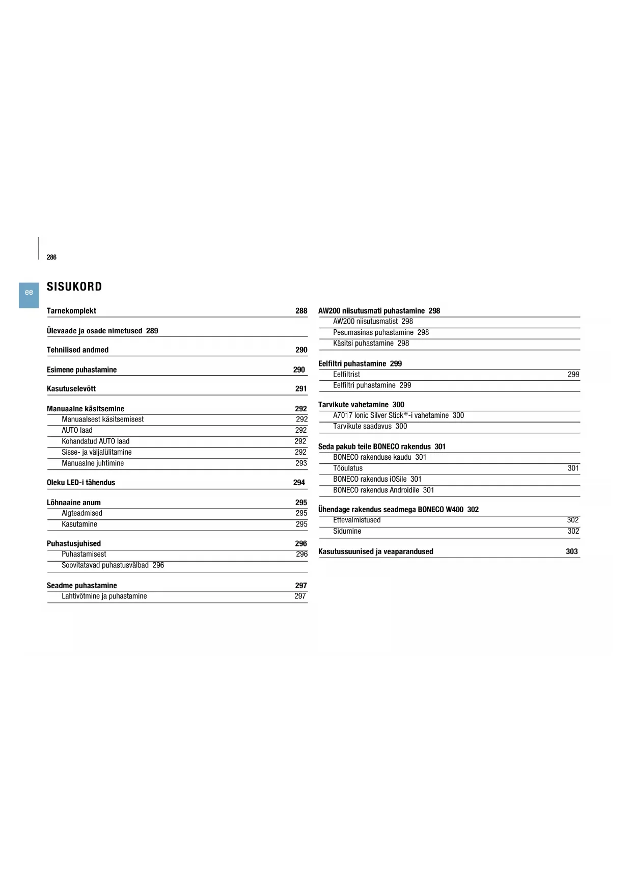 -i vahetamine 300 Tarvikute saadavus 300 Seda pakub teile BONECO rakendus 301 BONECO rakenduse kaudu 301 Tööulatus 301 BONECO rakendus iOSile 301 BONECO rakendus Androidile 301 Ühendage rakendus seadmega BONECO W400 302 Ettevalmistused 302 Sidumine 302 Kasutussuunised ja veaparandused 303 Tarnekomplekt 288 Ülevaade ja osade nimetused 289 Tehnilised andmed 290 Esimene puhastamine 290 Kasutuselevõtt 291 Manuaalne käsitsemine 292 Manuaalsest käsitsemisest 292 AUTO laad 292 Kohandatud AUTO laad 292 Sisse- ja väljalülitamine 292 Manuaalne juhtimine 293 Oleku LED-i tähendus 294 Lõhnaaine anum 295 Algteadmised 295 Kasutamine 295 Puhastusjuhised 296 Puhastamisest 296 Soovitatavad puhastusvälbad 296 Seadme puhastamine 297 Lahtivõtmine ja puhastamine 297 SISUKORDBONECO RAKENDUS Kasutage eeliseid, mida pakub tasuta BONECO rakendus koos paljude kasulike nõuannetegateie BONECO niisutaja kohta. See tagab hügieenilise töö ja parandab siseõhu kvaliteeti. Teie eelised: ■ BONECO Bluetooth-seadmete lisafunktsioonid ■ Tarvikute ja seadmete ostmine veebist ■ Tooteteave ■ Kasutusjuhend ■ Praktiline hoolduskalender ■ … ja palju muud288