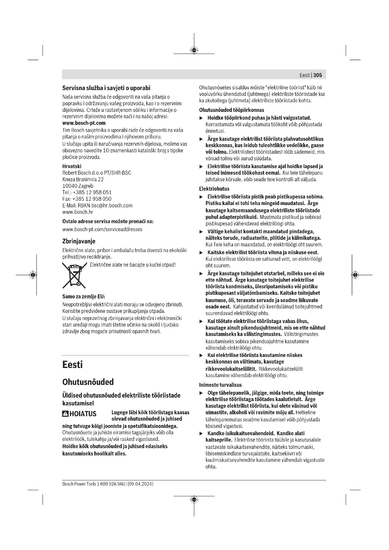 Izvedba prekidača s blokadom Za puštanje električnog alata u rad najprije pritisnite prekidač za uključivanje/isključivanje(3) ➊, zatim ga pomaknite prema naprijed ➋. Zatim ga pritisnite i držite pritisnut ➌. Za blokadu pritisnutog prekidača za uključivanje/ isključivanje(3), prekidač za uključivanje/isključivanje(3) pomaknite dalje prema naprijed ➍. Za isključivanje električnog alata otpustite prekidač za uključivanje/isključivanje(3) odnosno ako je blokiran, pritisnite kratko prekidač za uključivanje/isključivanje(3) i zatim ga otpustite. Izvedba prekidača bez blokade Za puštanje električnog alata u rad najprije pritisnite prekidač za uključivanje/isključivanje(3) ➊, zatim ga pomaknite prema naprijed ➋. Zatim ga pritisnite i držite pritisnut ➌. Za isključivanje električnog alata otpustite prekidač za uključivanje/isključivanje(3). u Prije uporabe provjerite brusne alate. Brusni alat mora biti besprijekorno montiran i mora se moći slobodno okretati. Provedite probni rad od najmanje 1 minute bez opterećenja. Ne koristite oštećene, nezaobljene ili vibrirajuće brusne alate. Oštećeni alati mogu puknuti i uzrokovati ozljede. Održavanje i servisiranje Održavanje i čišćenje u Prije svih radova na električnom alatu izvucite mrežni utikač iz utičnice. u Električni alat i otvore za hlađenje održavajte čistima kako bi se moglo dobro i sigurno raditi. u Kod ekstremnih uvjeta po mogućnosti uvijek koristite stacionarni uređaj za usisavanje. Često ispuhavajte otvore za hlađenje i predspojite zaštitnu strujnu sklopku (PRCD). Kod obrade metala vodljiva prašina se može nakupiti unutar električnog alata. To može negativno utjecati na zaštitnu izolaciju električnog alata. Pažljivo uskladištite i postupajte s priborom. Ako je potrebna zamjena priključnog kabela, tada je treba provesti u Bosch servisu ili u ovlaštenom servisu za Bosch električne alate kako bi se izbjeglo ugrožavanje sigurnosti. 1 609 92A 9AU | (09.04.2024) Bosch Power ToolsEesti | 305 Servisna služba i savjeti o uporabi Naša servisna služba će odgovoriti na vaša pitanja o popravku i održavanju vašeg proizvoda, kao i o rezervnim dijelovima. Crteže u rastavljenom obliku i informacije o rezervnim dijelovima možete naći i na našoj adresi: www.bosch-pt.com Tim Bosch savjetnika o uporabi rado će odgovoriti na vaša pitanja o našim proizvodima i njihovom priboru. U slučaju upita ili naručivanja rezervnih dijelova, molimo vas obavezno navedite 10‑znamenkasti kataloški broj s tipske pločice proizvoda. Hrvatski Robert Bosch d.o.o PT/SHR-BSC Kneza Branimira 22 10040 Zagreb Tel.: +385 12 958 051 Fax: +385 12 958 050 E-Mail: RBKN-bsc@hr.bosch.com www.bosch.hr Ostale adrese servisa možete pronaći na: www.bosch-pt.com/serviceaddresses Zbrinjavanje Električne alate, pribor i ambalažu treba dovesti na ekološki prihvatljivo recikliranje. Električne alate ne bacajte u kućni otpad! Samo za zemljeEU: Neupotrebljivi električni alati moraju se odvojeno zbrinuti. Koristite predviđene sustave prikupljanja otpada. U slučaju nepravilnog zbrinjavanja električni i elektronički stari uređaji mogu imati štetne učinke na okoliš i ljudsko zdravlje zbog moguće prisutnosti opasnih tvari. Eesti Ohutusnõuded Üldised ohutusnõuded elektriliste tööriistade kasutamisel HOIATUS Lugege läbi kõik tööriistaga kaasas olevad ohutusnõuded ja juhised ning tutvuge kõigi jooniste ja spetsifikatsioonidega. Ohutusnõuete ja juhiste eiramise tagajärjeks võib olla elektrilöök, tulekahju ja/või rasked vigastused. Hoidke kõik ohutusnõuded ja juhised edasiseks kasutamiseks hoolikalt alles. Ohutusnõuetes sisalduv mõiste "elektriline tööriist" käib nii vooluvõrku ühendatud (juhtmega) elektriliste tööriistade kui ka akutoitega (juhtmeta) elektriliste tööriistade kohta. Ohutusnõuded tööpiirkonnas u Hoidke tööpiirkond puhas ja hästi valgustatud. Korrastamata või valgustamata töökoht võib põhjustada õnnetusi. u Ärge kasutage elektrilist tööriista plahvatusohtlikus keskkonnas, kus leidub tuleohtlikke vedelikke, gaase või tolmu. Elektrilistest tööriistadest lööb sädemeid, mis võivad tolmu või aurud süüdata. u Elektrilise tööriista kasutamise ajal hoidke lapsed ja teised inimesed töökohast eemal. Kui teie tähelepanu juhitakse kõrvale, võib seade teie kontrolli alt väljuda. Elektriohutus u Elektrilise tööriista pistik peab pistikupessa sobima. Pistiku kallal ei tohi teha mingeid muudatusi. Ärge kasutage kaitsemaandusega elektriliste tööriistade puhul adapterpistikuid. Muutmata pistikud ja sobivad pistikupesad vähendavad elektrilöögi ohtu. u Vältige kehalist kontakti maandatud pindadega, näiteks torude, radiaatorite, pliitide ja külmikutega. Kui Teie keha on maandatud, on elektrilöögi oht suurem. u Kaitske elektrilist tööriista vihma ja niiskuse eest. Kuielektrilisse tööriista on sattunud vett, on elektrilöögi oht suurem. u Ärge kasutage toitejuhet otstarbel, milleks see ei ole ette nähtud. Ärge kasutage toitejuhet elektrilise tööriista kandmiseks, ülesriputamiseks või pistiku pistikupesast väljatõmbamiseks. Kaitske toitejuhet kuumuse, õli, teravate servade ja seadme liikuvate osade eest. Kahjustatud või keerduläinud toitejuhtmed suurendavad elektrilöögi ohtu. u Kui töötate elektrilise tööriistaga vabas õhus, kasutage ainult pikendusjuhtmeid, mis on ette nähtud kasutamiseks ka välistingimustes. Välistingimustes kasutamiseks sobiva pikendusjuhtme kasutamine vähendab elektrilöögi ohtu. u Kui elektrilise tööriista kasutamine niiskes keskkonnas on vältimatu, kasutage rikkevoolukaitselülitit. Rikkevoolukaitselüliti kasutamine vähendab elektrilöögi ohtu. Inimeste turvalisus u Olge tähelepanelik, jälgige, mida teete, ning toimige elektrilise tööriistaga töötades kaalutletult. Ärge kasutage elektrilist tööriista, kui olete väsinud või uimastite, alkoholi või ravimite mõju al