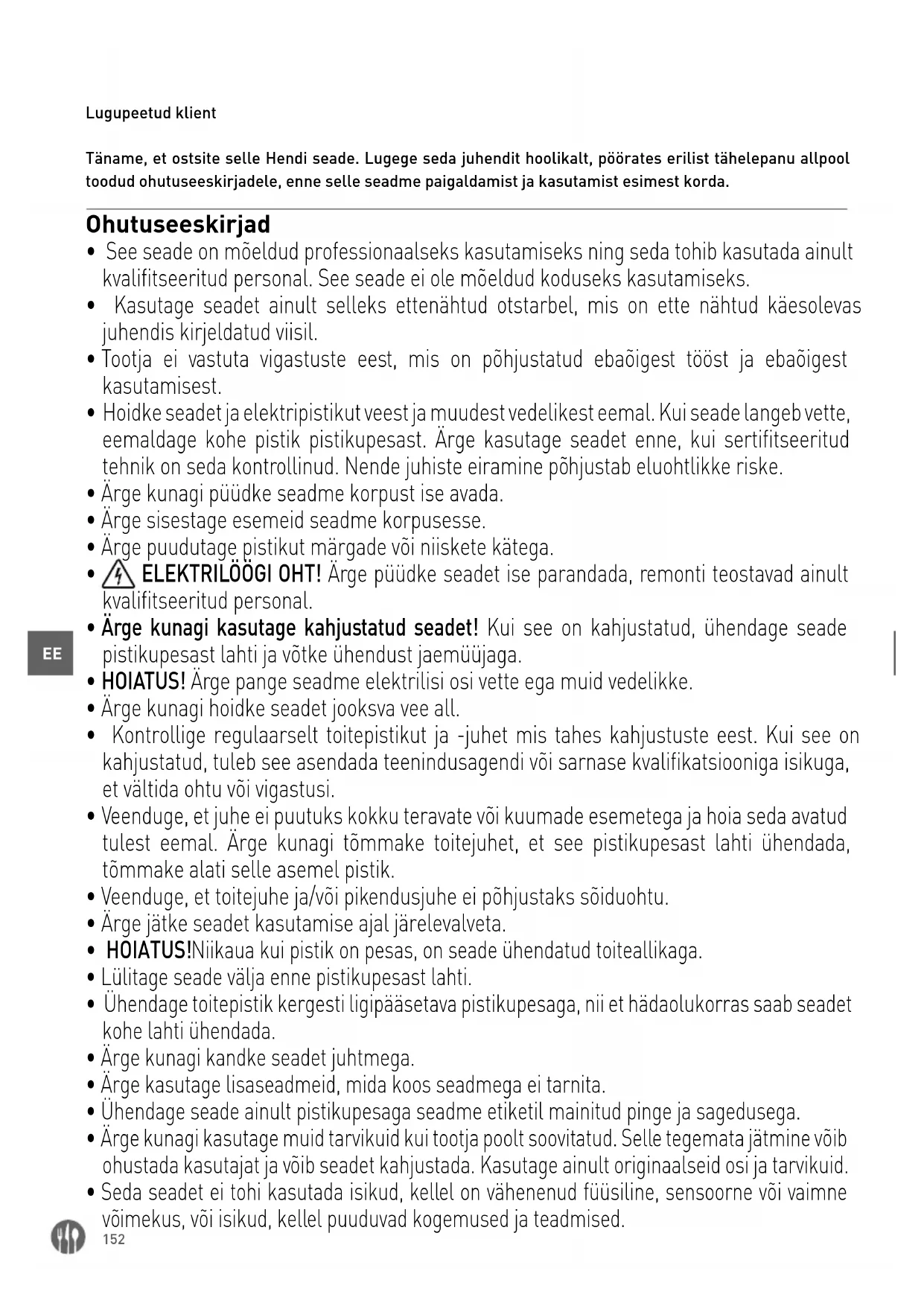 Lugupeetud klient Täname, et ostsite selle Hendi seade. Lugege seda juhendit hoolikalt, pöörates erilist tähelepanu allpool toodud ohutuseeskirjadele, enne selle seadme paigaldamist ja kasutamist esimest korda. Ohutuseeskirjad