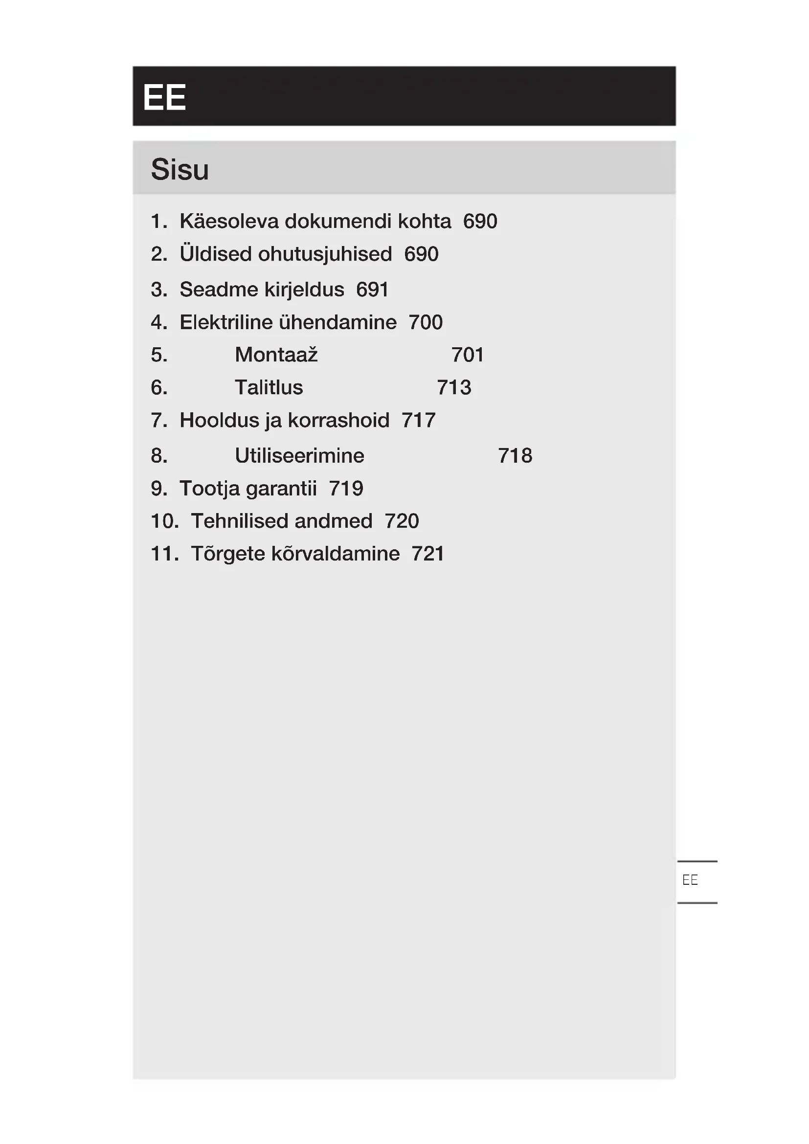 - Hoidke kättesaadavas kohas. – Elektrivooluga ümberkäimine võib tuua kaasa ohtlikke olukordi. Elektrit juhtivate osade puudutamine võib põhjustada elektrilööki, põletusi või surma. – Võrgupingel töid tohivad teha ainult kvalifitseeritud spetsialistid. – Tuleb järgida riigisiseseid installatsioonieeskirju ja ühendamistingimusi (nt VDE 0100, AT : ÖVE-ÖNORM E8001-1, CH:SEV 1000). – Kasutage ainult originaalvaruosi. – Parandustöid tohivad teha ainult spetsialistid.EE – 691 – Sisu