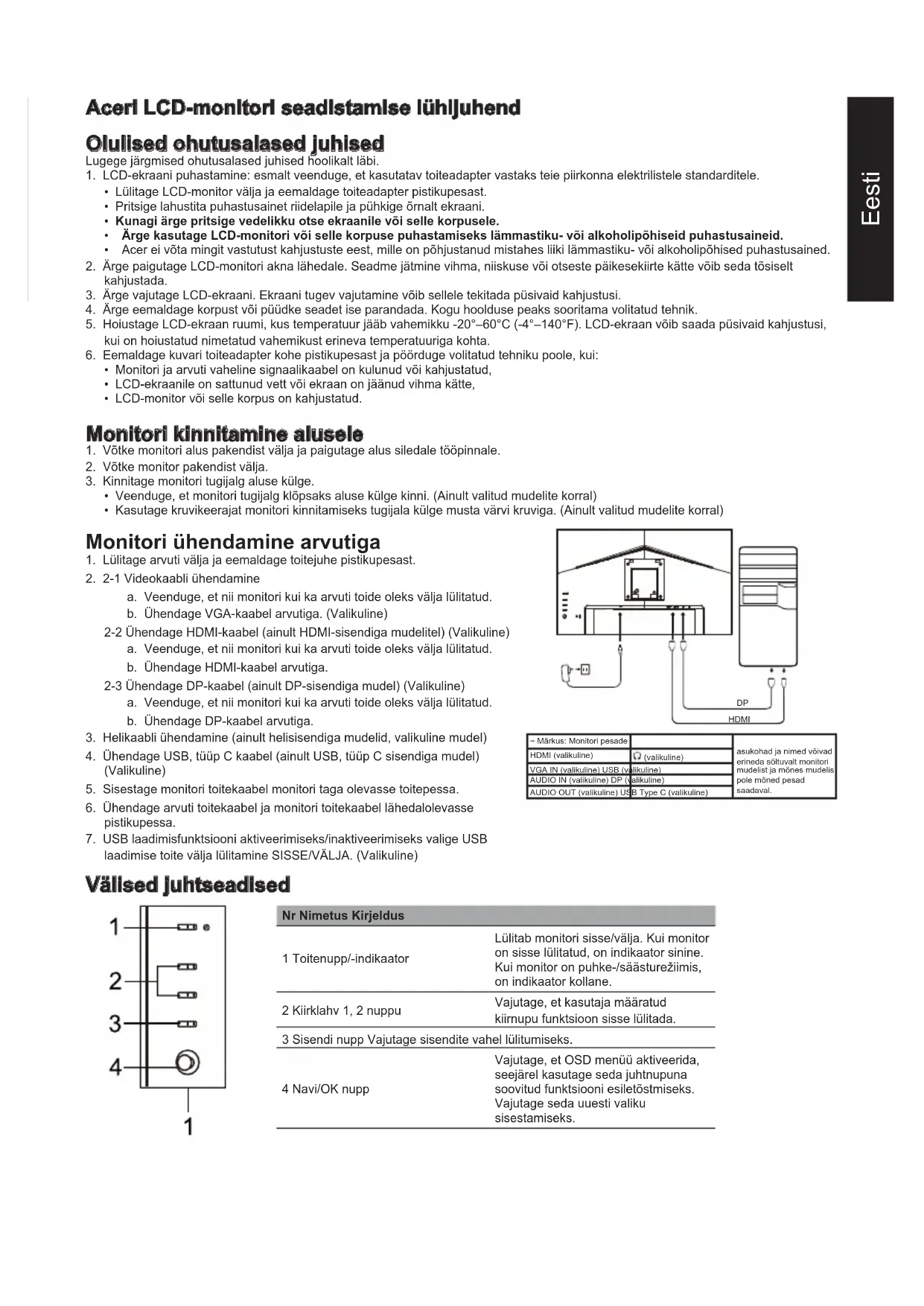 (tavaline) Kontrastsus Max 100000000:1 (ACM) Vaatenurk 178° (H) 178° (V) (CR = 10) Reaktsiooniaeg 1 ms (VRB) Paneeli tüüp VA Horisontaalsagedus HDMI: 31,469–192,692 KHz DP: 31,469–192,692 KHz Vertikaalsagedus HDMI: 48–165 Hz DP: 48–165 Hz Värvitäpsus 16,7 miljonit värvi Punkti taktsagedus HDMI: 393,092 MHz DP: 393,092 MHz Max eraldusvõime HDMI: 1920 × 1080, 165 Hz juures DP: 1920 × 1080, 165 Hz juures Automaatselt häälestuv VESA DDCCI / DDC2B Energiatarve Töörežiimis 21 W (tüüpiline) Puhkerežiimis 0,5 W (tüüpiline) Väljalülitatuna 0,3 W (tüüpiline) Sisendpistik HDMI (ainult HDMI-sisendiga mudel, valikuline) DP (ainult DP-sisendiga mudelitel) (valikuline) Video sisendsignaal HDMI (ainult HDMI-sisendiga mudel, valikuline) DP (ainult DP-sisendiga mudelitel) (valikuline) Kõlarid 2 W, 2 tk (ainult helisisendiga mudel, valikuline) Ekraani maksimaalsed mõõtmed Horisontaalne: 527 mm Vertikaalne: 296 mm Toiteallikas SISEND: 100–240 V, vahelduvvool, sagedus 50/60 Hz Ümbritseva keskkonna tingimused Töötemperatuur: 0° kuni 40°C Hoiustamise temperatuur: -20° kuni 60°C Suhteline niiskus: 20% kuni 80% Mõõtmed 540,3 (L) x 375,0-495,0 (K) x 234,0 (S) mm Mass (neto) 4,30 Kg (netomass) Mehhanismi andmed Kallutamine: -5° kuni +25° Pööramine: +/-360° Kõrguse reguleerimine: 120 mm Telje ümber pööramine: +/-90° Eemaldatav tugijalg: Jah Välised juhtseadised Lüliti/nupud Toitenupp Kiirklahv 1 Kiirklahv 2 Sisend Menüü/Navi/OK Funktsioonid Heledus Kontrastsus Madalatasemeline sinine valgus Musta võimendus ACM HDR Üliteravus Gamma Värvitemperatuur Režiimid Värviruumile Hallskaala režiim 6-komponendiline värvitoon 6-komponendiline küllastus Helitugevus Vaigistatud Helimoonutused FreeSync Premium VRB Värskendussageduse väärtus Ülilühikest peiteaega AimPoint-sihik Keel Ekraanilekuvatava teate kestus Läbipaistvus Ekraanikuva lukk Sisend Allika automaatvalimine Lai (dün.) režiim Kiirklahvi määramine DDC/CI HDMI musta tase Kiirkäivitusrežiim Teave Lähtesta kõik sätted Tehnilised andmed erinevad mudeliti ja/või piirkonniti. Aceri toote kasutusjuhend ja muud dokumendid on saadaval Aceri ametlikul veebisaidil.Lietuvių LCD monitoriaus „Acer“ trumpasis sąrankos vadovas Svarbios saugos instrukcijos Atidžiai perskaitykite šias instrukcijas. 1. LCD ekrano valymas: pirmiausia užtikrinkite, kad maitinimo adapteris, kurį naudojate, atitiktų jūsų regiono elektros standartus.
